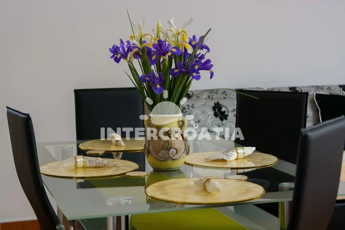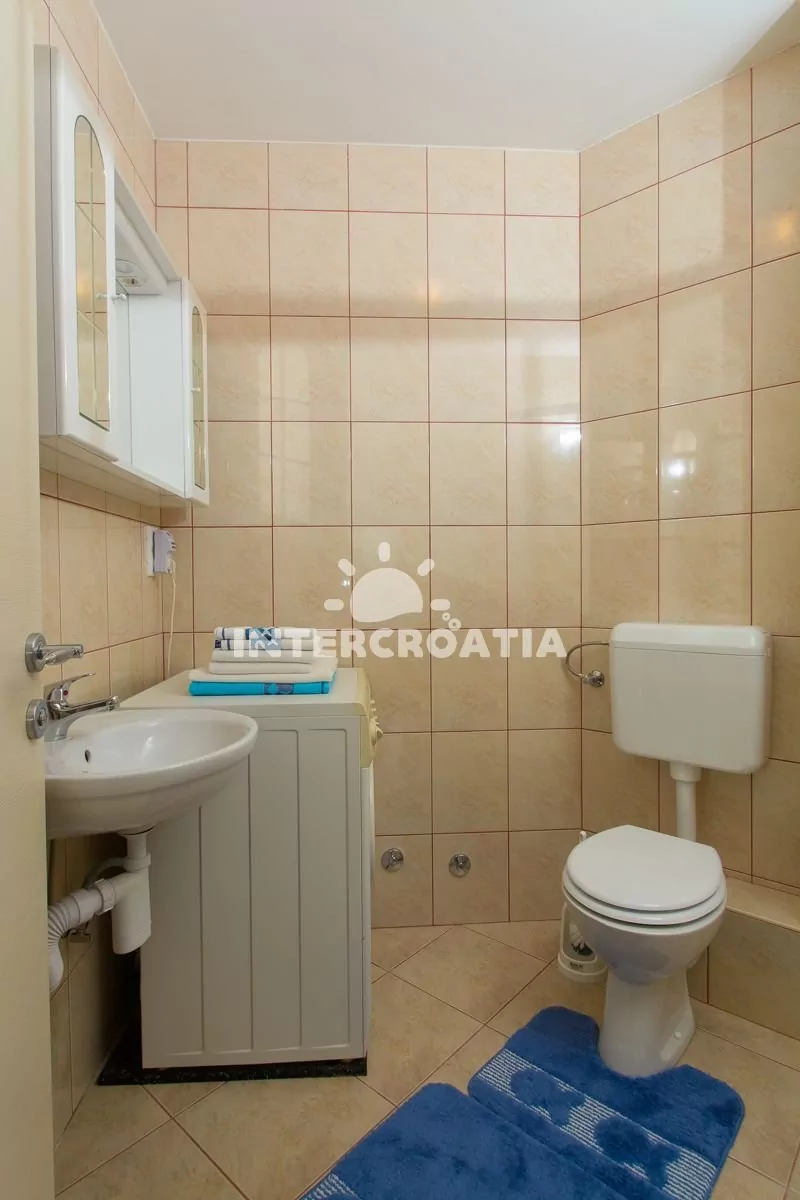 Apartmán (50 m2) s balkonem a výhledem na moře se nachází v 1. patře domu. Apartmán je vhodný pro 2 až 4 osoby. Obývací pokoj je spojený s kuchyní. Kuchyňská linka je vybavena sklokeramickou varnou deskou, digestoří, vestavěnou troubou, rychlovarnou konvicí, mikrovlnnou troubou, kávovarem, nádobím a lednicí s mrazákem. Obývací pokoj s jídelním stolem pro 4 osoby, rohovou pohovkou (rozložitelná na extra lůžko pro 2 osoby), televizí se satelitním programem, klimatizací a vstupem na balkon. Ložnice s jedním dvoulůžkem. Koupelna se sprchovým koutem, umyvadlem, fénem, pračkou a wc. Hostům je k dispozici parkování u objektu zdarma.