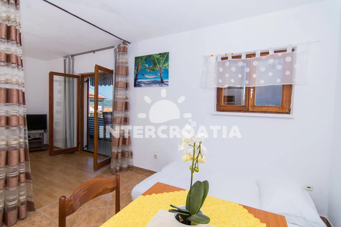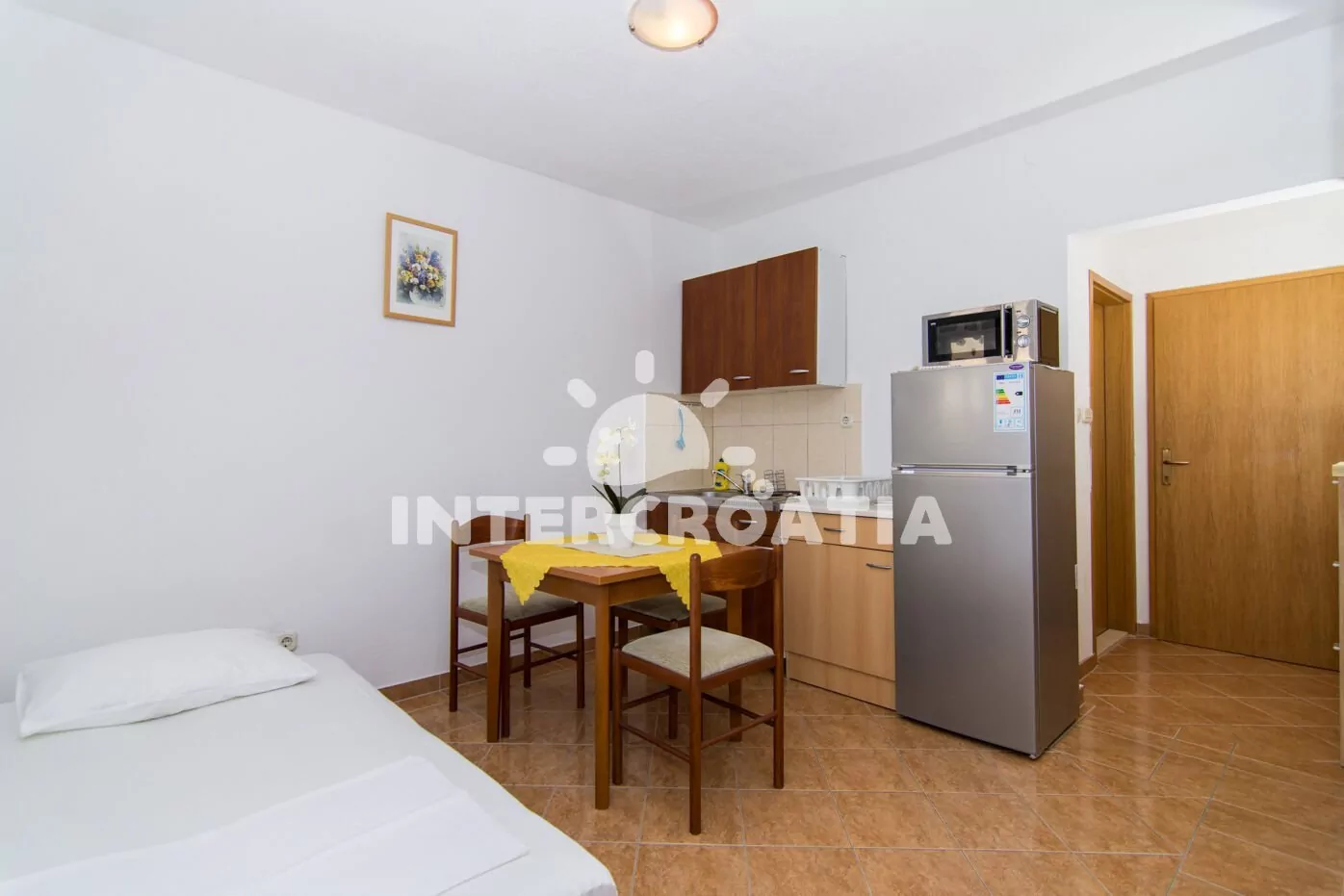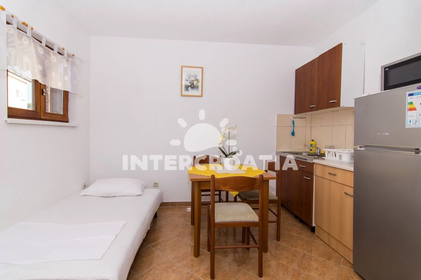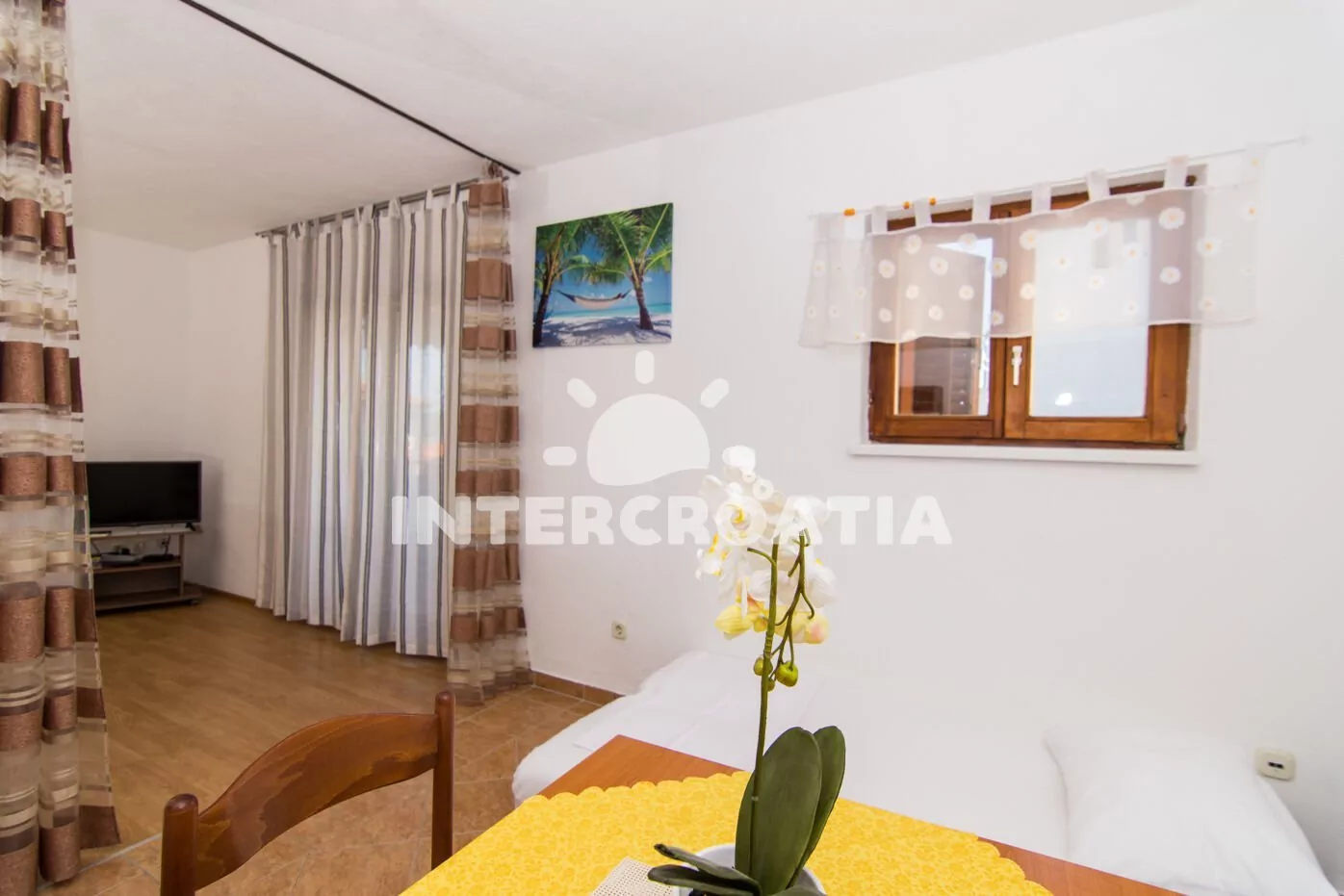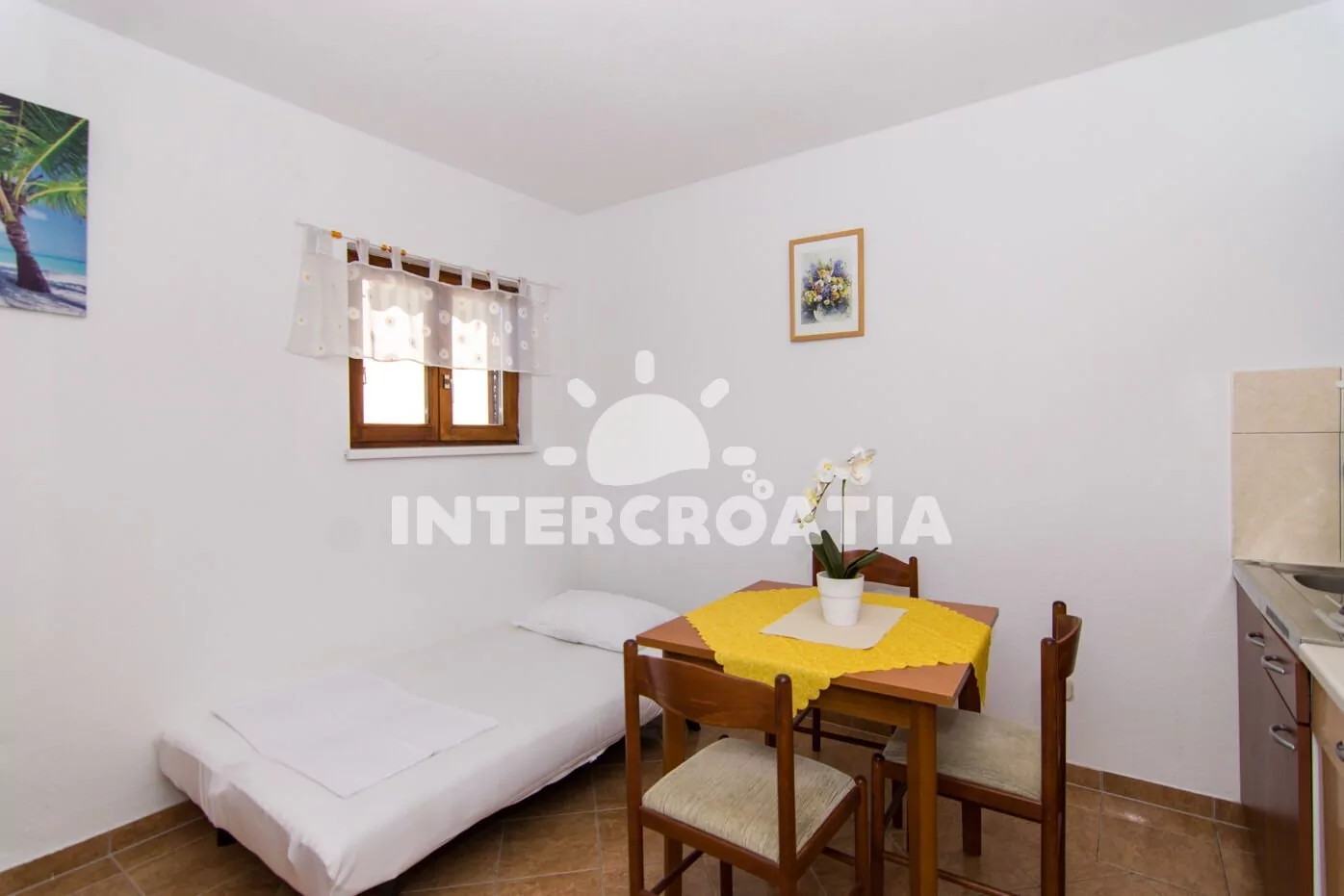 Apartmán (30 m2) typu studio, s balkonem a výhledem na moře. Apartmán se nachází v 1. patře domu a je vhodný pro 2 až 3 osoby. Obývací místnost je spojena s kuchyní. Kuchyňská linka je vybavena dvouplotýnkovým vařičem, mikrovlnnou troubou, rychlovarnou konvicí, kávovarem, nádobím a lednicí s mrazákem. Obývací místnost s jídelním stolem pro 3 osoby, pohovkou, televizí se satelitním programem, dvoulůžkem, jedním jednolůžkem, klimatizací a vstupem na balkon. Koupelna se sprchovým koutem, umyvadlem, fénem a wc. Hostům je k dispozici parkování u objektu zdarma.
