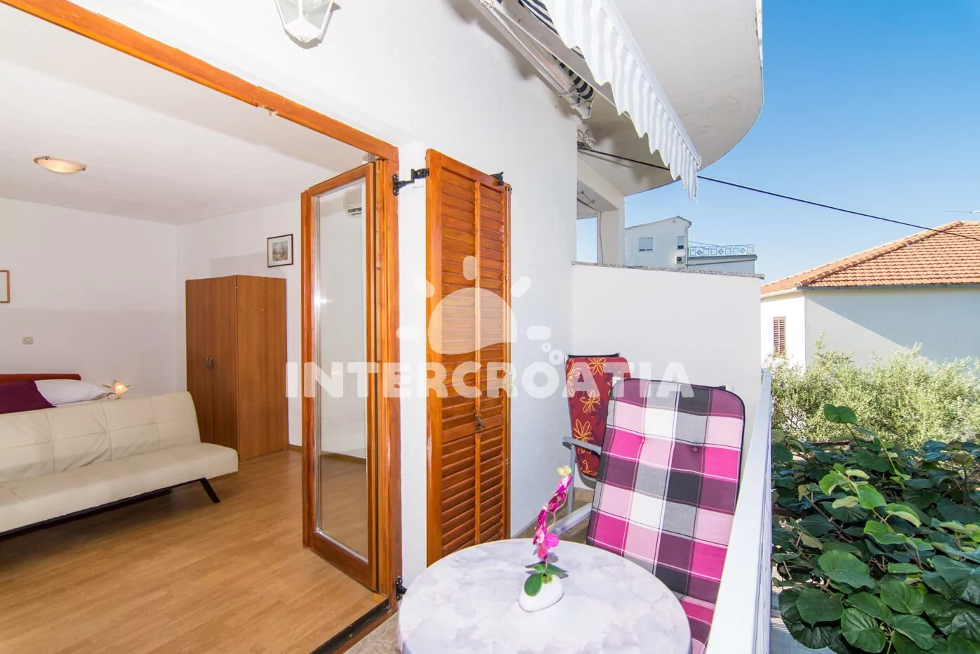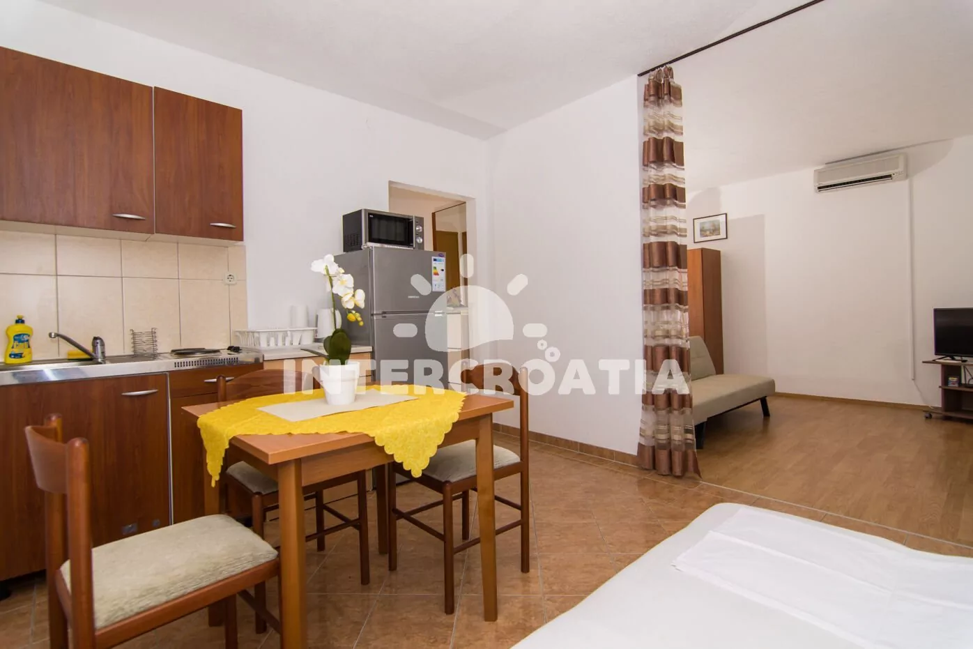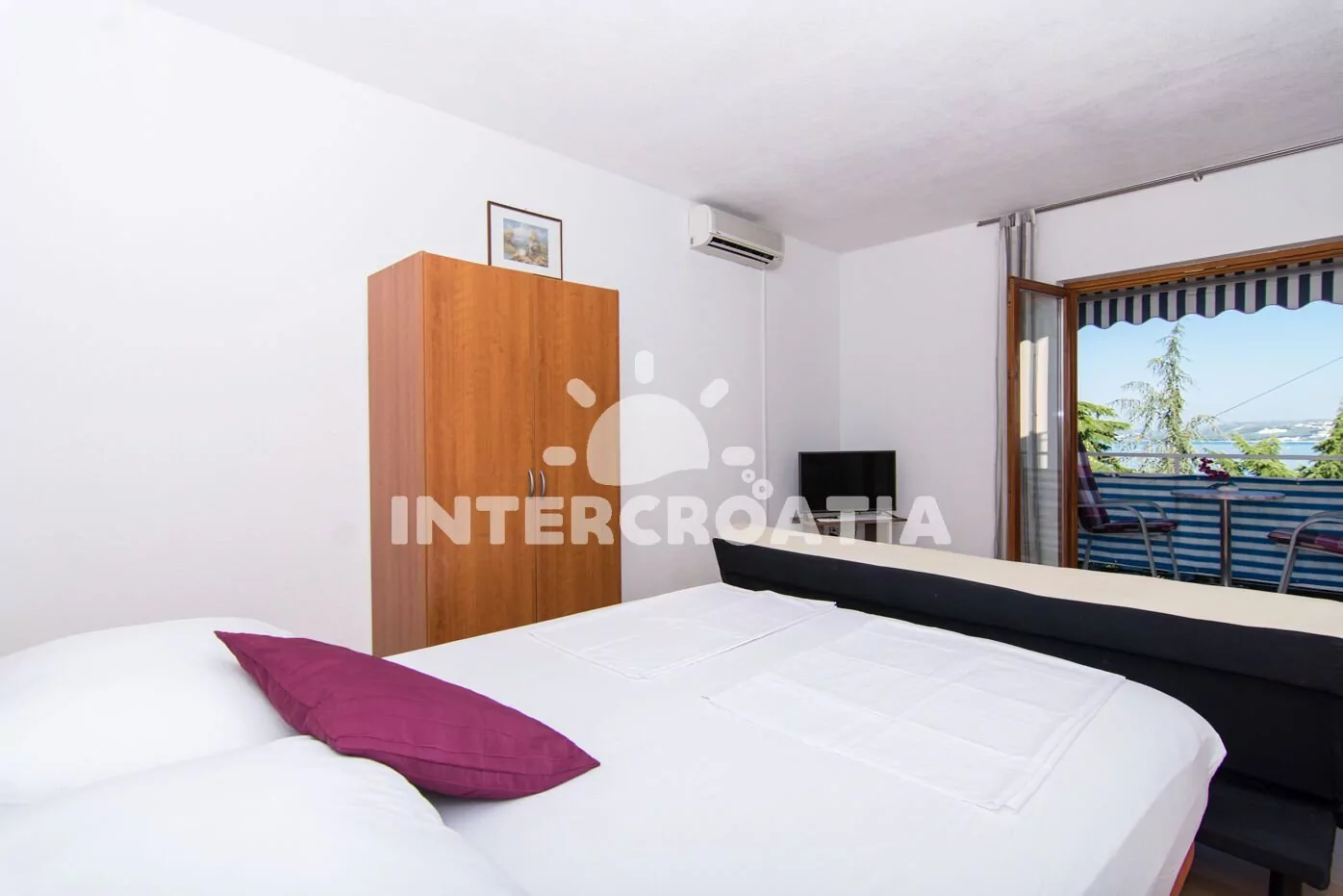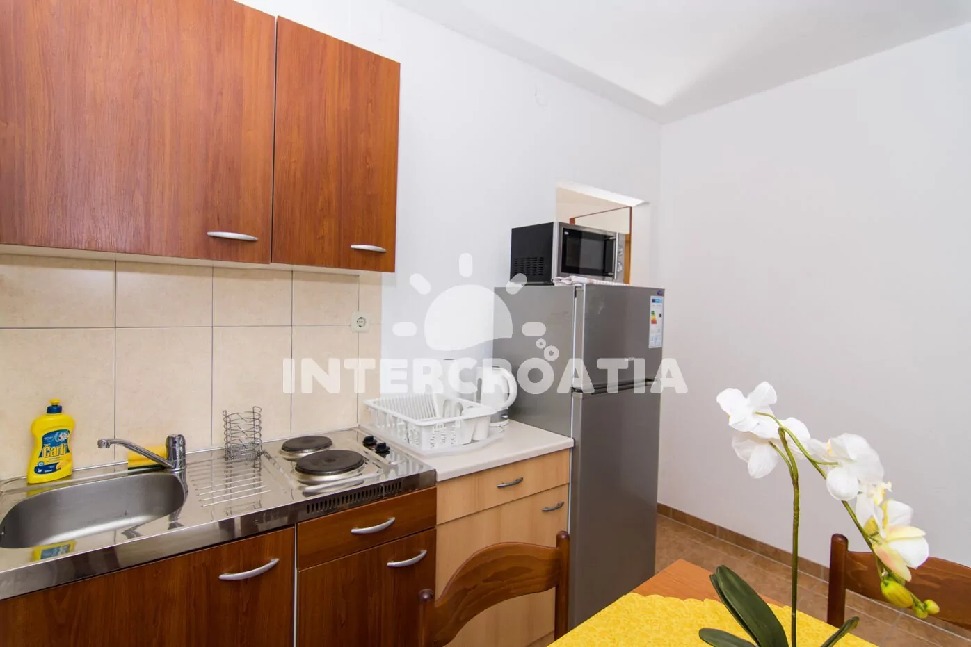 Apartmán (30 m2) typu studio, s balkonem a výhledem na moře. Apartmán se nachází v 1. patře domu a je vhodný pro 2 až 3 osoby. Obývací místnost je spojena s kuchyní. Kuchyňská linka je vybavena dvouplotýnkovým vařičem, mikrovlnnou troubou, rychlovarnou konvicí, kávovarem, nádobím a lednicí s mrazákem. Obývací místnost s jídelním stolem pro 3 osoby, pohovkou, televizí se satelitním programem, dvoulůžkem, jedním jednolůžkem, klimatizací a vstupem na balkon. Koupelna se sprchovým koutem, umyvadlem, fénem a wc. Hostům je k dispozici parkování u objektu zdarma.