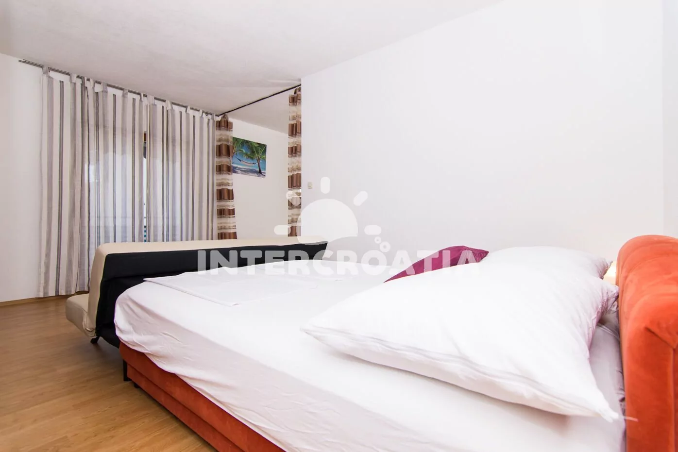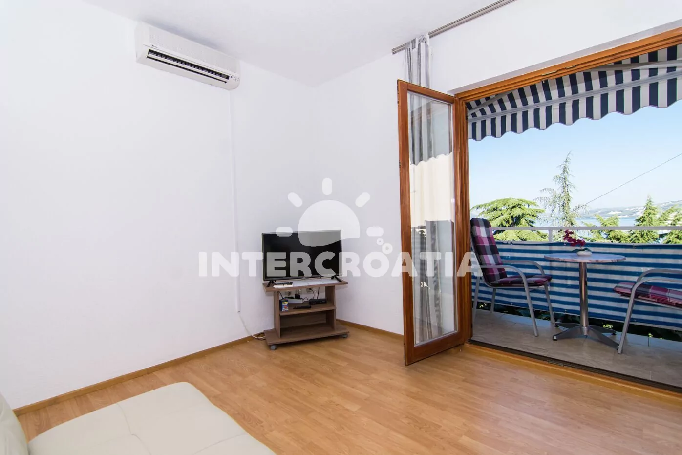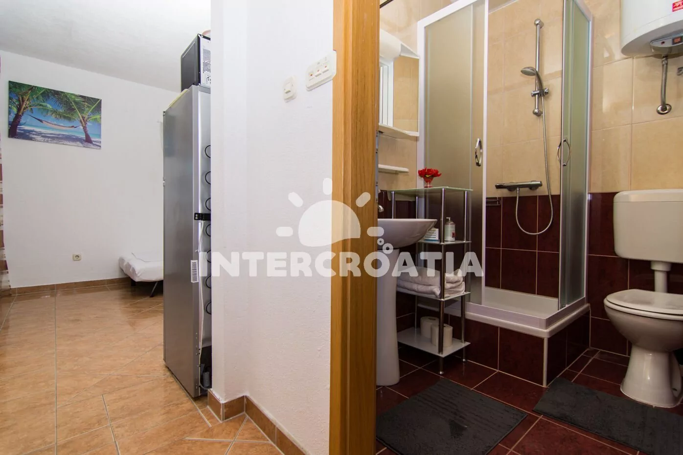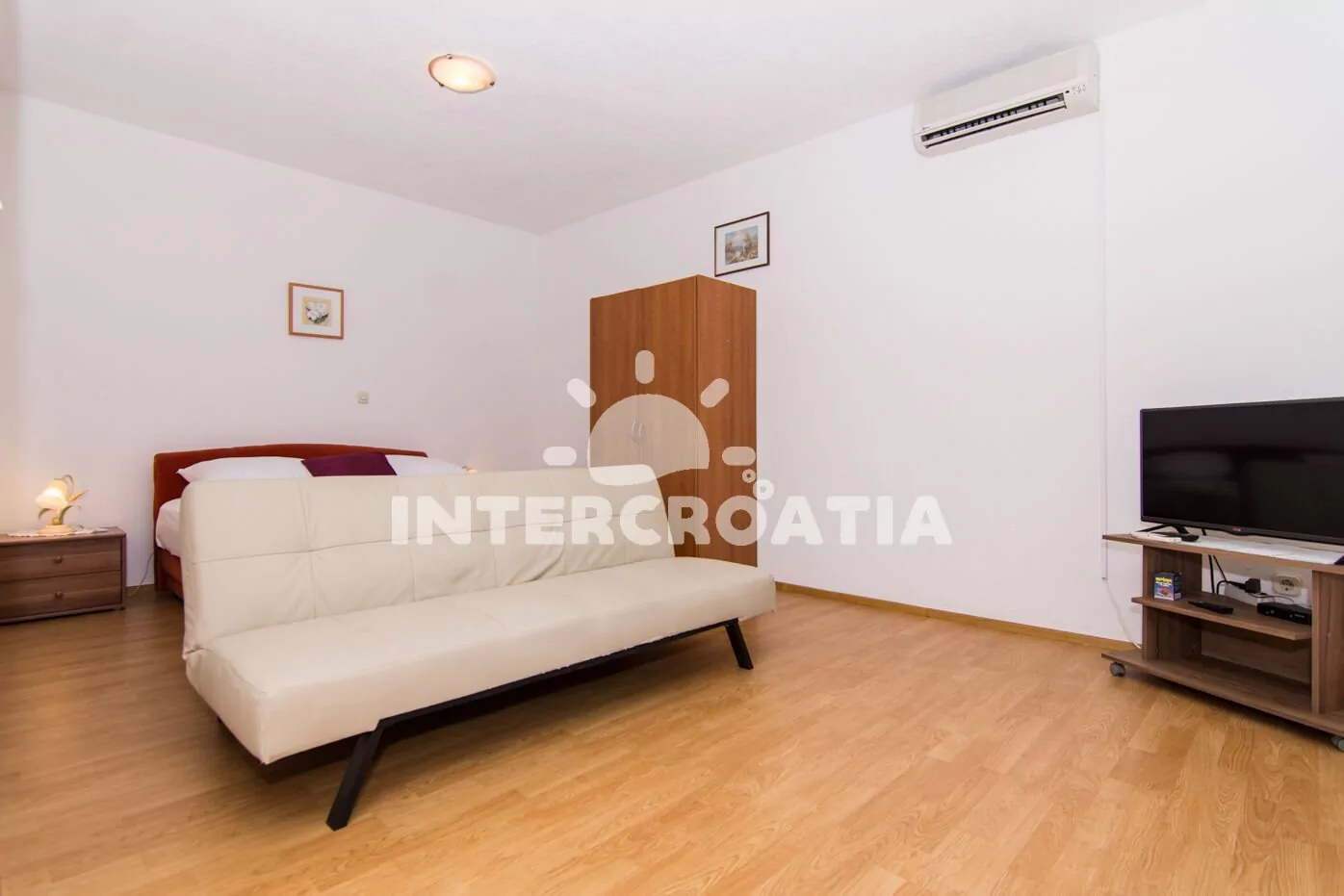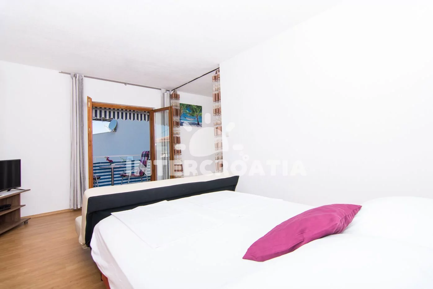 Apartmán (30 m2) typu studio, s balkonem a výhledem na moře. Apartmán se nachází v 1. patře domu a je vhodný pro 2 až 3 osoby. Obývací místnost je spojena s kuchyní. Kuchyňská linka je vybavena dvouplotýnkovým vařičem, mikrovlnnou troubou, rychlovarnou konvicí, kávovarem, nádobím a lednicí s mrazákem. Obývací místnost s jídelním stolem pro 3 osoby, pohovkou, televizí se satelitním programem, dvoulůžkem, jedním jednolůžkem, klimatizací a vstupem na balkon. Koupelna se sprchovým koutem, umyvadlem, fénem a wc. Hostům je k dispozici parkování u objektu zdarma.