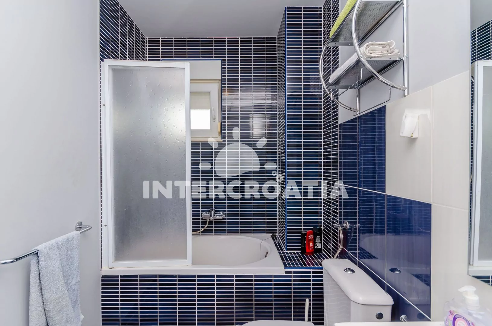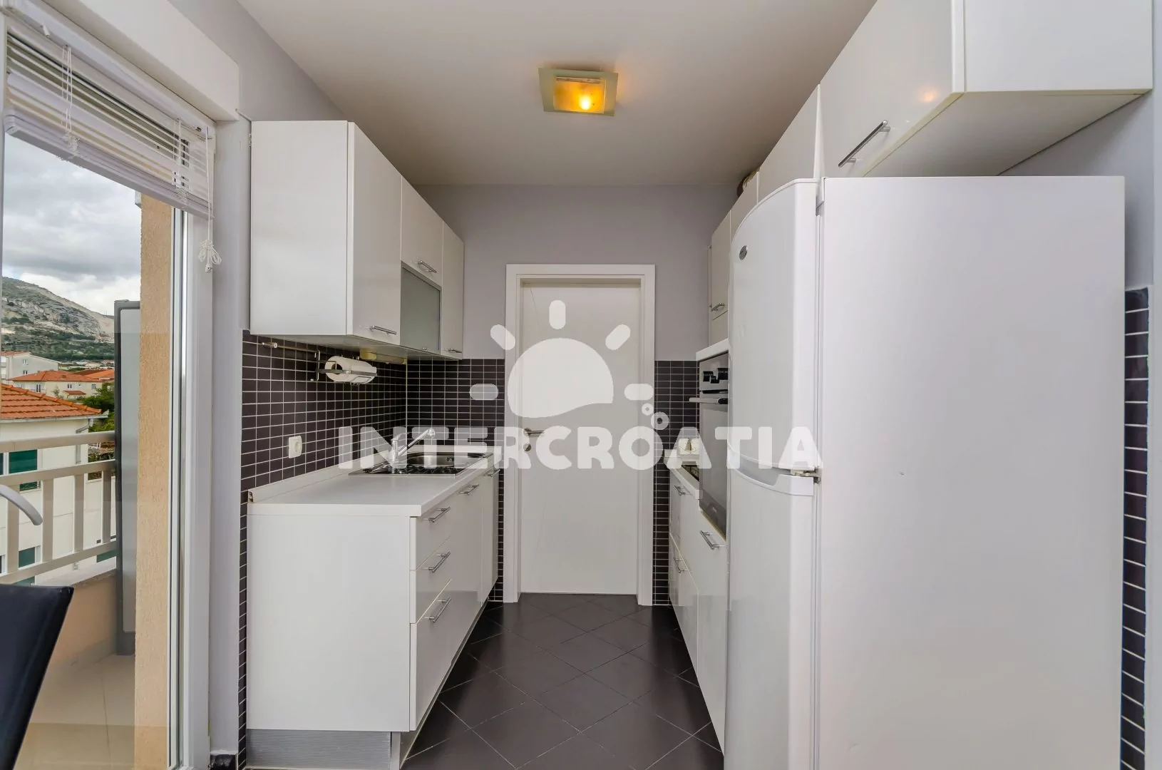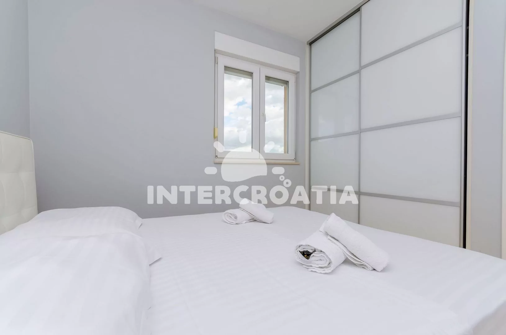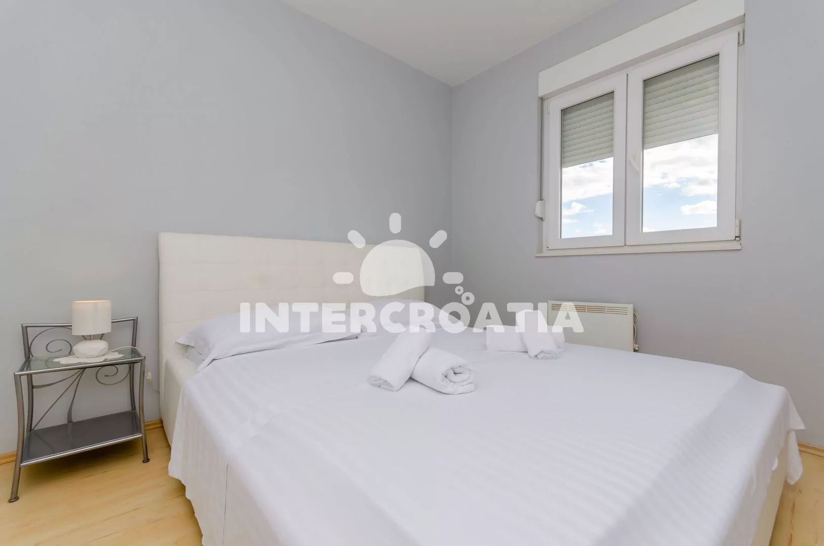 Apartmán (75 m2) s balkonem a částečným výhledem na moře se nachází ve 2. patře domu. Apartmán má 2 ložnice a je vhodný pro 4 až 5 osob. Obývací pokoj je spojený s kuchyní. Kuchyňská linka je vybavena varnou deskou, digestoří, vestavěnou troubou, kávovarem, mikrovlnnou troubou, nádobím a lednicí s mrazákem, rychlovarná konvice na požádání. Obývací pokoj s jídelním stolem, rohovou pohovkou (rozložitelná na extra lůžko pro 1 osobu), televizí se satelitním programem, klimatizací a vstupem na balkon. První i druhá ložnice je vybavena vždy s jedním dvoulůžkem. Koupelna s vanou, sprchovou zástěnou, umyvadlem, pračkou, fénem a wc. Dále samostatné wc s umyvadlem. Hostům je k dispozici parkování u objektu zdarma.