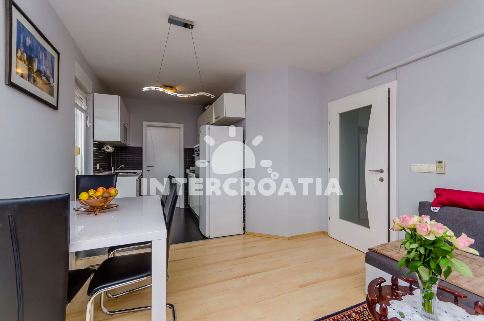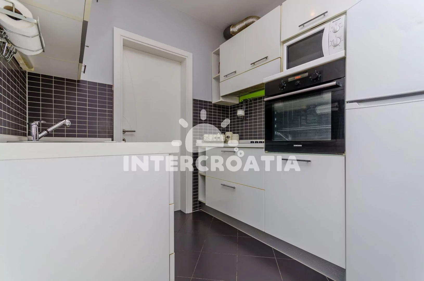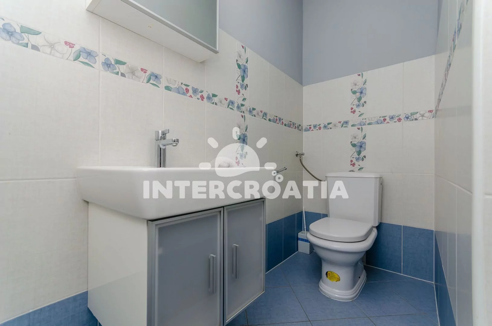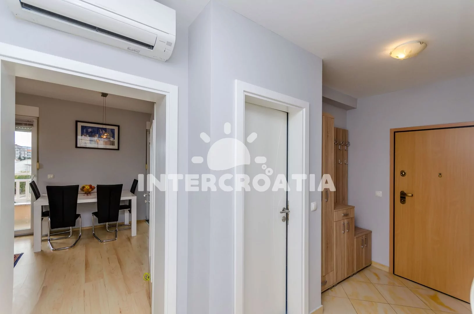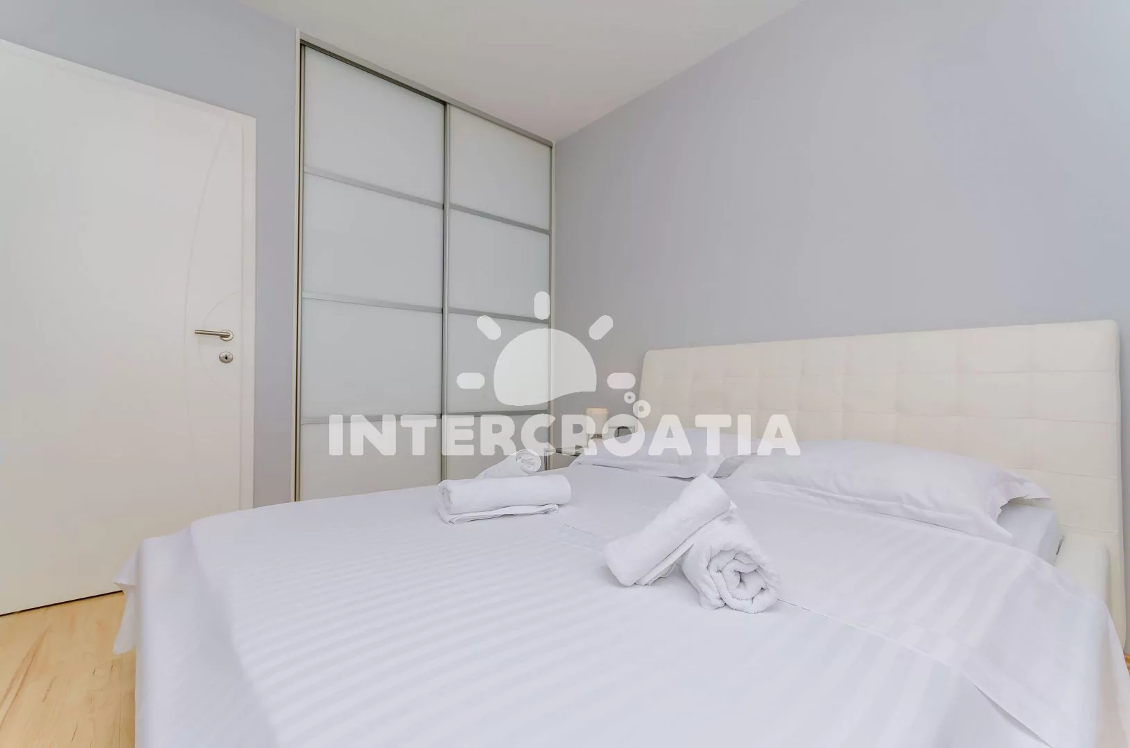 Apartmán (75 m2) s balkonem a částečným výhledem na moře se nachází ve 2. patře domu. Apartmán má 2 ložnice a je vhodný pro 4 až 5 osob. Obývací pokoj je spojený s kuchyní. Kuchyňská linka je vybavena varnou deskou, digestoří, vestavěnou troubou, kávovarem, mikrovlnnou troubou, nádobím a lednicí s mrazákem, rychlovarná konvice na požádání. Obývací pokoj s jídelním stolem, rohovou pohovkou (rozložitelná na extra lůžko pro 1 osobu), televizí se satelitním programem, klimatizací a vstupem na balkon. První i druhá ložnice je vybavena vždy s jedním dvoulůžkem. Koupelna s vanou, sprchovou zástěnou, umyvadlem, pračkou, fénem a wc. Dále samostatné wc s umyvadlem. Hostům je k dispozici parkování u objektu zdarma.
