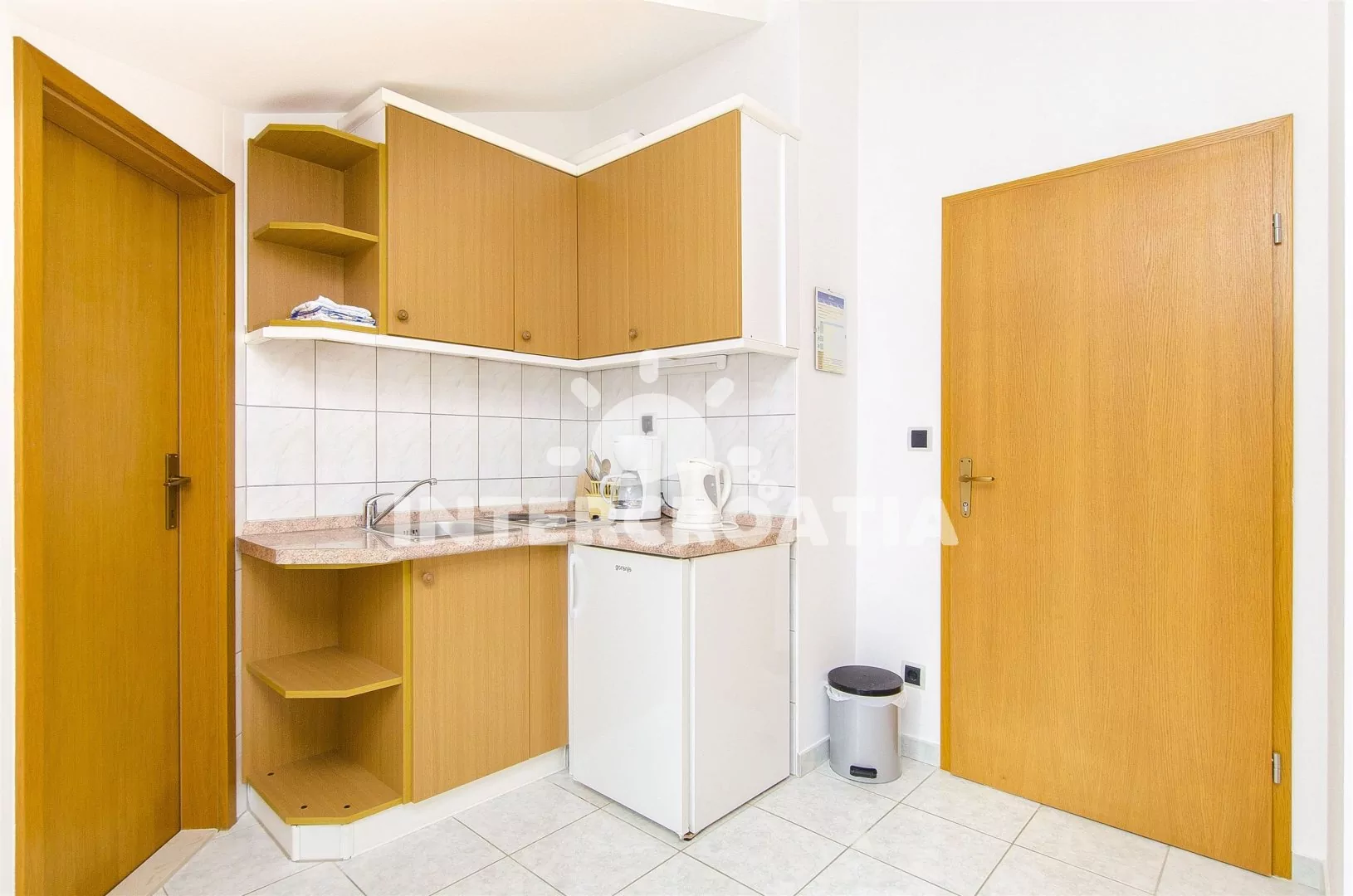 Apartmán (22 m2) typu studio s balkonem, venkovním posezením a výhledem na moře se nachází ve 3. patře domu. Obývací místnost je spojena s kuchyní. Kuchyňská linka je vybavena dvouplotýnkovým vařičem…