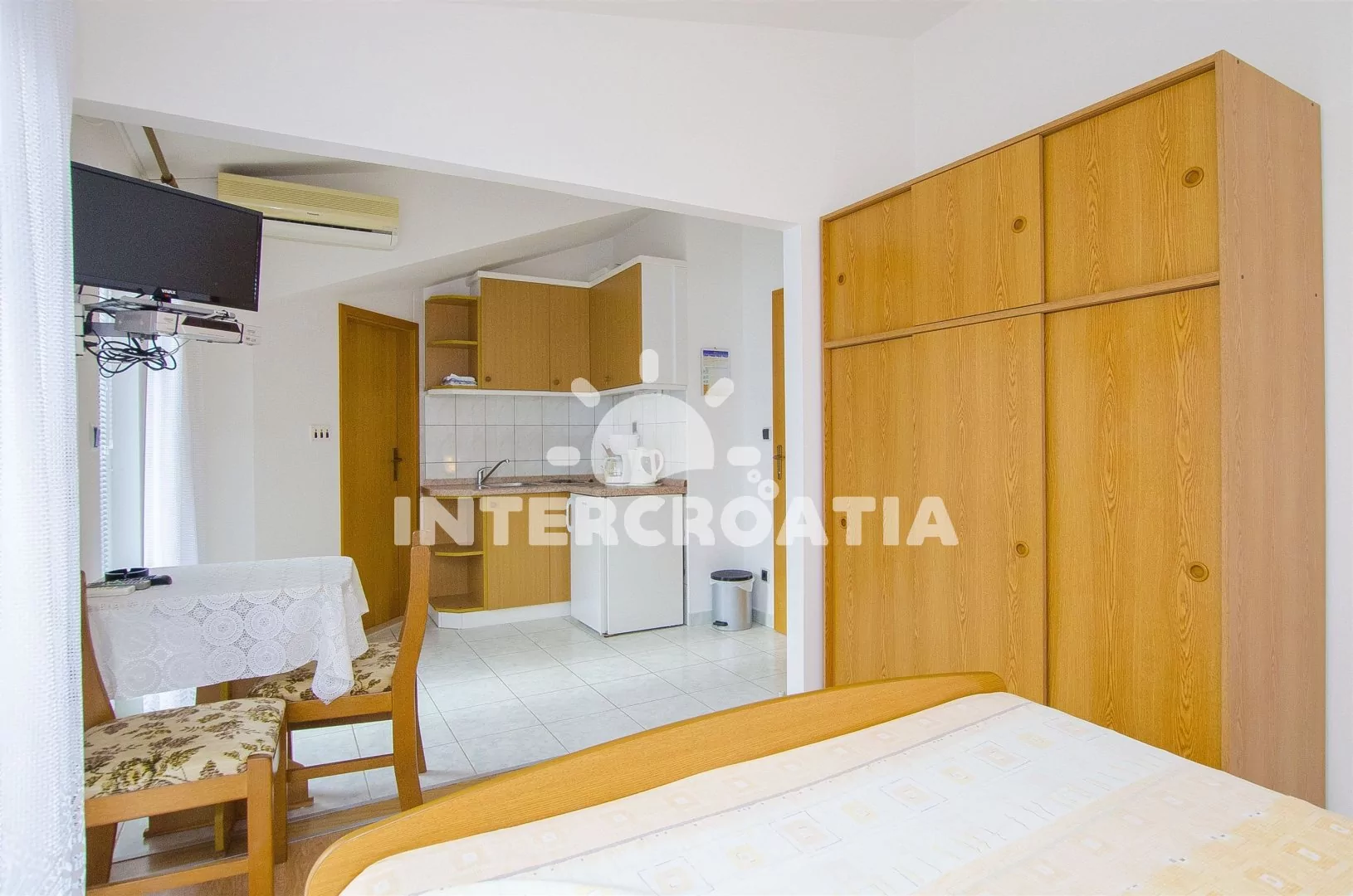 Apartmán (22 m2) typu studio s balkonem, venkovním posezením a výhledem na moře se nachází ve 3. patře domu. Obývací místnost je spojena s kuchyní. Kuchyňská linka je vybavena dvouplotýnkovým vařičem, rychlovarnou konvicí, kávovarem, nádobím a lednicí s mrazákem. Obývací místnost s dvoulůžkem, televizí se satelitním programem, klimatizací a vstupem na balkon. Koupelna se sprchovým koutem, umyvadlem a wc. Hostům je k dispozici parkování u objektu zdarma.