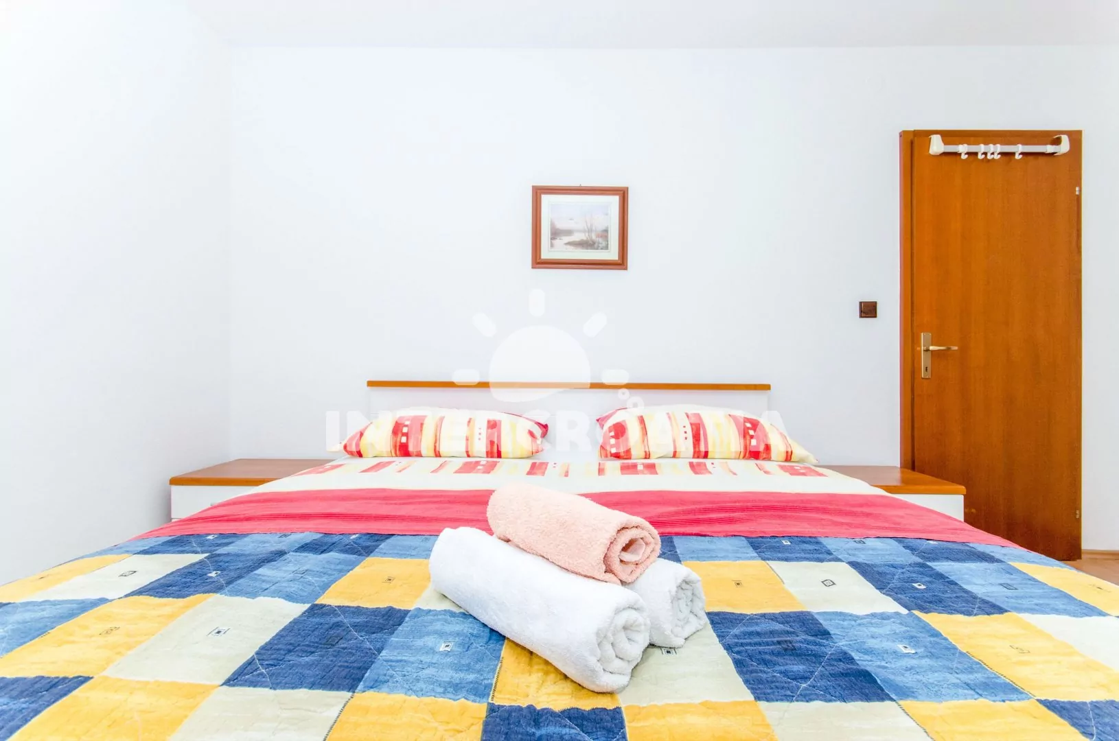Apartmán (40 m2) se sdílenou terasou se nachází v přízemí domu. Apartmán má 1 ložnici a je vhodný pro 2 až 3 osoby. Obývací pokoj je spojený s kuchyní. Kuchyňská linka je vybavena dvouplotýnkovým vařičem, rychlovarnou konvicí, kávovarem, nádobím a lednicí s mrazákem. Obývací pokoj s jídelním stolem, pohovkou (rozložitelná na extra lůžko pro 1 osobu), televizí se satelitním programem a klimatizací Ložnice s jedním dvoulůžkem. Koupelna se sprchovým koutem, umyvadlem, fénem a wc. Hostům je k dispozici parkování u objektu zdarma.