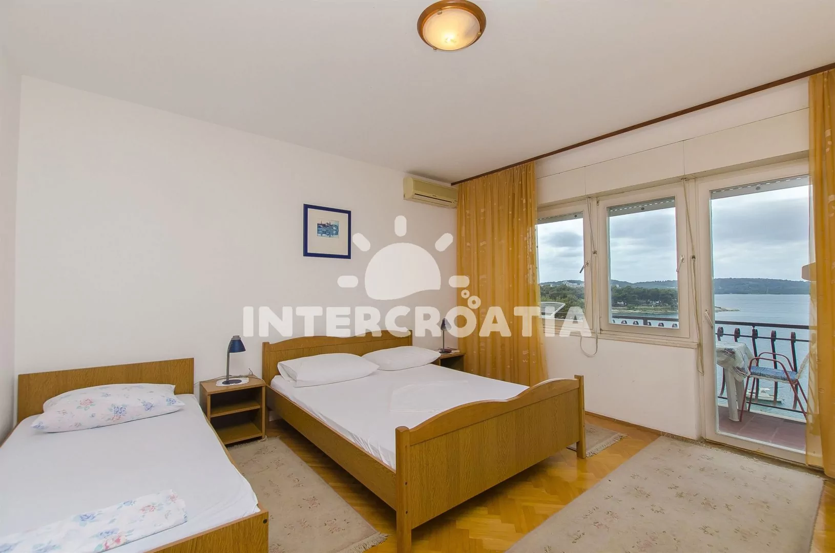 Apartmán (25 m2) s balkonem, posezením a výhledem na moře se nachází v 1. patře vily. Apartmán má 1 ložnici a je vhodný pro až 3 osoby. Kuchyň je spojena s ložnicí. Kuchyňská linka je vybavena dvouplotýnkovým vařičem, mikrovlnnou troubou, rychlovarnou konvicí, kávovarem, nádobím a lednicí s mrazákem. Ložnice s dvoulůžkem, jednolůžkem, televizí se satelitním programem, klimatizací a vstupem na balkon. Koupelna se sprchovým koutem, umyvadlem a wc. Hostům je k dispozici parkování u objektu zdarma.