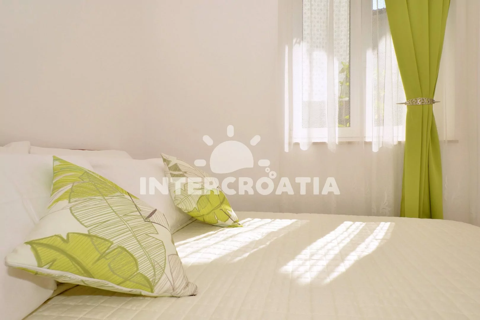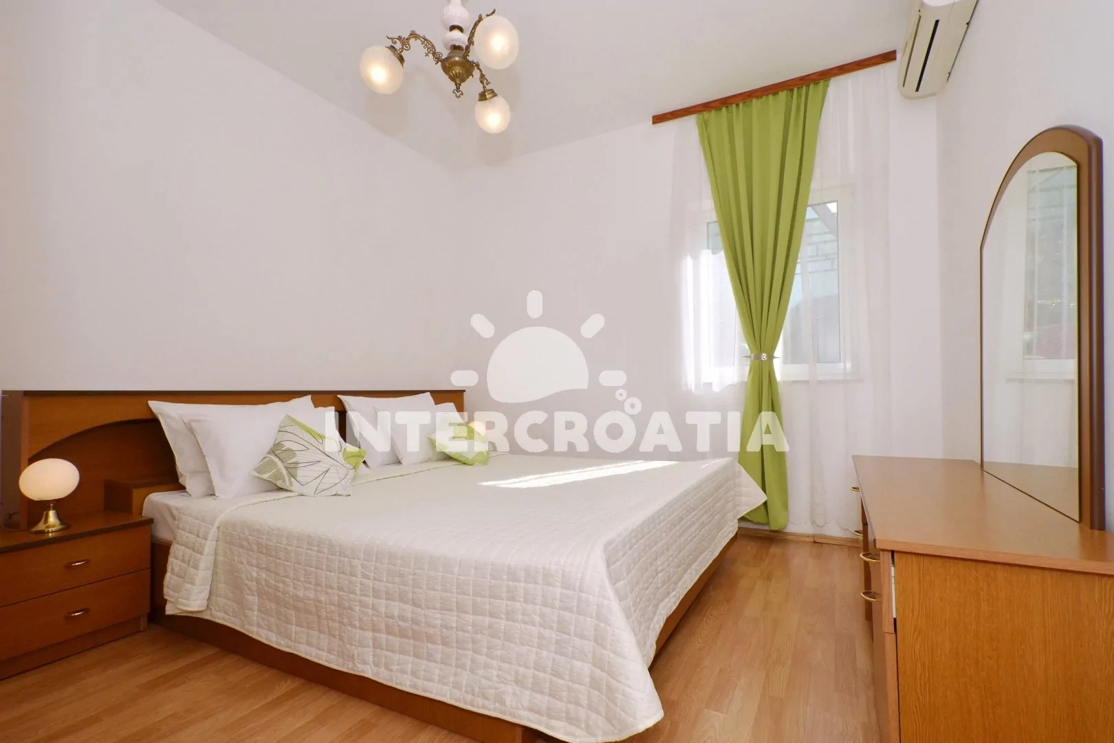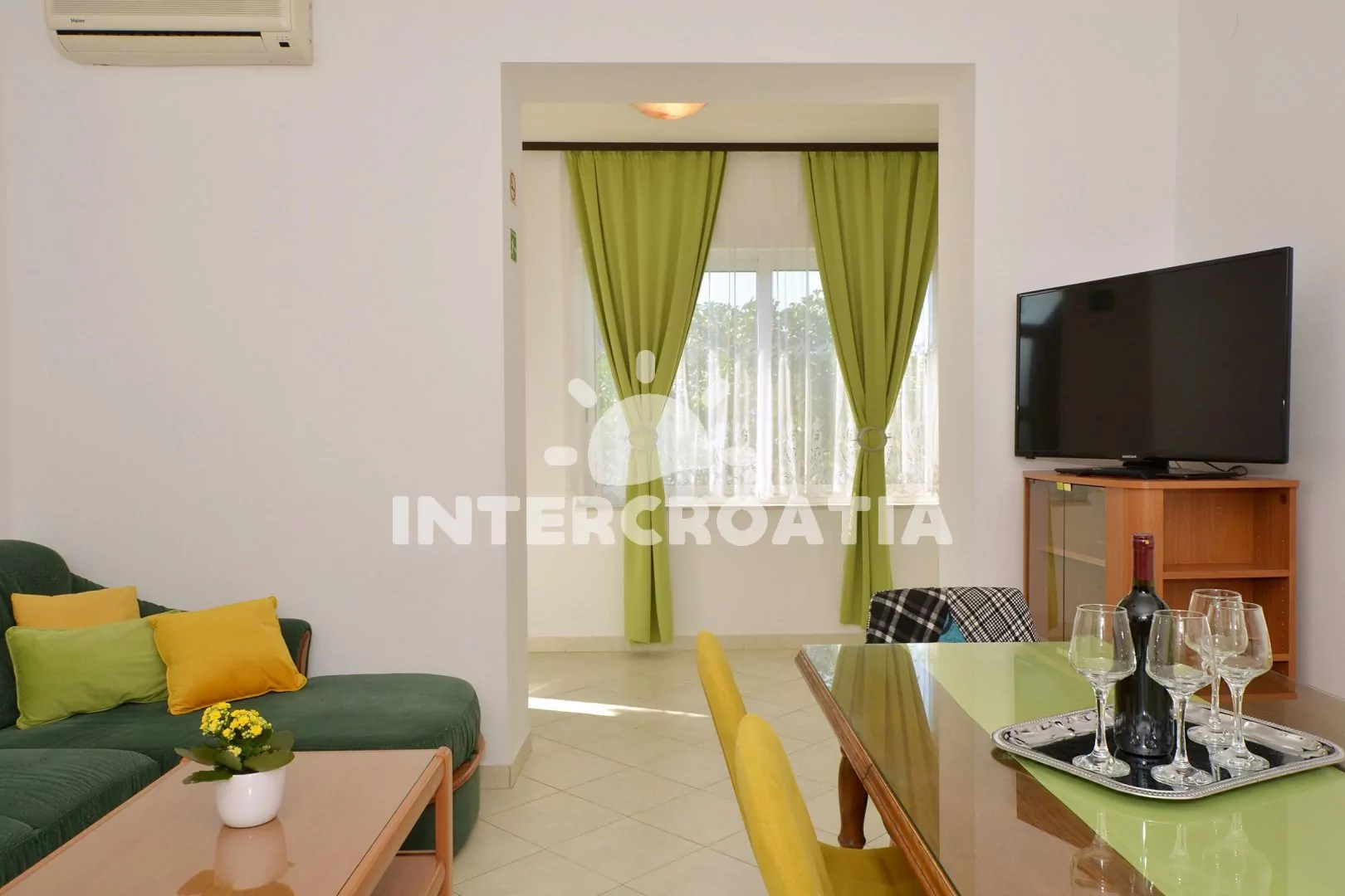 Apartmán (85 m2) s terasou, posezením a výhledem na moře se nachází v přízemí domu. Apartmán má 3 ložnice, 2 koupelny a je vhodný pro 6 až 8 osob. Obývací pokoj je spojený s kuchyní. Kuchyňská linka je vybavena varnou deskou, digestoří, mikrovlnnou troubou, rychlovarnou konvicí, kávovarem, toustovačem, nádobím a lednicí s mrazákem. Obývací pokoj s jídelním stolem, pohovkou (rozložitelná na extra lůžko pro 2 osoby), televizí, klimatizací a vstupem na terasu. Všechny tři ložnice jsou vybaveny vždy s jedním dvoulůžkem a klimatizací. První koupelna s vanou, umyvadlem, pračkou, fénem, bidetem a wc. Druhá koupelna se sprchovým koutem, umyvadlem a wc. Hostům je k dispozici parkování u objektu zdarma.