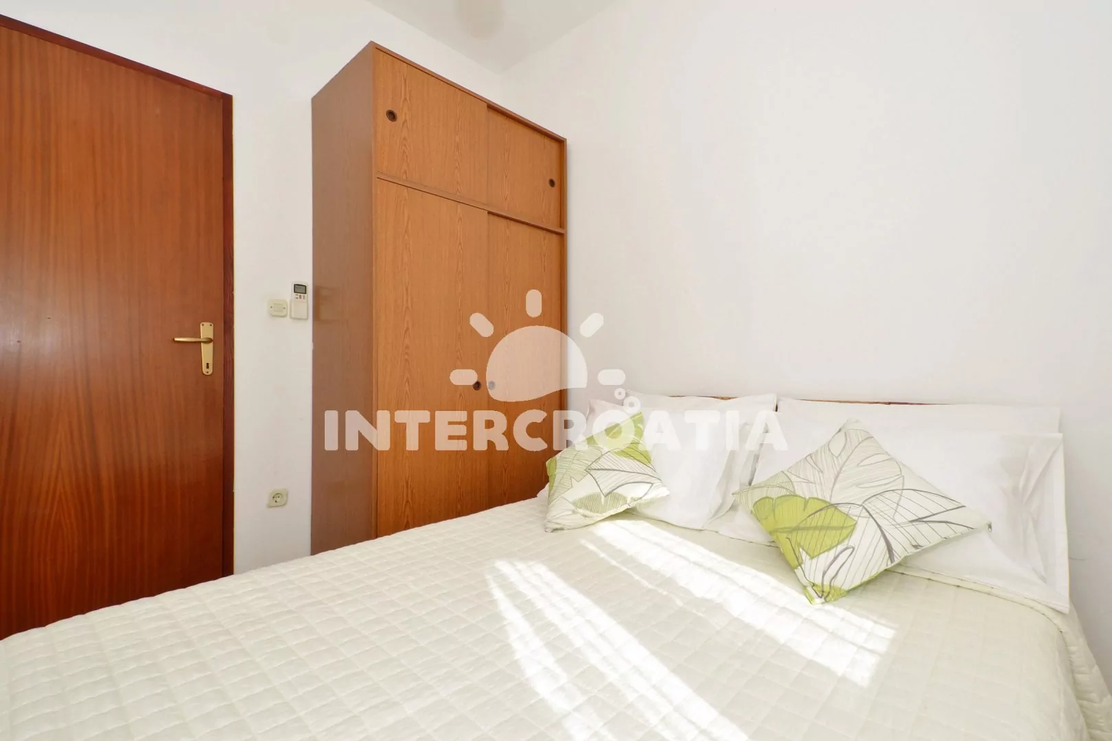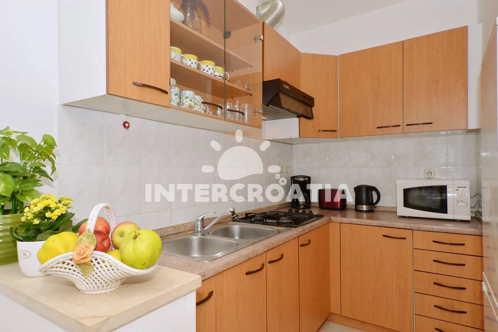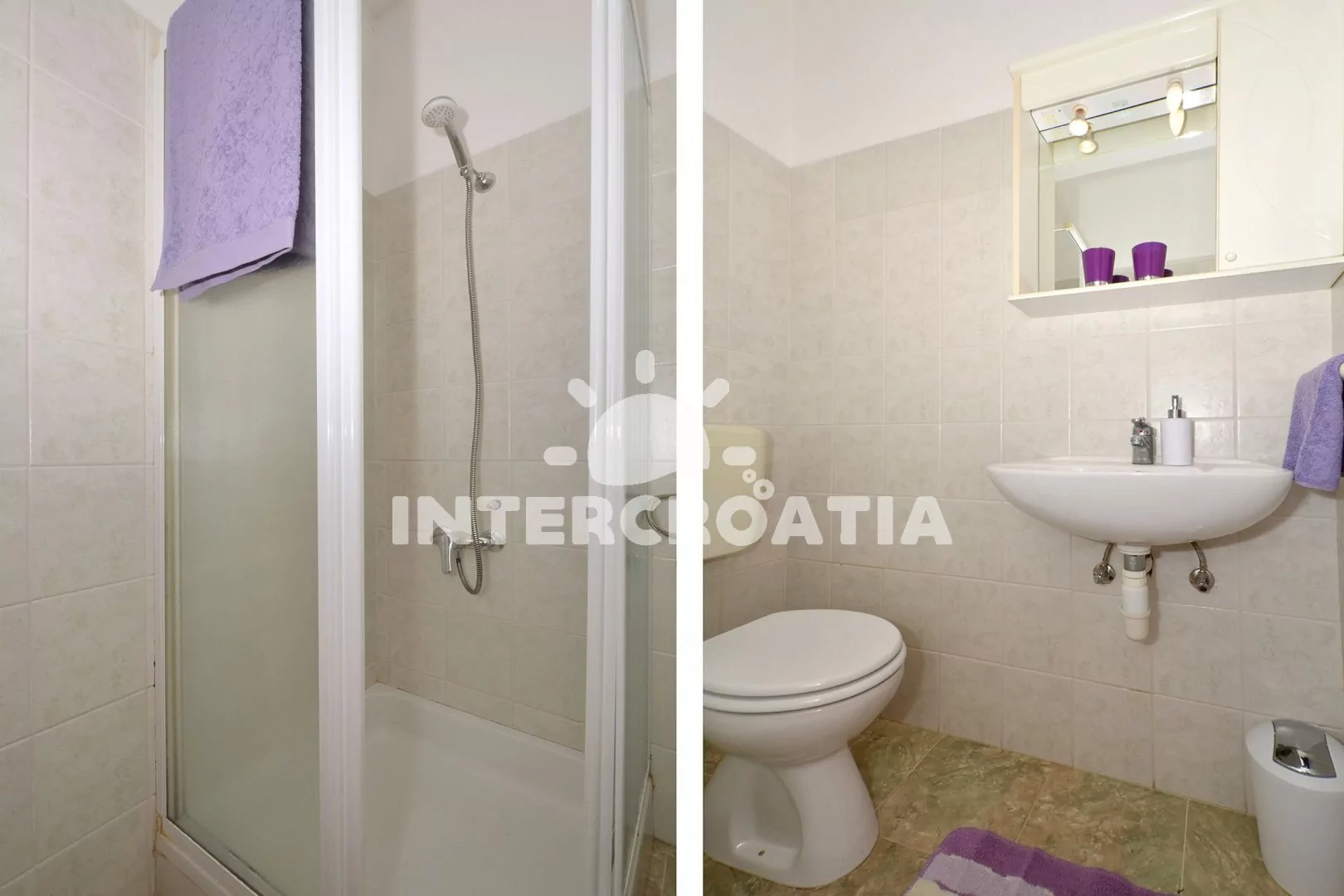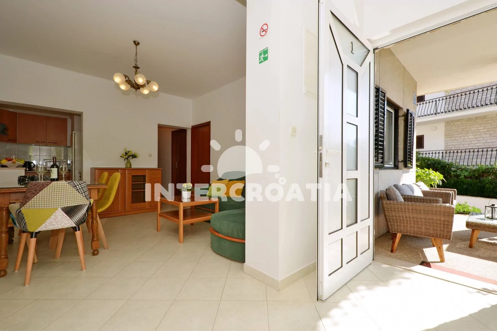 Apartmán (85 m2) s terasou, posezením a výhledem na moře se nachází v přízemí domu. Apartmán má 3 ložnice, 2 koupelny a je vhodný pro 6 až 8 osob. Obývací pokoj je spojený s kuchyní. Kuchyňská linka je vybavena varnou deskou, digestoří, mikrovlnnou troubou, rychlovarnou konvicí, kávovarem, toustovačem, nádobím a lednicí s mrazákem. Obývací pokoj s jídelním stolem, pohovkou (rozložitelná na extra lůžko pro 2 osoby), televizí, klimatizací a vstupem na terasu. Všechny tři ložnice jsou vybaveny vždy s jedním dvoulůžkem a klimatizací. První koupelna s vanou, umyvadlem, pračkou, fénem, bidetem a wc. Druhá koupelna se sprchovým koutem, umyvadlem a wc. Hostům je k dispozici parkování u objektu zdarma.