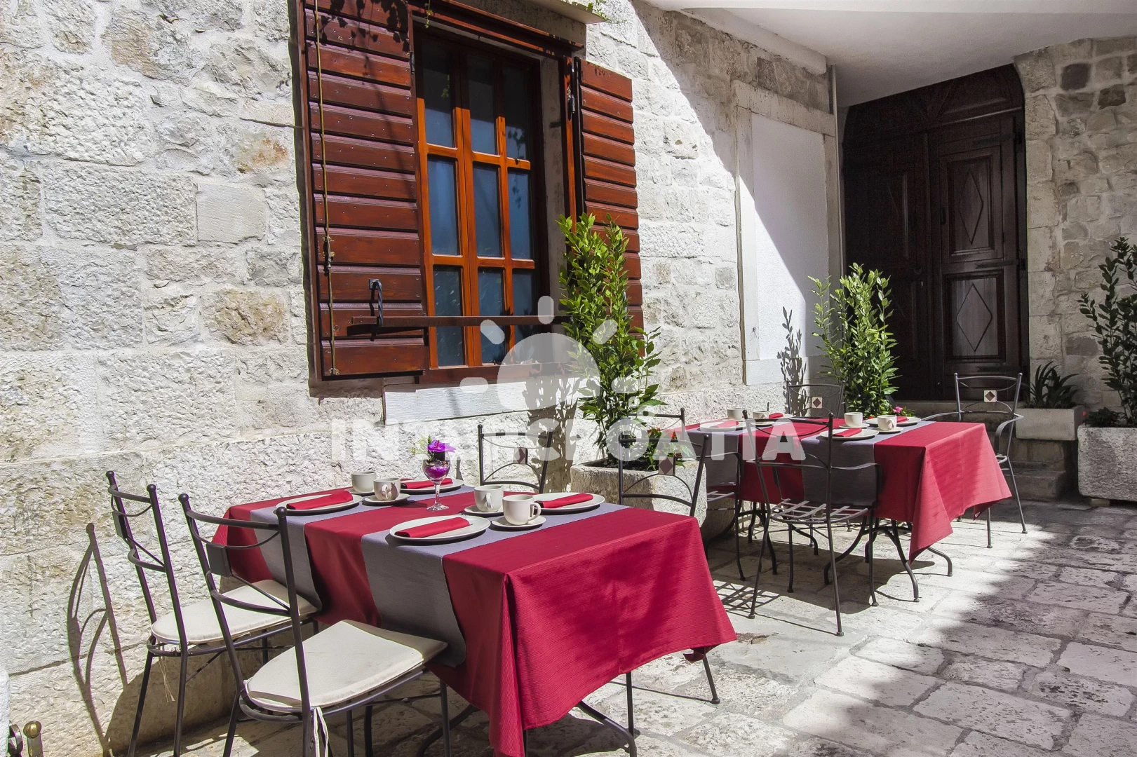 Vzdálenosti: centrum 0 m, Moře 20 m, pláž 500 m (oblázková a betonové desky), směnárna 10 m, bar 10 m, muzeum 20 m, banka 30 m, restaurace 50 m, pošta 50 m, veřejná doprava 50 m, supermarket 50 m, ambulance 300 m, lékárna 300 m, diskotéka 500 m, půjčovna kol 500 m, půjčovna motorových člunů 500 m, čerpací stanice 800 m, potápění 3 km, letiště (Split) 5 km, trajekt (Split) 25 km,