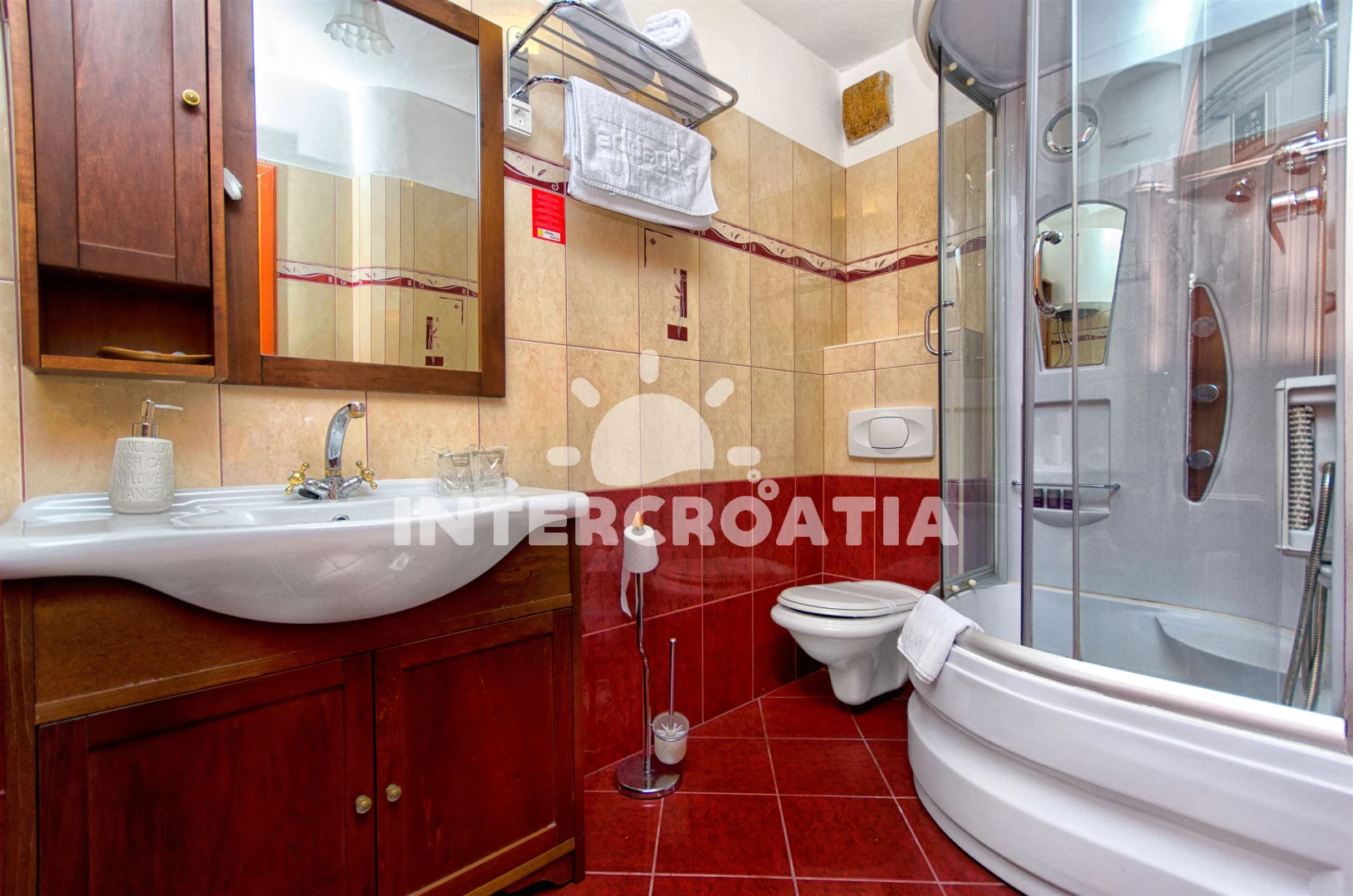 Vzdálenosti: centrum 0 m, Moře 20 m, pláž 500 m (oblázková a betonové desky), směnárna 10 m, bar 10 m, muzeum 20 m, banka 30 m, restaurace 50 m, pošta 50 m, veřejná doprava 50 m, supermarket 50 m, ambulance 300 m, lékárna 300 m, diskotéka 500 m, půjčovna kol 500 m, půjčovna motorových člunů 500 m, čerpací stanice 800 m, potápění 3 km, letiště (Split) 5 km, trajekt (Split) 25 km,