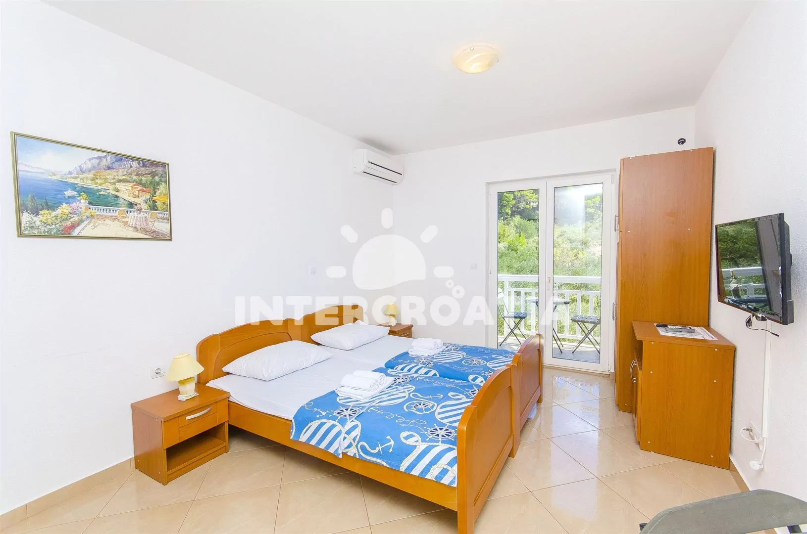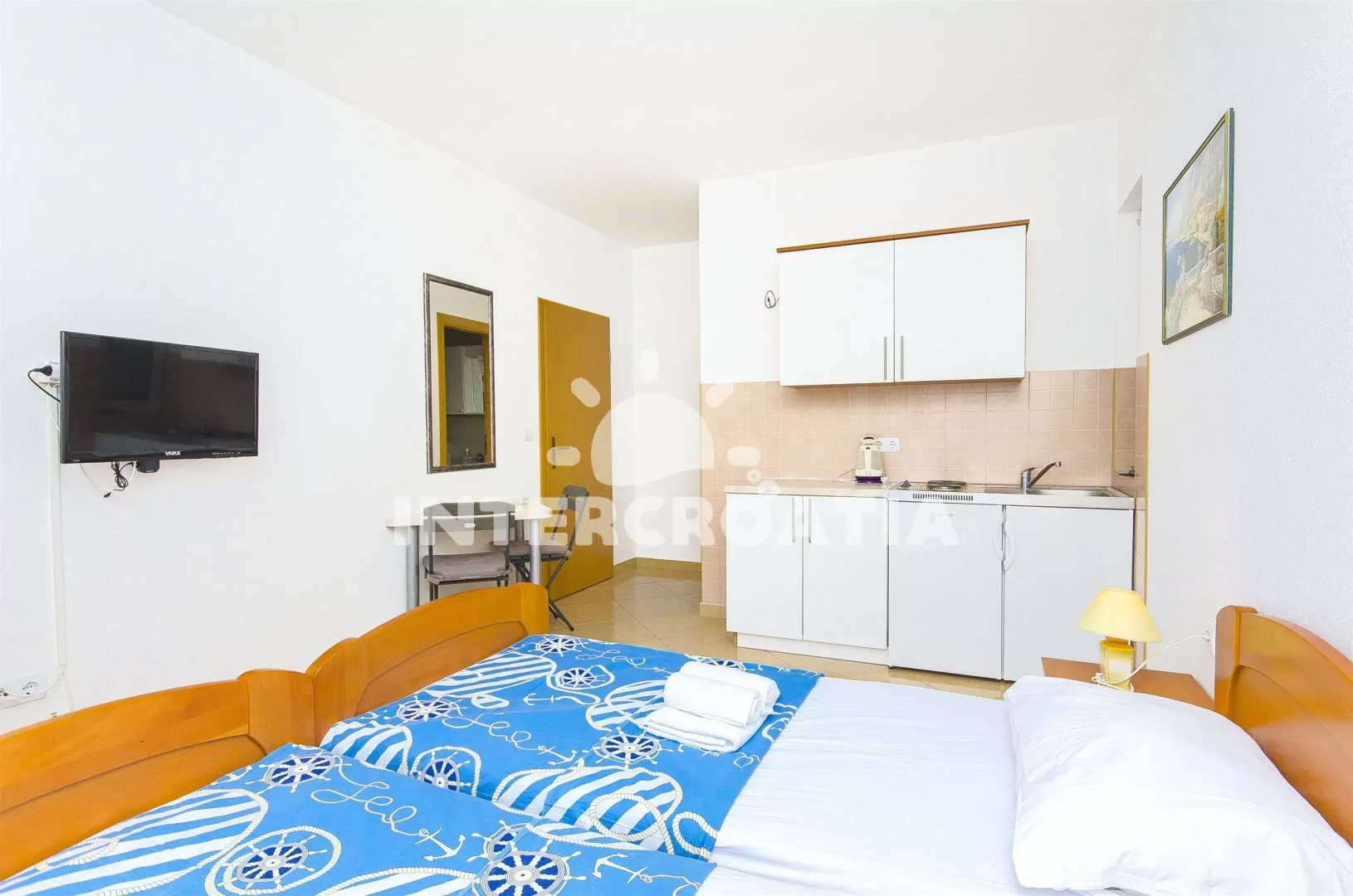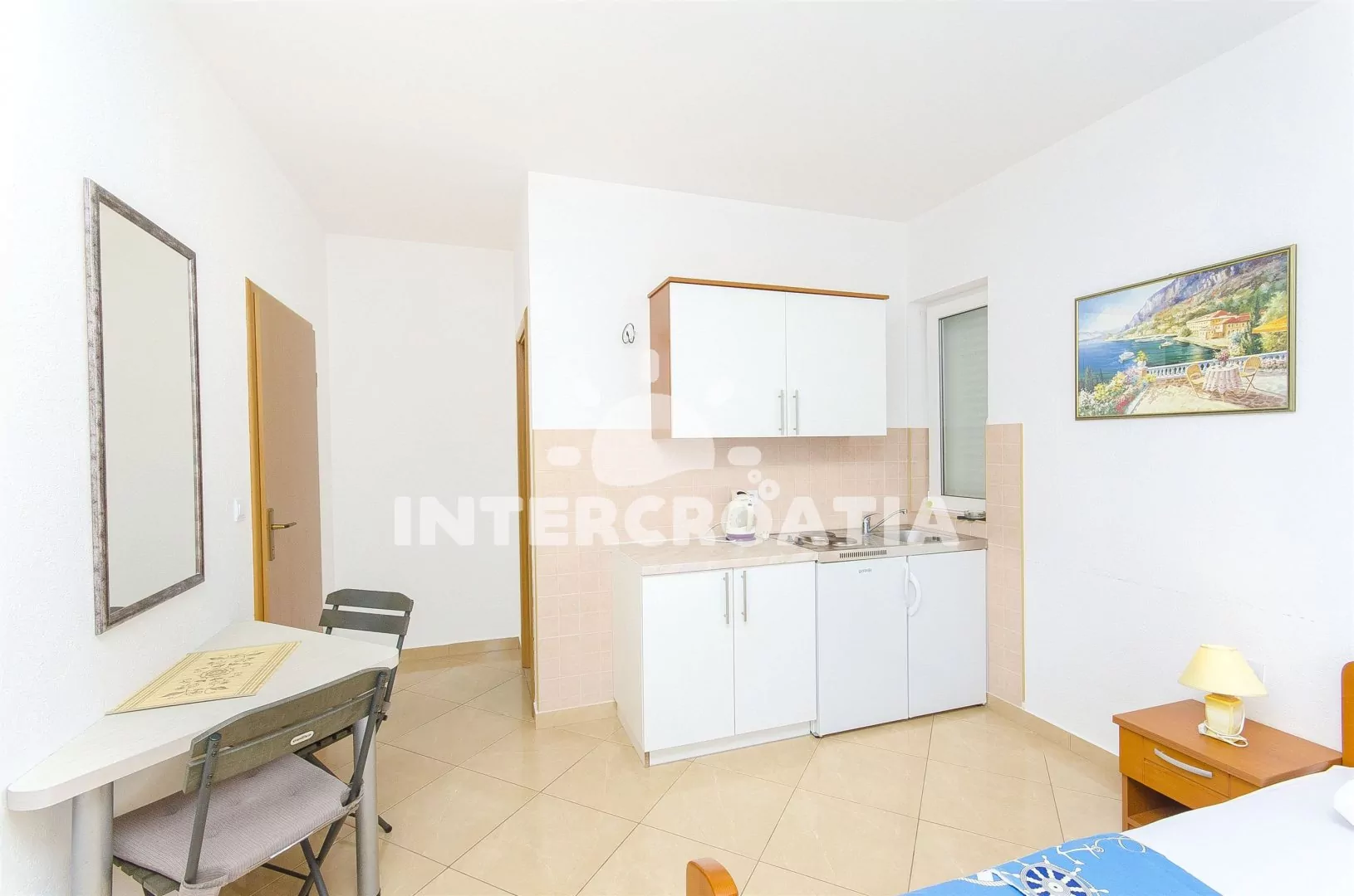 Apartmán pro 2 osoby s bočním výhledem na moře se nachází v prvním patře domu s venkovním posezením. Kuchyňský kout je vybaven nádobím, dvouplotýnkovým elektrickým sporákem, rychlovarnou konvicí a chladničkou. Obývací část s jídelním stolem, televizí se satelitním programem, manželským dvoulůžkem a vstupem na balkon. Koupelna se sprchovým koutem, umyvadlem a wc. K dispozici: klimatizace, WiFi, bazén, žehlička (služba na požádání) a balkon s posezením.