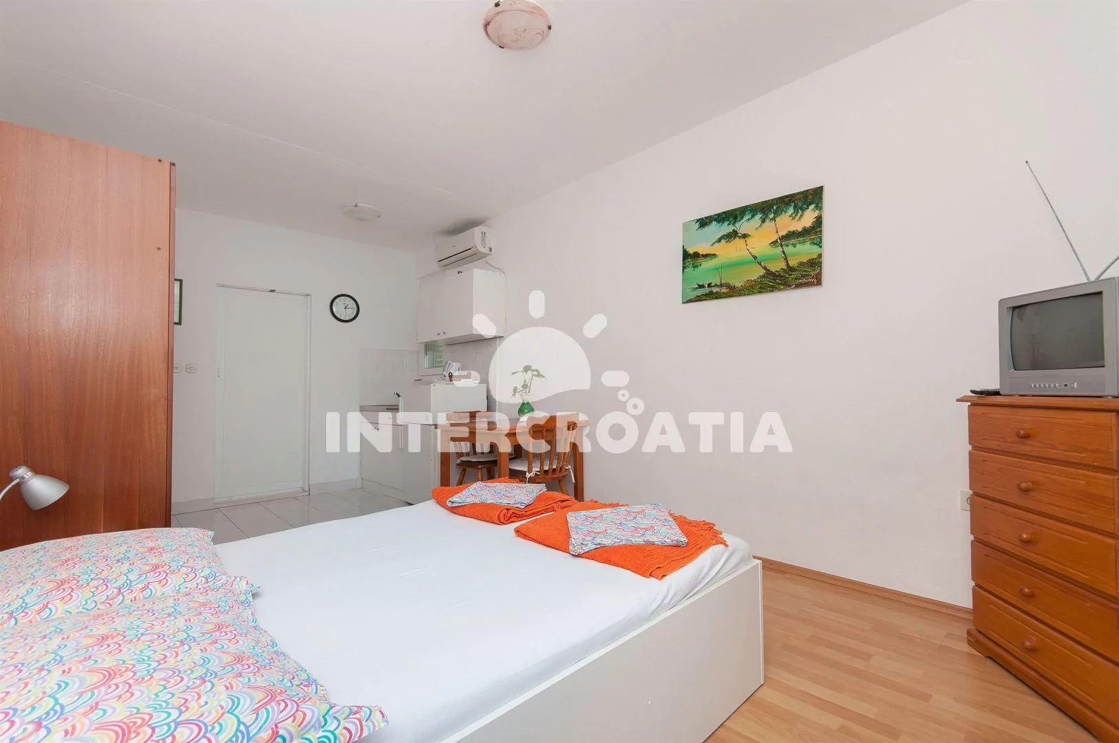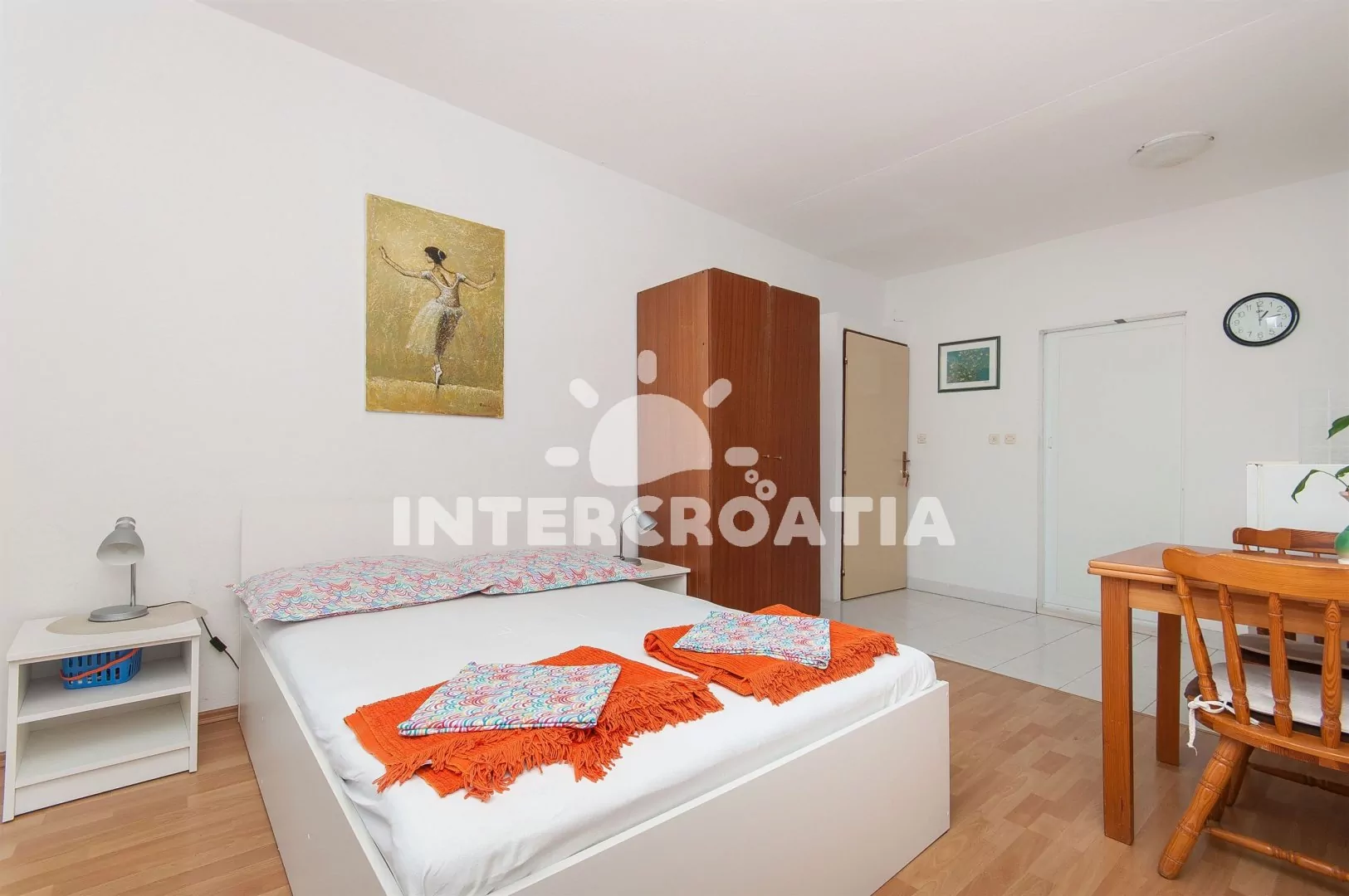 Apartmán typu studio s balkonem a výhledem na moře, se nachází v druhém patře vily. Kuchyňský kout je vybaven dvouplotýnkovým sporákem, rychlovarnou konvicí, nádobím a lednicí s mrazákem. Obývací místnost s jídelním stolem pro 2 osoby, jedním dvoulůžkem, klimatizací a vstupem na balkon. koupelna se sprchovým koutem, umyvadlem a wc. Hostům je k dispozici parkování u objektu zdarma.