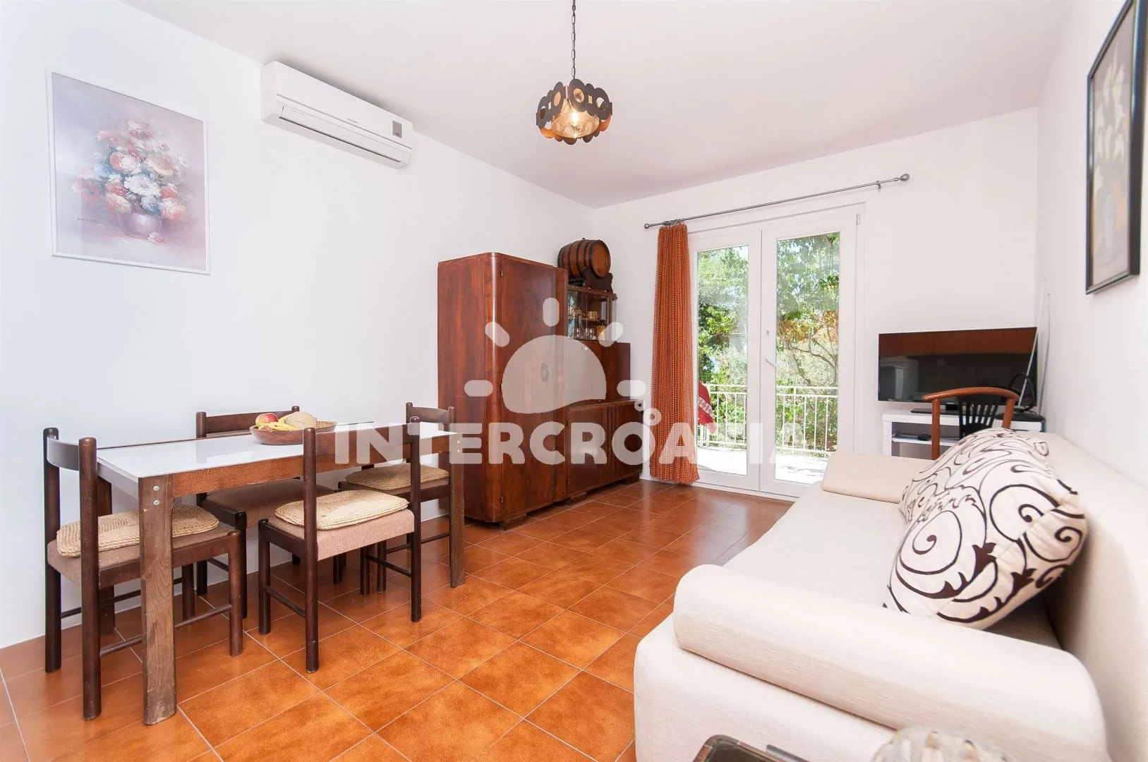 Apartmán s terasou se nachází v prvním patře domu a je vhodný pro 3 až 5 osob. Obývací pokoj je spojený s kuchyní. Kuchyňská linka se sporákem, troubou, rychlovarnou konvicí, mikrovlnnou troubou, toustovačem, nádobím a lednicí s mrazákem. Obývací pokoj s jídelním stolem pro 4 osoby, pohovkou (rozložitelná na extra lůžko pro 2 osoby), televizí, klimatizací a vstupem na terasu. Ložnice s jedním dvoulůžkem, jedním jednolůžkem a vstupem na terasu. Koupelna s vanou, sprchou, umyvadlem, pračkou, fénem a wc. Hostům je k dispozici parkování u objektu zdarma.