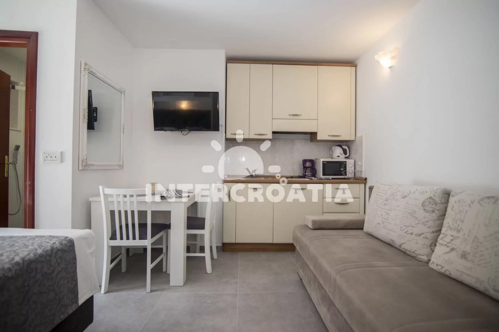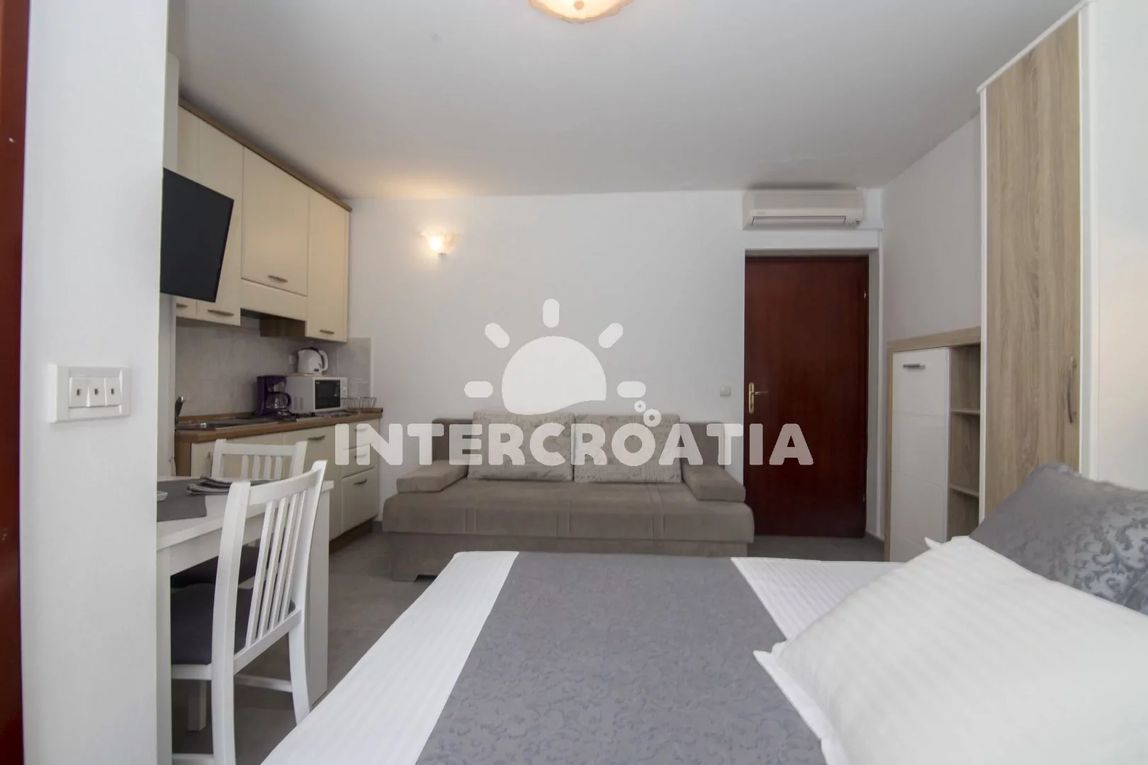 Hezky zařízený apartmán typu studio, s vlastním balkonem a výhledem do krajiny. Nachází se v prvním patře domu a je vhodný pro 2 až 3 osoby. Obývací místnost je spojena s kuchyní. Kuchyňská linka je vybavena dvouplotýnkovým sporákem, rychlovarnou konvicí, kávovarem, nádobím a lednicí s mrazákem. Obývací místnost s jídelním stolem, pohovkou (rozložitelná na extra lůžko pro 1 osobu), jedním dvoulůžkem, televizí se satelitním programem, sejfem, klimatizací a vstupem na balkon. Koupelna se sprchovým koutem, umyvadlem, fénem a wc. Hostům je k dispozici parkování u objektu zdarma.