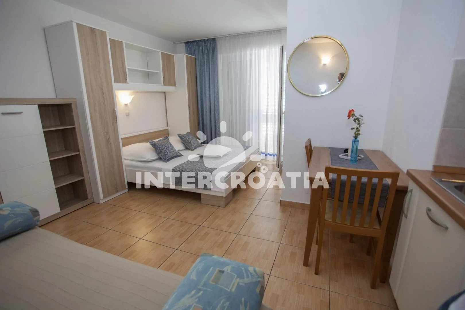 Vzdálenosti: Moře a pláž 350 m, centrum, lékárna, pošta, přístav, potápění, půjčovna motorových člunů 1 km, ambulance 1,4 km, supermarket 200 m, tenis 250 m, restaurace, bar 350 m, půjčovna kol 500 m, směnárna, veřejná doprava 80 m, banka, diskotéka, muzeum, trajekt 5 km, čerpací stanice 2,2 km, letiště 98 km.