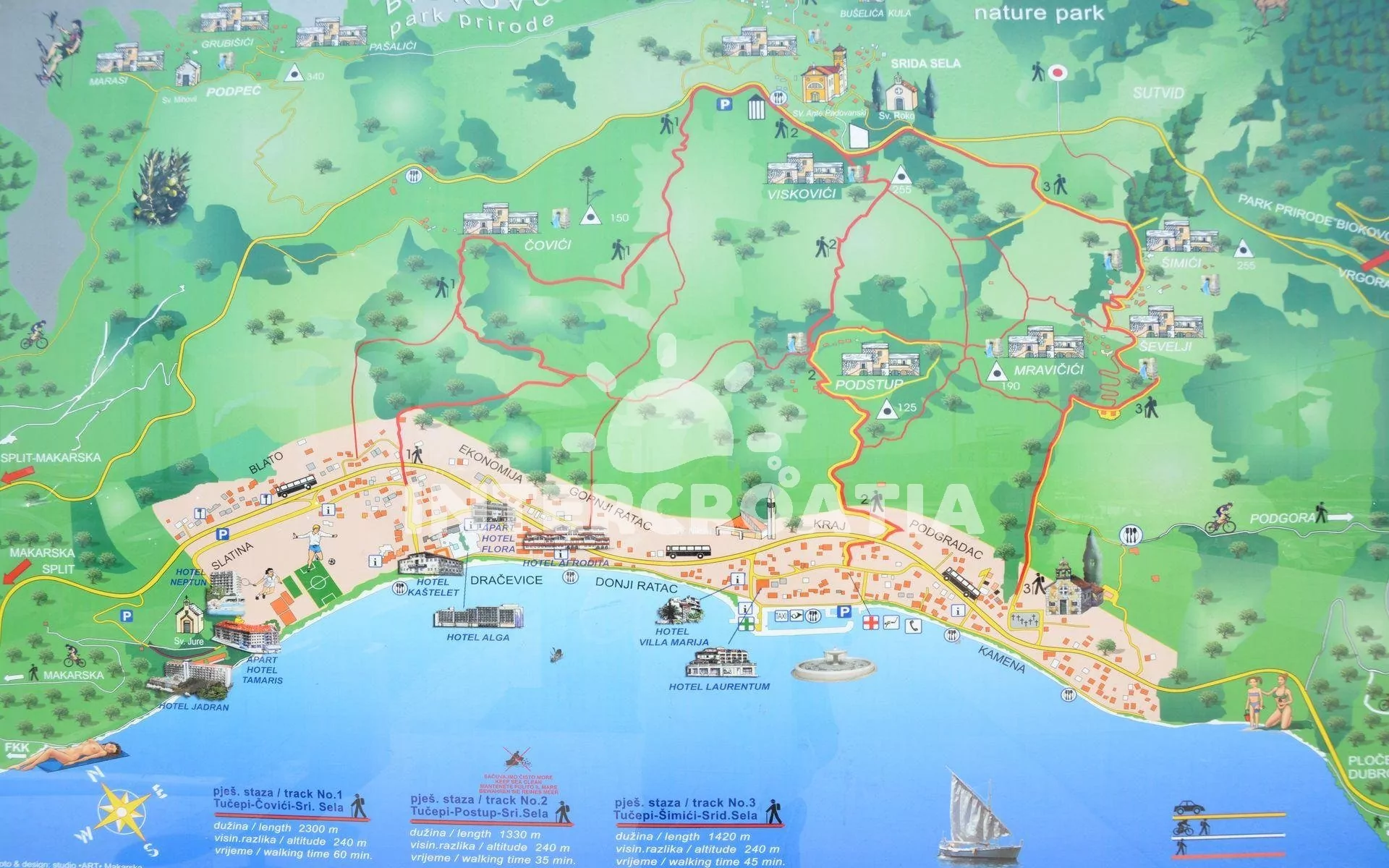Hledáte turistickou destinaci, kde budete spokojení s celou rodinou? Doporučujeme vám navštívit oblíbené Tučepi. Váš apartmán je situovaný 2 minuty pěšky od průzračně čistého moře a oblázkové pláže Kraj. Pláž je krásně prostorná a udržovaná, takže nabízí nejlepší podmínky ke kvalitnímu odpočinku. Do moře navíc vede pozvolný přístup, který zvládnou i mladší děti. Velkou výhodou je, že celé pobřeží lemují stromy, u kterých najdete krásný chládek. Po vydatném koupání si neváhejte pochutnat na občerstvení v restauracích. Příjemné kavárny zase lákají k posezení s přáteli. Oblázková pláž Lučica patří k dalším velmi oblíbeným turistickým místům. Připomínkou bohaté historie letoviska je kostel sv. Vida, kostel Narození Panny Marie a kostel sv. Jiří. Sousední vesničky se pyšní kostelem sv. Ante a 3 obrannými věžemi, které se jmenují Bušelićova, Lalićova a Šarićova. Milovníci pěší turistiky a cyklistiky se vydají do pohoří Biokovo. V pohoří můžete vidět bujnou vegetaci, která postupně přechází ze středomořské až do alpinské. Unikátní výhledy čekají všechny na vrcholu Sveti Jure. Festival Tučepské letní večery, slavnost na počest sv. Antonína a Den obce Tučepi pro turisty pořádají bohatý zábavný program. Noční život a rušnější atmosféru si užijete ve Splitu, Šibeniku a Makarske. Dalším tipem na celodenní výlet plný skvělých zážitků je Národní park Krka a Přírodní park Vranské jezero.
