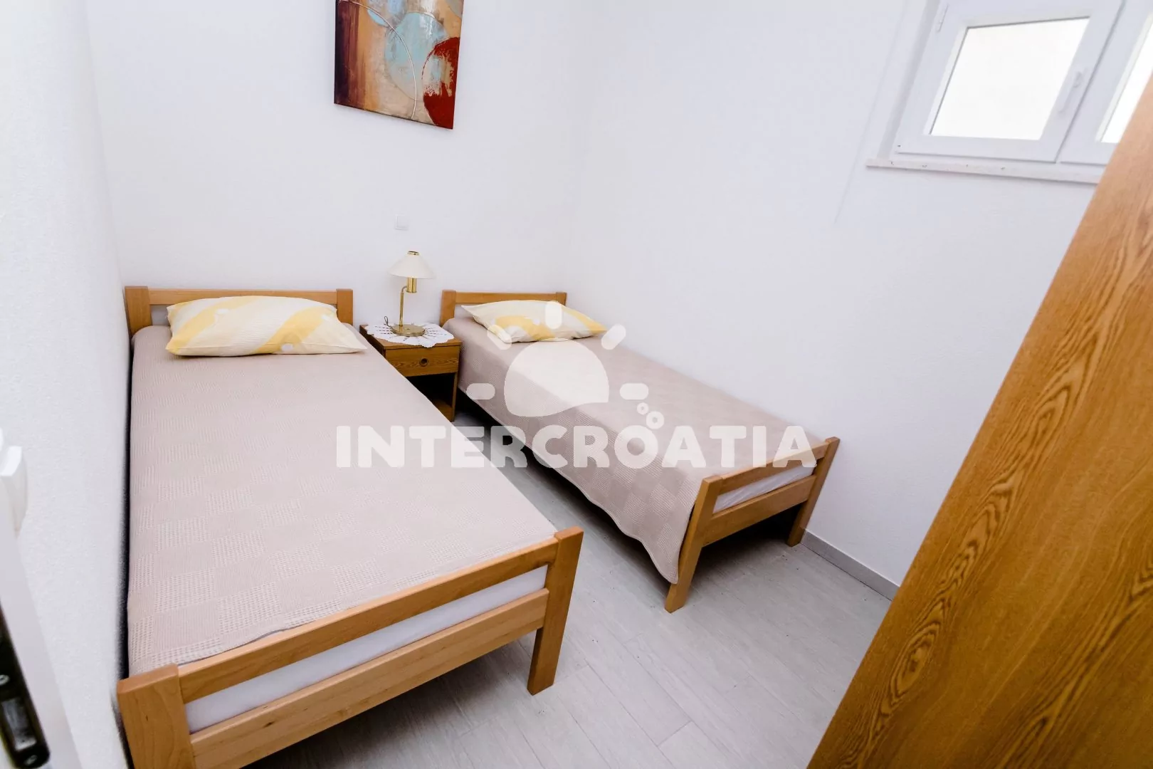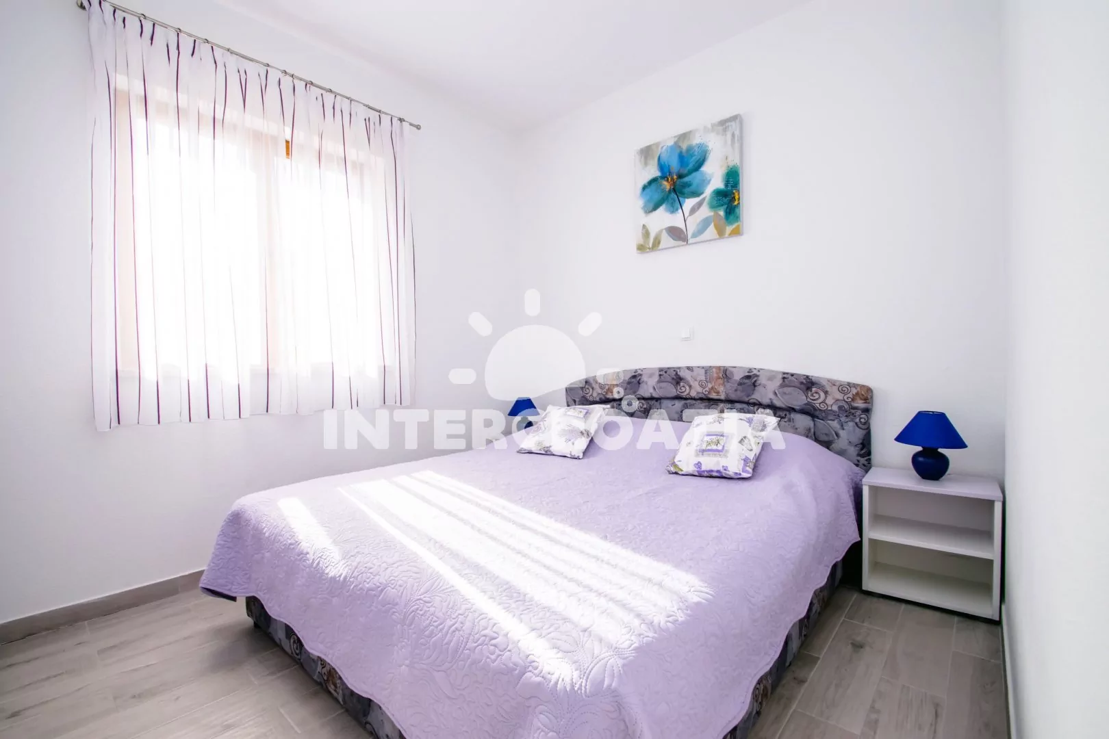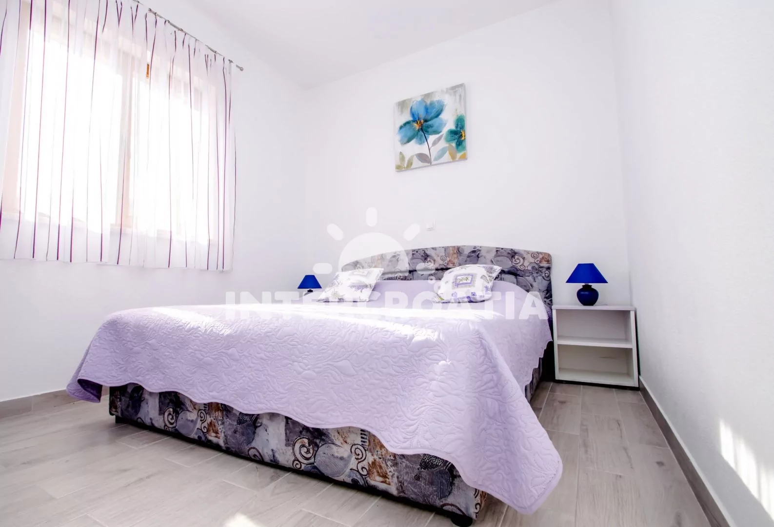Hezky zařízený bezbariérový apartmán, v přízemí s výhledem na moře a terasou s posezením je vhodný pro 4 až 5 osob. Obývací pokoj je spojený s kuchyní. Kuchyňská linka je vybavena sporákem, vestavěnou troubou, rychlovarnou konvicí, mikrovlnnou troubou, kávovarem, nádobím a lednicí s mrazákem. Obývací pokoj s jídelním stolem pro 4 osoby, televizí se satelitním programem, rozložitelnou pohovkou (extra lůžko pro 1 osobu), klimatizací a vstupem na terasu. První ložnice je vybavena jedním dvoulůžkem. Druhá ložnice s dvěma jednolůžky. Koupelna se sprchovým koutem, umyvadlem, fénem a wc. Dále je hostům k dispozici WiFi, žehlička, radio a parkování u objektu zdarma.
