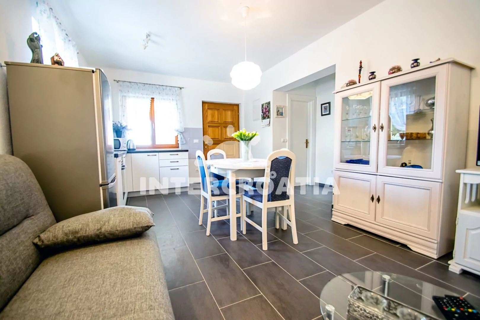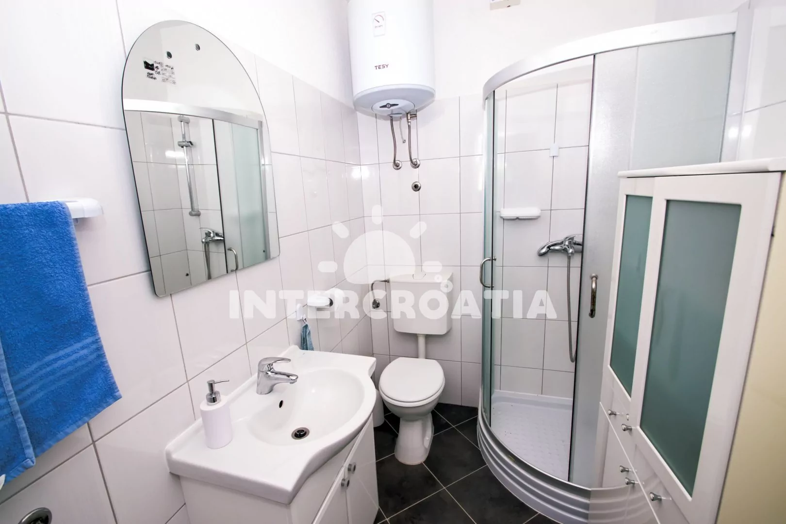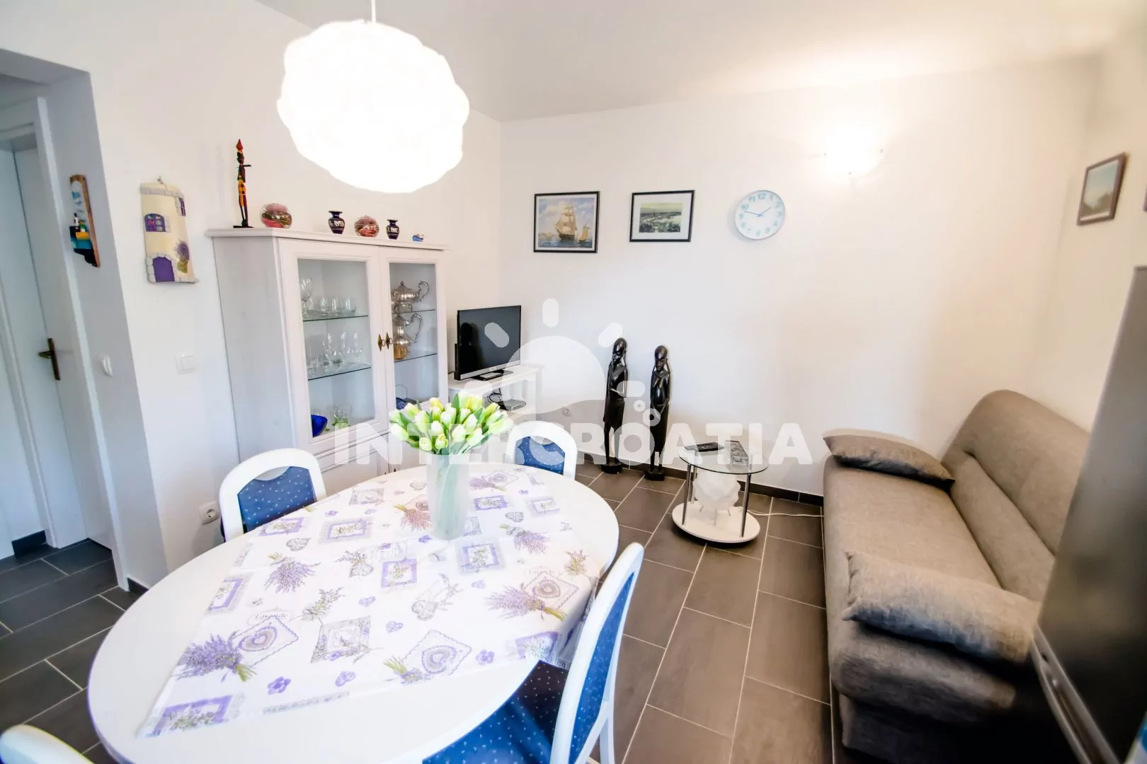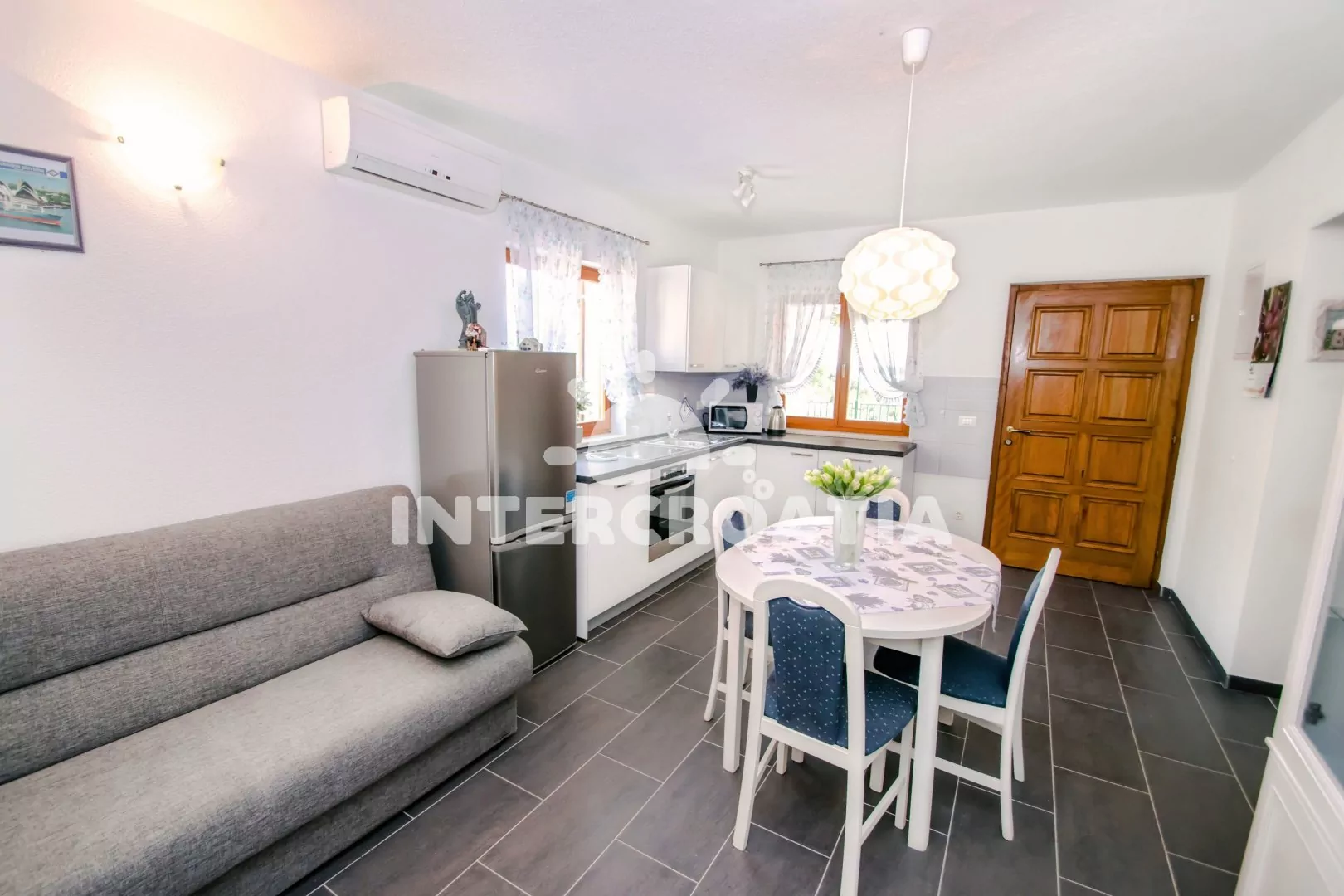 Hezky zařízený bezbariérový apartmán, v přízemí s výhledem na moře a terasou s posezením je vhodný pro 4 až 5 osob. Obývací pokoj je spojený s kuchyní. Kuchyňská linka je vybavena sporákem, vestavěnou troubou, rychlovarnou konvicí, mikrovlnnou troubou, kávovarem, nádobím a lednicí s mrazákem. Obývací pokoj s jídelním stolem pro 4 osoby, televizí se satelitním programem, rozložitelnou pohovkou (extra lůžko pro 1 osobu), klimatizací a vstupem na terasu. První ložnice je vybavena jedním dvoulůžkem. Druhá ložnice s dvěma jednolůžky. Koupelna se sprchovým koutem, umyvadlem, fénem a wc. Dále je hostům k dispozici WiFi, žehlička, radio a parkování u objektu zdarma.