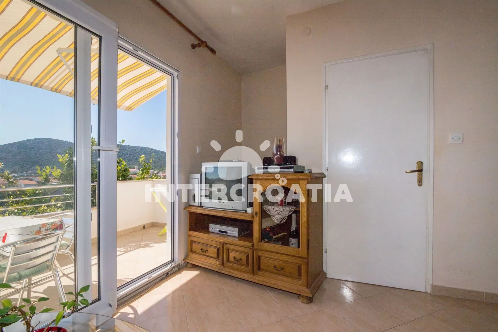 Apartmán s výhledem na moře se nachází v prvním patře a je vhodný pro 2 až 4 osoby. Obývací pokoj je spojený s kuchyní. Kuchyňská linka se sporákem, digestoří, troubou, rychlovarnou konvicí, nádobím a lednicí s mrazákem. Obývací pokoj s jídelním stolem pro 4 osoby, rohovou pohovkou (rozložitelná na extra lůžko pro 2 osoby), televizí, klimatizací a vstupem na terasu. Ložnice je vybavena jedním dvoulůžkem. Koupelna se sprchovým koutem, umyvadlem, bidetem a wc. Hosté mají k dispozici parkování u objektu zdarma.