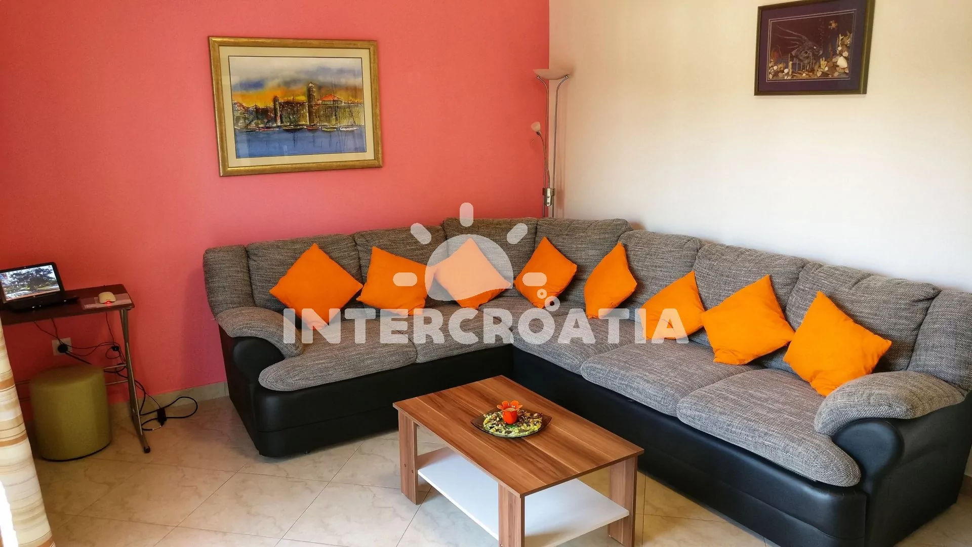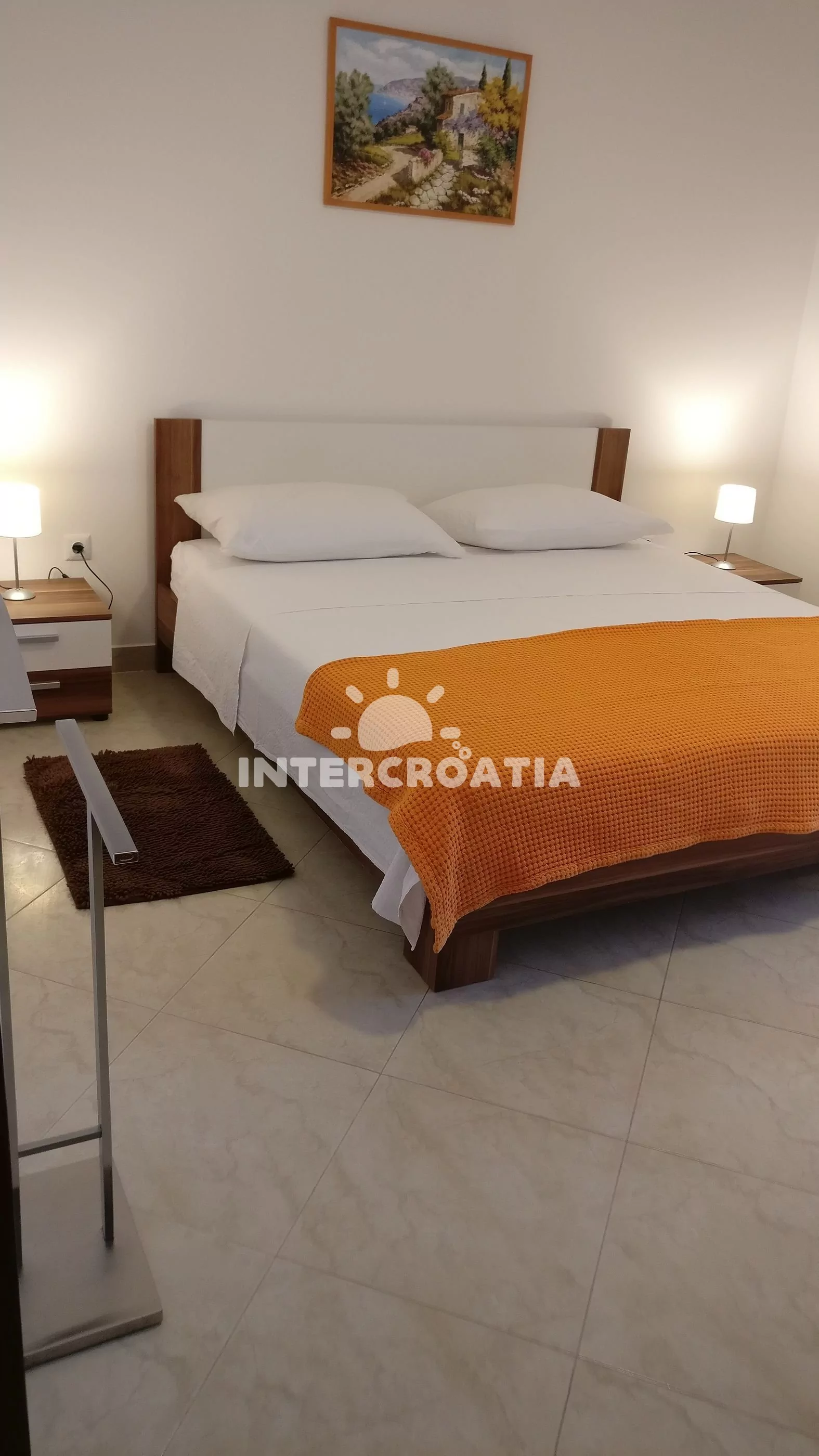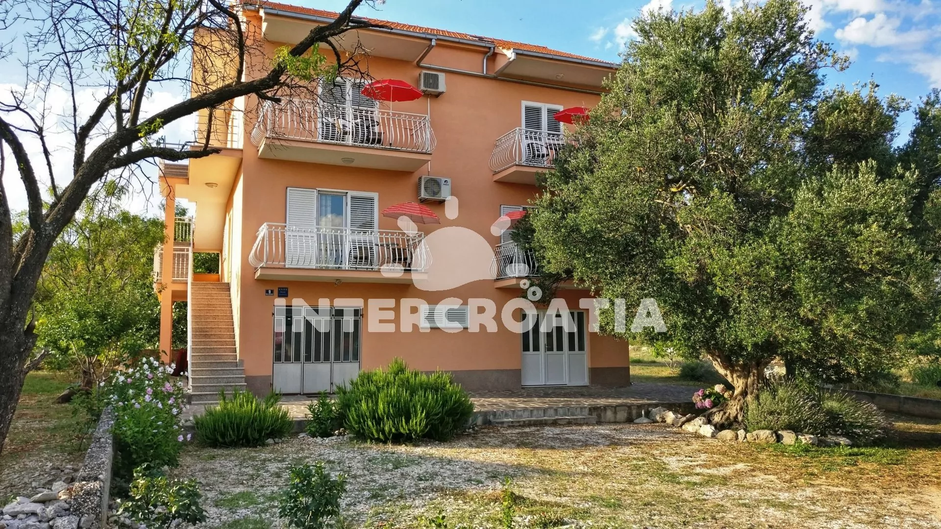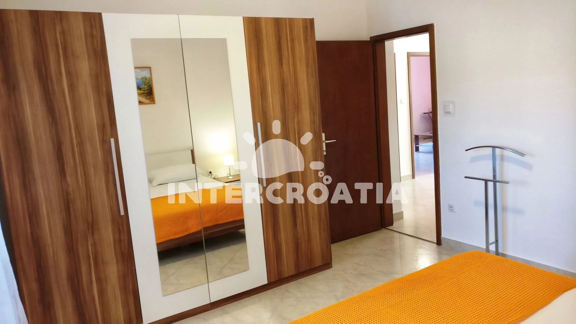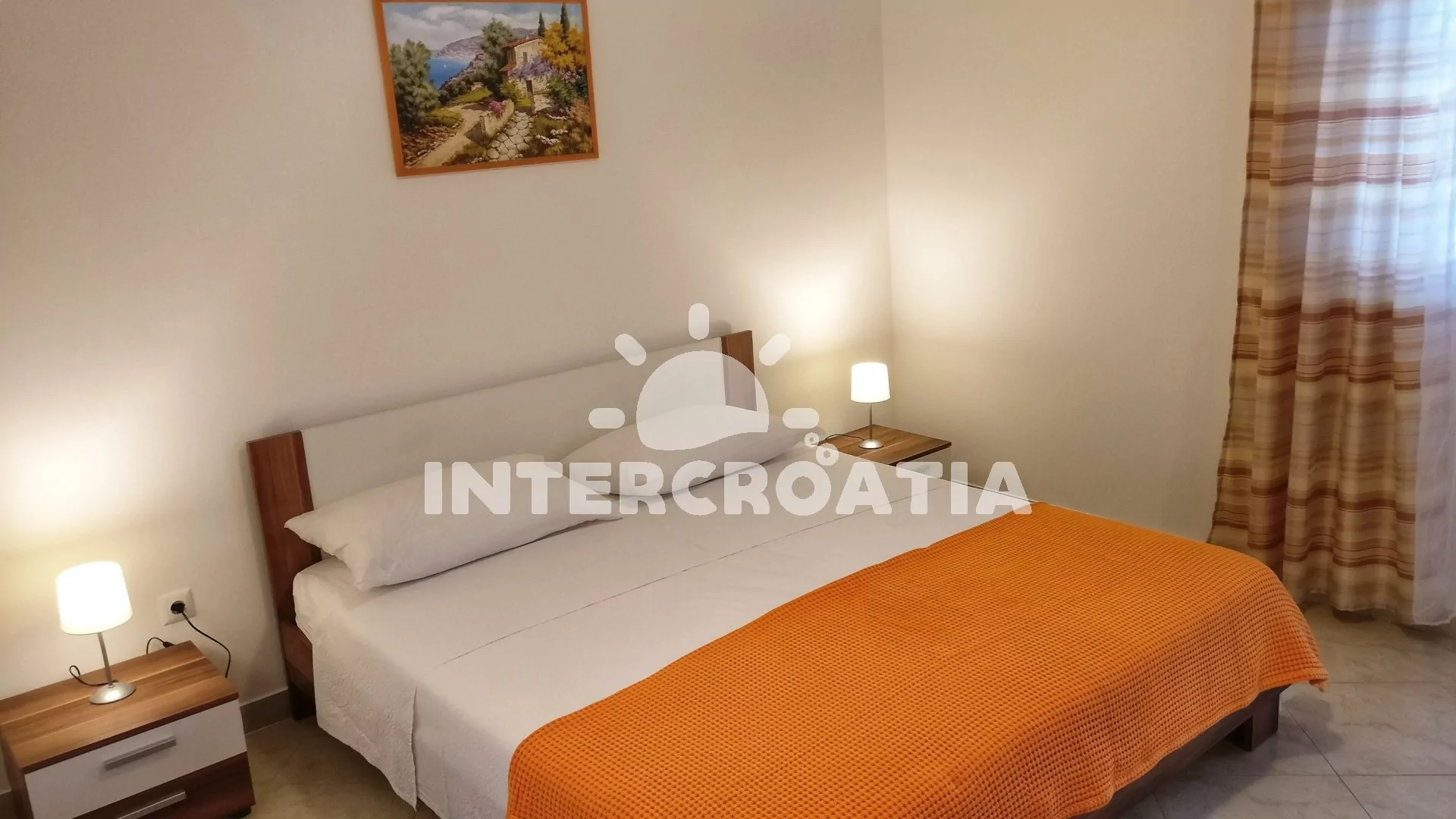 Velmi dobře vybavený apartmán v prvním patře vily s balkonem a výhledem na moře. Apartmán je vhodný pro 4 až 6 osob. Obývací pokoj je spojený s kuchyní. Kuchyňská linka je vybavena sklokeramickou varnou deskou, vestavěnou troubou, digestoří, myčkou na nádobí, mikrovlnnou troubou, kávovarem, rychlovarnou konvicí, toustovačem, nádobím a lednicí s mrazákem. Obývací pokoj s jídelním stolem pro 6 osob, rohovou pohovkou (rozložitelná na extra lůžko pro 2 osoby, televizí se satelitním programem, DVD přehrávačem, radiem, klimatizací a vstupem na balkon. První i druhá ložnice je vybavena vždy s jedním dvoulůžkem. První koupelna se sprchovým koutem, umyvadlem, fénem, pračkou, bidetem a wc. Druhá koupelna se sprchovým koutem, umyvadlem a wc. V apartmánu je sejf, žehlička a dětská postýlka. Hostům je k dispozici parkování u objektu zdarma.