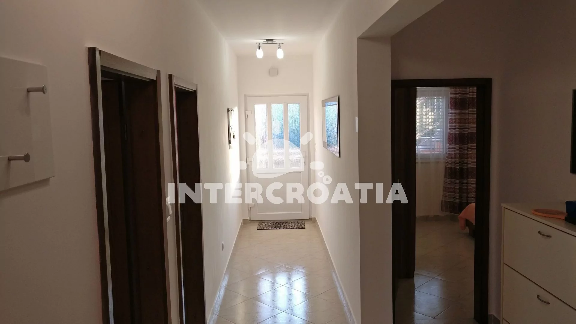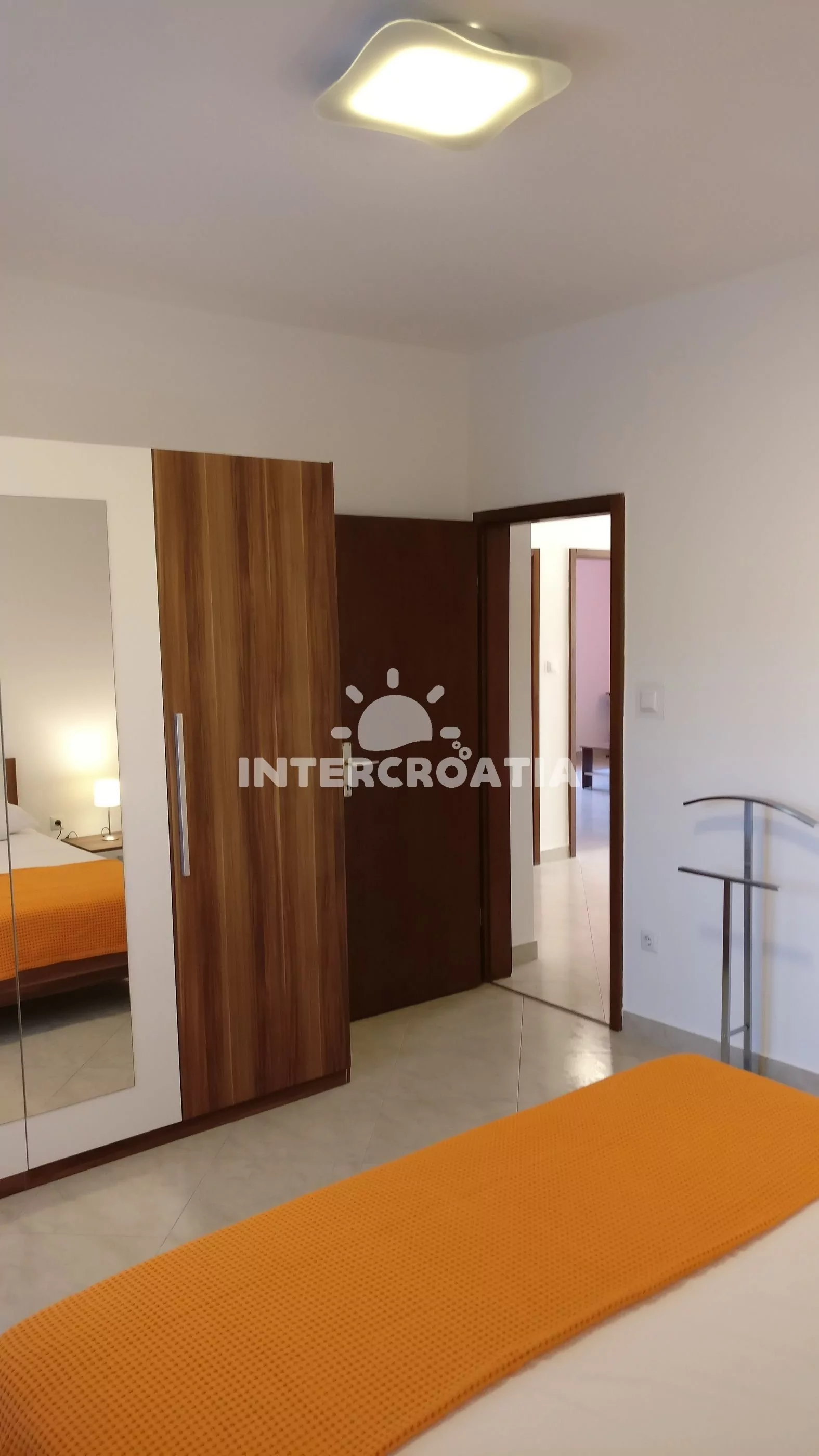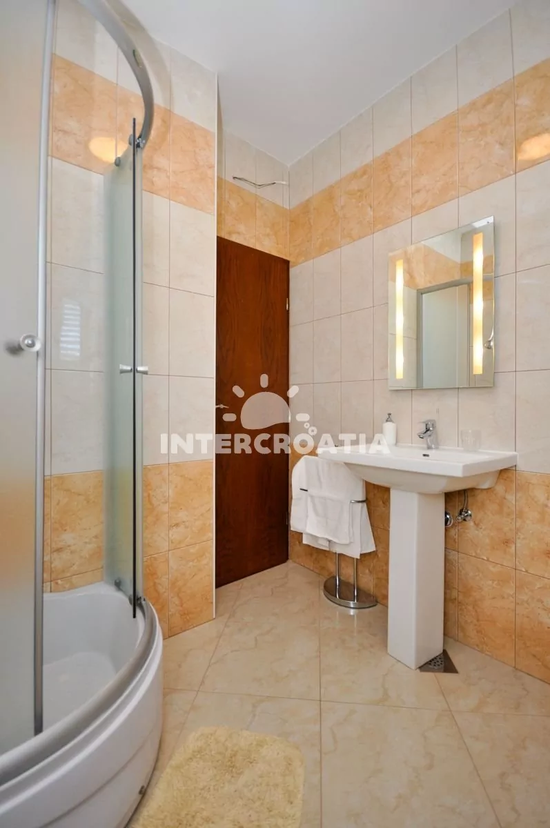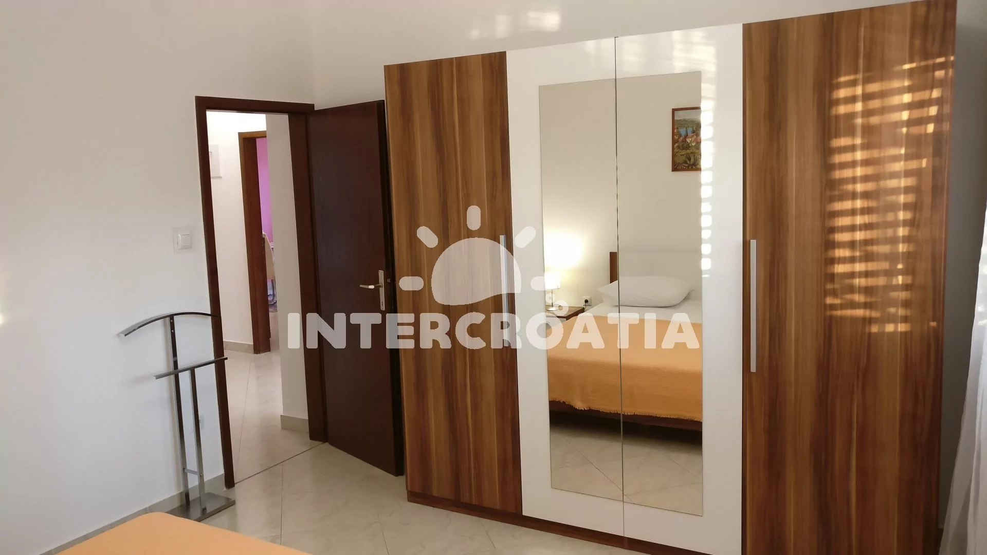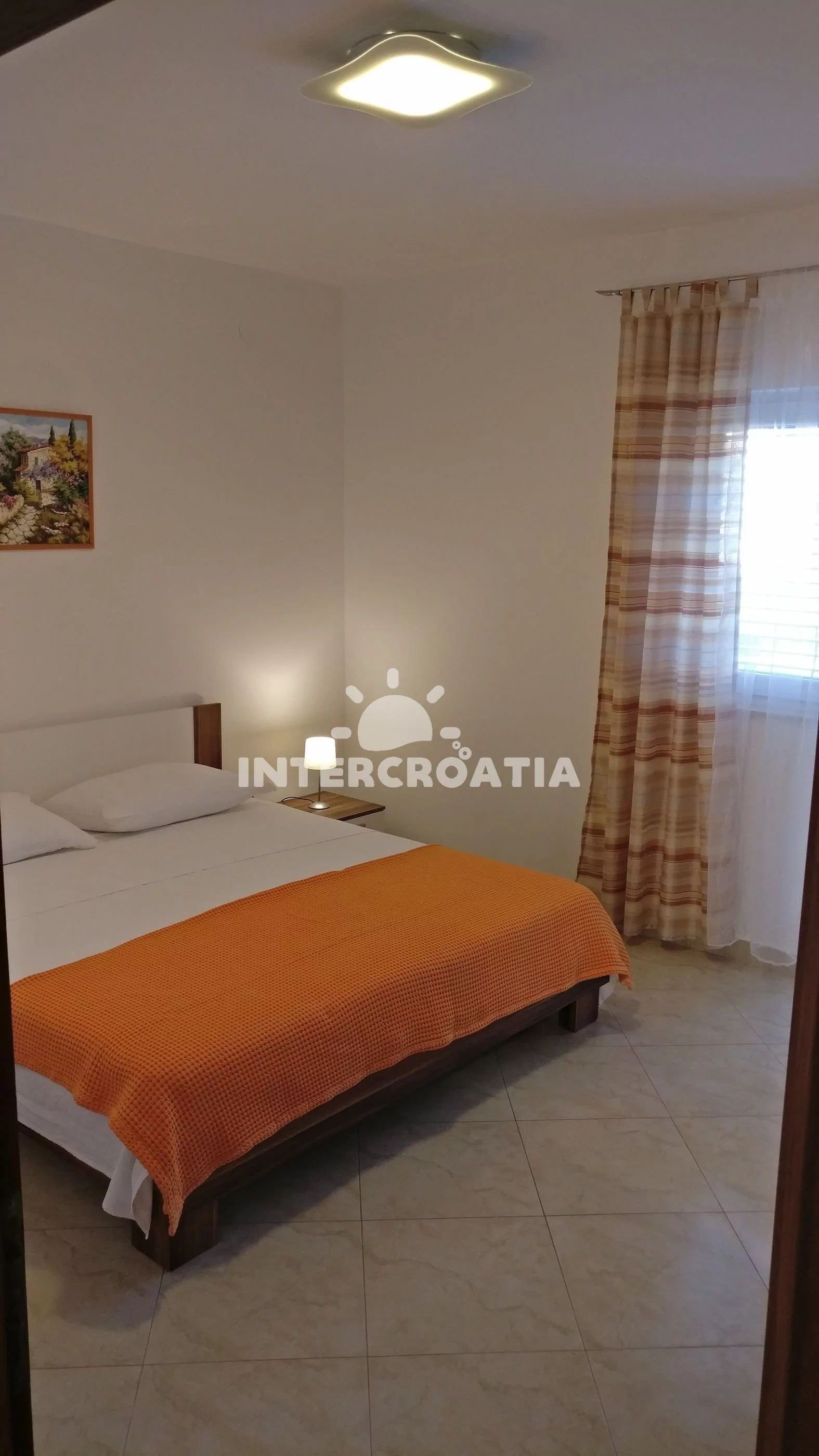 Velmi dobře vybavený apartmán v prvním patře vily s balkonem a výhledem na moře. Apartmán je vhodný pro 4 až 6 osob. Obývací pokoj je spojený s kuchyní. Kuchyňská linka je vybavena sklokeramickou varnou deskou, vestavěnou troubou, digestoří, myčkou na nádobí, mikrovlnnou troubou, kávovarem, rychlovarnou konvicí, toustovačem, nádobím a lednicí s mrazákem. Obývací pokoj s jídelním stolem pro 6 osob, rohovou pohovkou (rozložitelná na extra lůžko pro 2 osoby, televizí se satelitním programem, DVD přehrávačem, radiem, klimatizací a vstupem na balkon. První i druhá ložnice je vybavena vždy s jedním dvoulůžkem. První koupelna se sprchovým koutem, umyvadlem, fénem, pračkou, bidetem a wc. Druhá koupelna se sprchovým koutem, umyvadlem a wc. V apartmánu je sejf, žehlička a dětská postýlka. Hostům je k dispozici parkování u objektu zdarma.