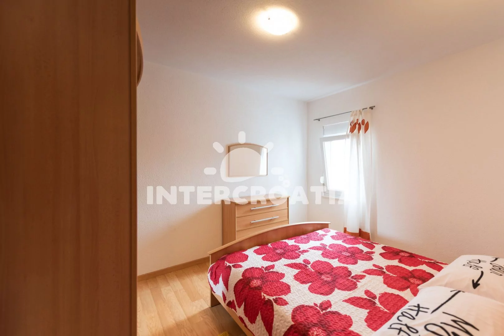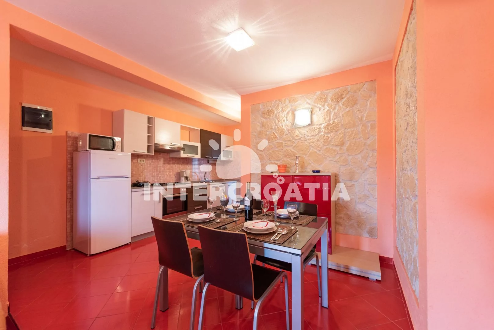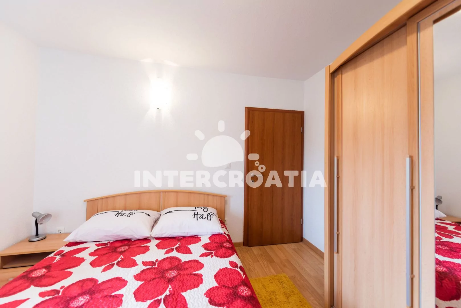 Moderně vybavený apartmán s balkonem a posezením se nachází v prvním patře vily a je vhodný pro 2 až 4 osoby. Obývací pokoj je spojený s kuchyní. Kuchyňská linka je vybavena varnou deskou, digestoří, troubou, myčkou na nádobí, mikrovlnnou troubou, rychlovarnou konvicí, nádobím a lednicí s mrazákem. Obývací pokoj s jídelním stolem pro 4 osoby, sedací soupravou, pohovkou (rozložitelná na extra lůžko pro 2 osoby), televizí se satelitním programem, DVD přehrávačem, radiem, klimatizací a vstupem na balkon. Ložnice je vybavena jedním dvoulůžkem. Koupelna se sprchovým koutem, umyvadlem, fénem, pračkou a wc. Hostům je k dispozici parkování u objektu zdarma.