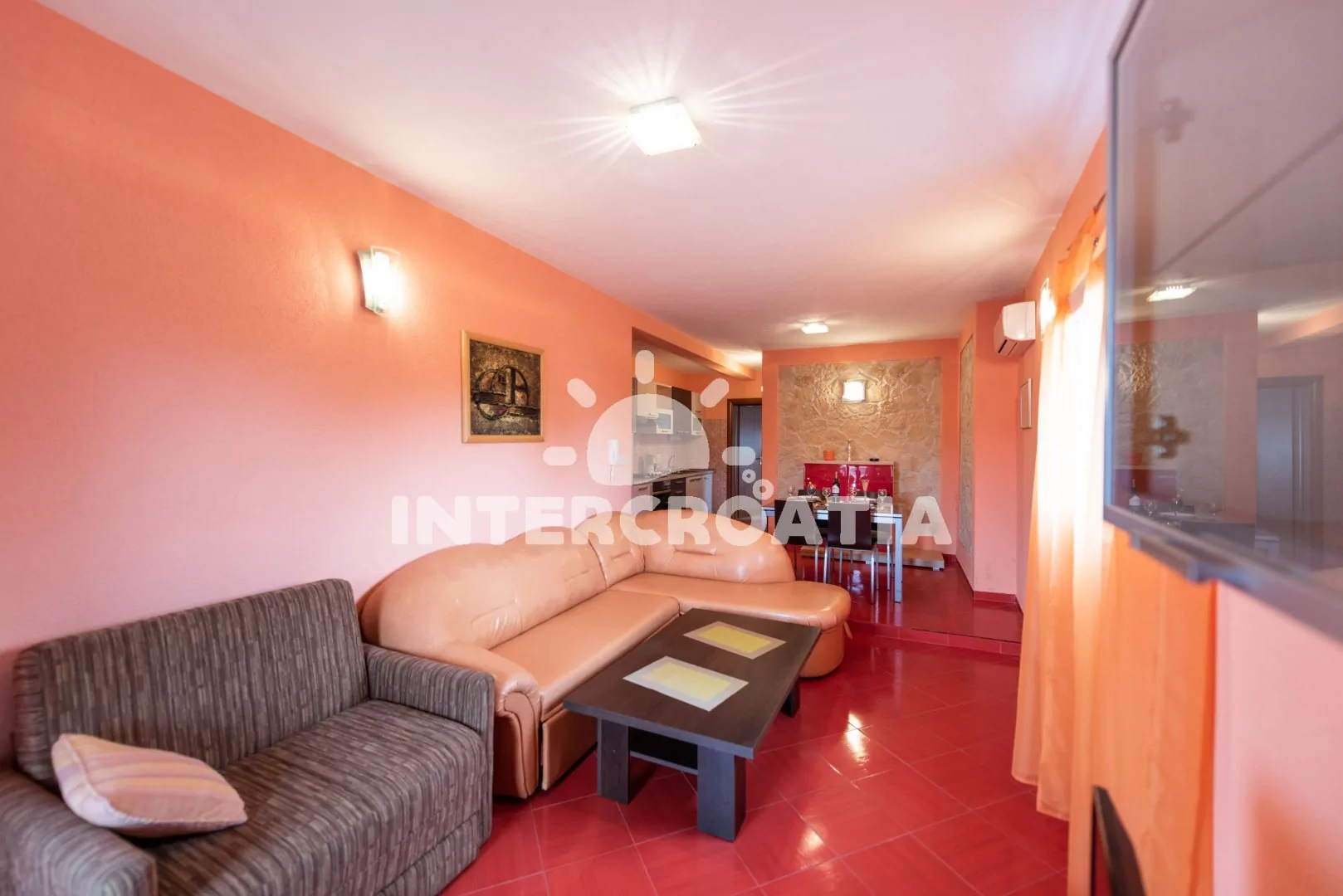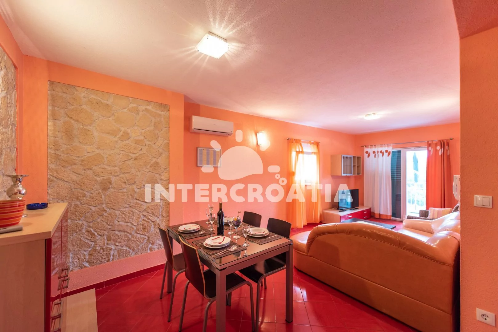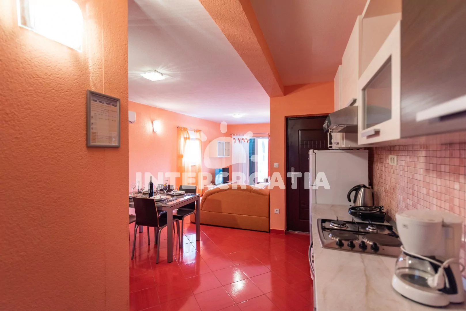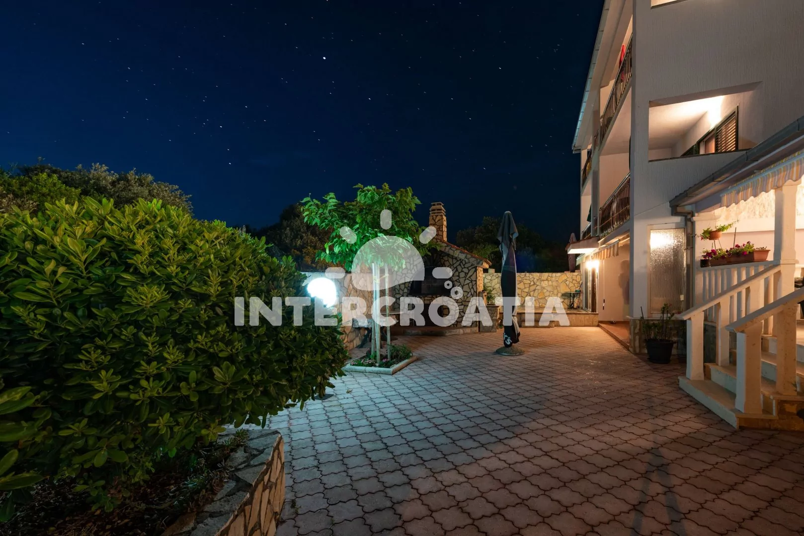 Moderně vybavený apartmán s balkonem a posezením se nachází v prvním patře vily a je vhodný pro 2 až 4 osoby. Obývací pokoj je spojený s kuchyní. Kuchyňská linka je vybavena varnou deskou, digestoří, troubou, myčkou na nádobí, mikrovlnnou troubou, rychlovarnou konvicí, nádobím a lednicí s mrazákem. Obývací pokoj s jídelním stolem pro 4 osoby, sedací soupravou, pohovkou (rozložitelná na extra lůžko pro 2 osoby), televizí se satelitním programem, DVD přehrávačem, radiem, klimatizací a vstupem na balkon. Ložnice je vybavena jedním dvoulůžkem. Koupelna se sprchovým koutem, umyvadlem, fénem, pračkou a wc. Hostům je k dispozici parkování u objektu zdarma.