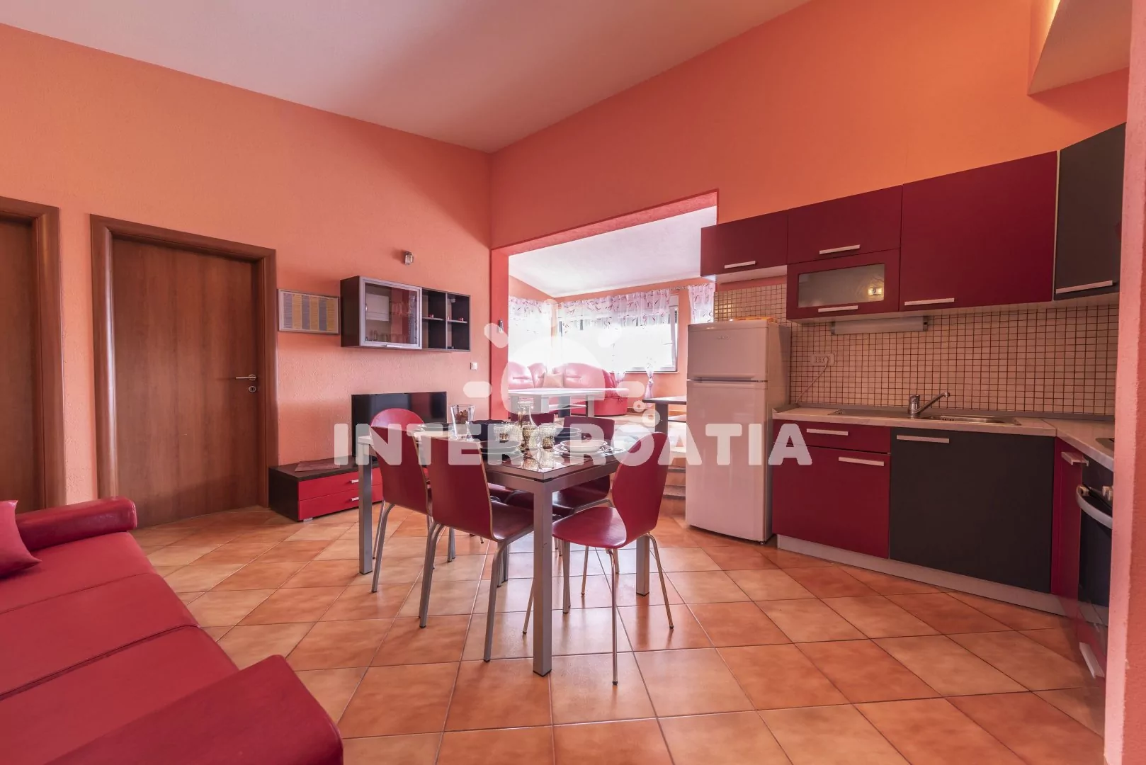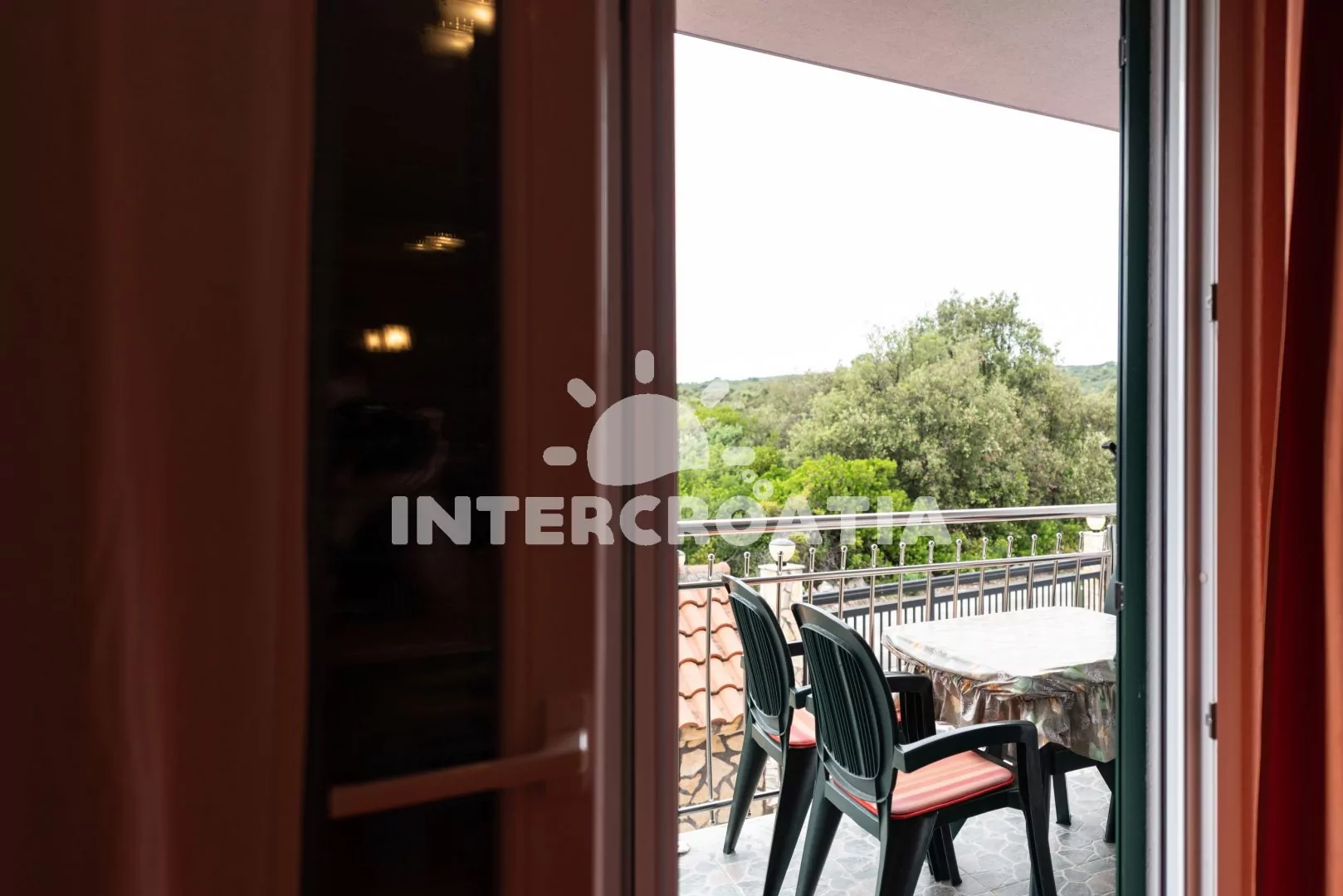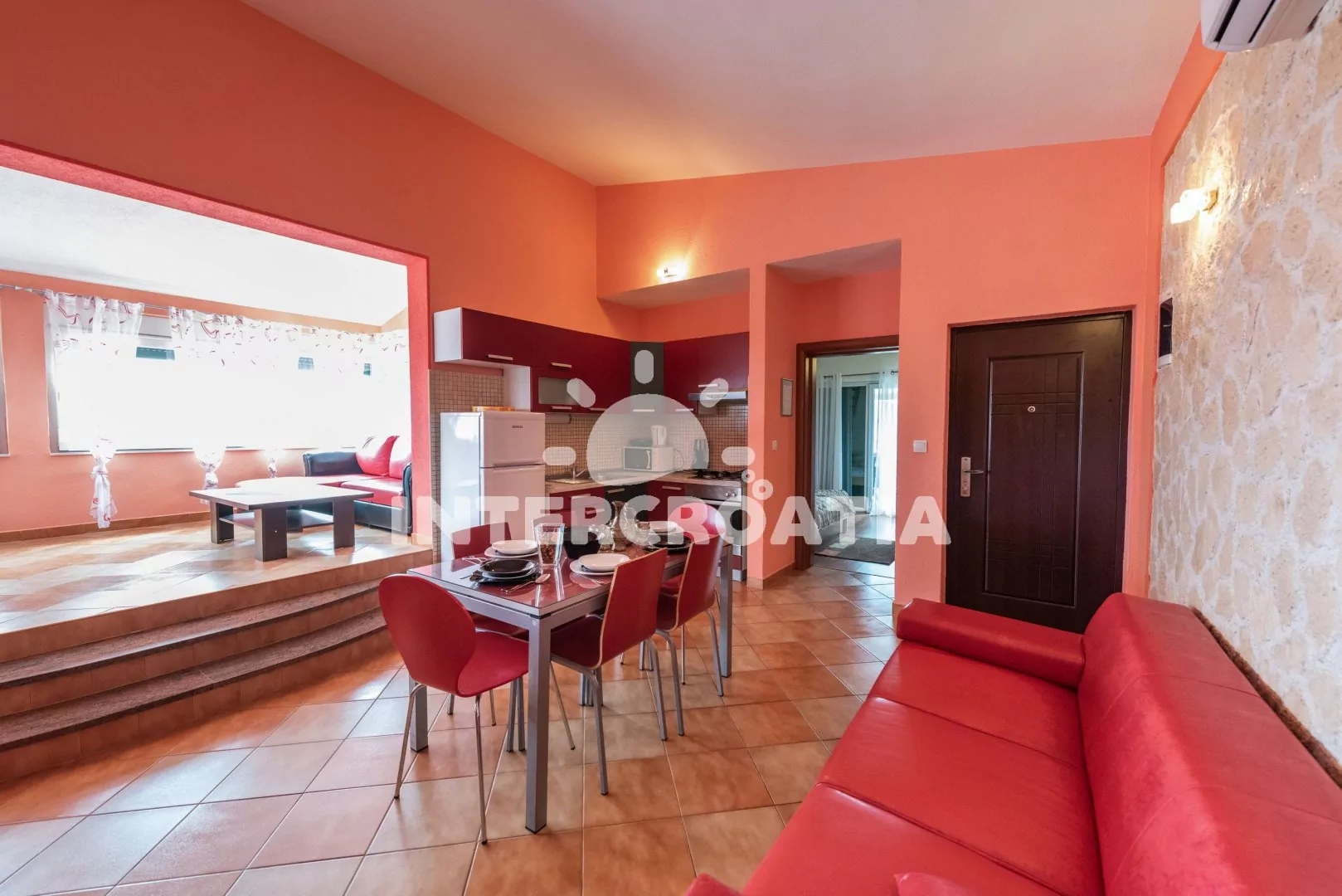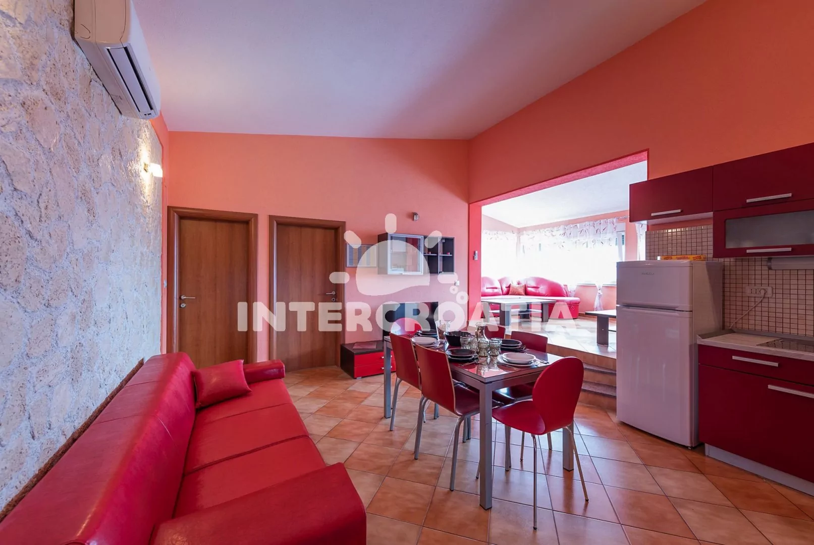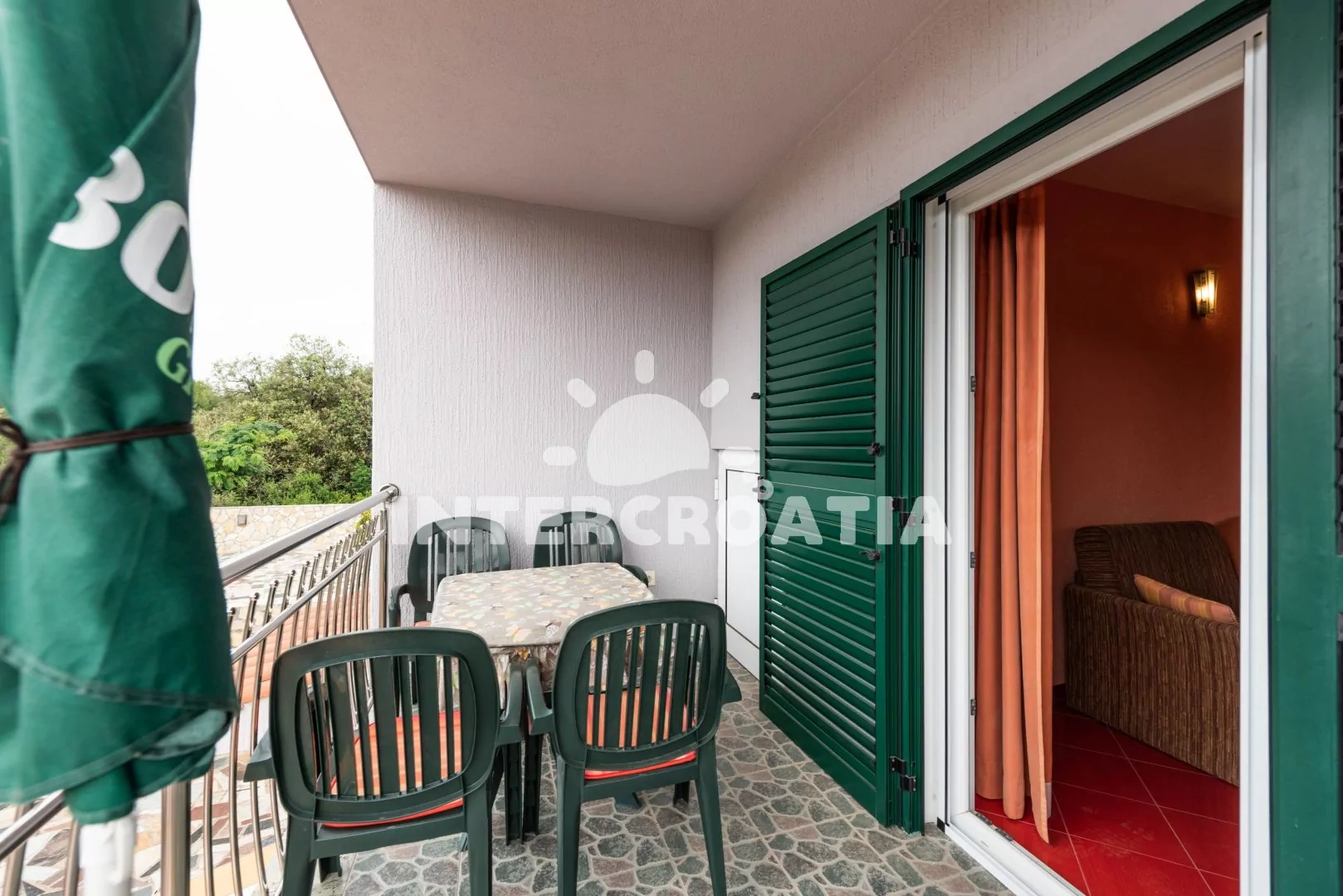 Velmi dobře a moderně vybavený apartmán (90 m2) s terasou a posezením se nachází v prvním patře vily a je vhodný pro 4 až 6 osob. Obývací pokoj je spojený s kuchyní. Kuchyňská linka je vybavena varnou deskou, digestoří, troubou, myčkou na nádobí, mikrovlnnou troubou, kávovarem, nádobím a lednicí s mrazákem. Obývací pokoj s jídelním stolem pro 6 osob, několika pohovkami (rozložitelné na extra lůžka), televizí se satelitním programem, DVD přehrávačem, radiem a klimatizací. První ložnice s dvoulůžkem a vstupem na terasu. Druhá ložnice s dvoulůžkem. Koupelna se sprchovým koutem, umyvadlem, fénem, pračkou a wc. Hostům je k dispozici parkování u objektu zdarma.