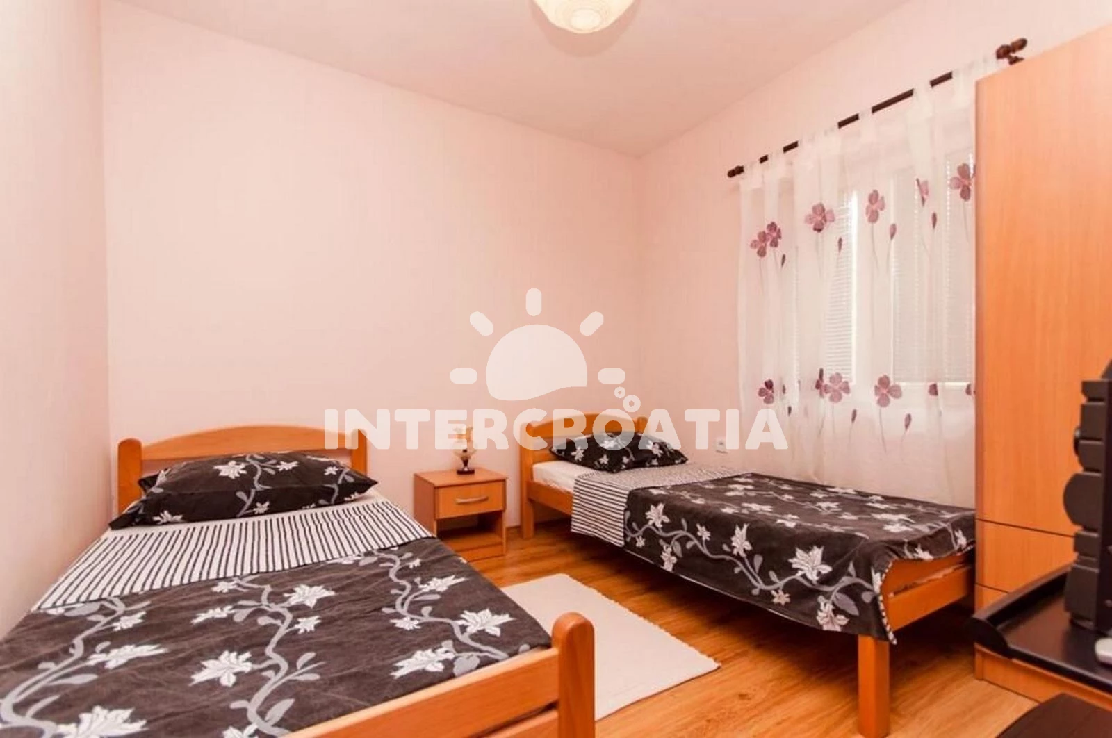 Apartmán (80 m2) v přízemí s vlastní terasou a posezením je vhodný pro až 6 osob. Obývací pokoj je spojený s kuchyní. Kuchyňská linka je vybavena varnou deskou, troubou, rychlovarnou konvicí, nádobím a lednicí s mrazákem. Obývací pokoj s jídelním stolem pro 6 osob, pohovkou, televizí, klimatizací a vstupem na terasu. První ložnice s jedním dvoulůžkem. Druhá a třetí ložnice je vybavena vždy s dvěma jednolůžky. Koupelna se sprchovým koutem, umyvadlem, fénem a wc. Hostům je k dispozici parkování u objektu zdarma.