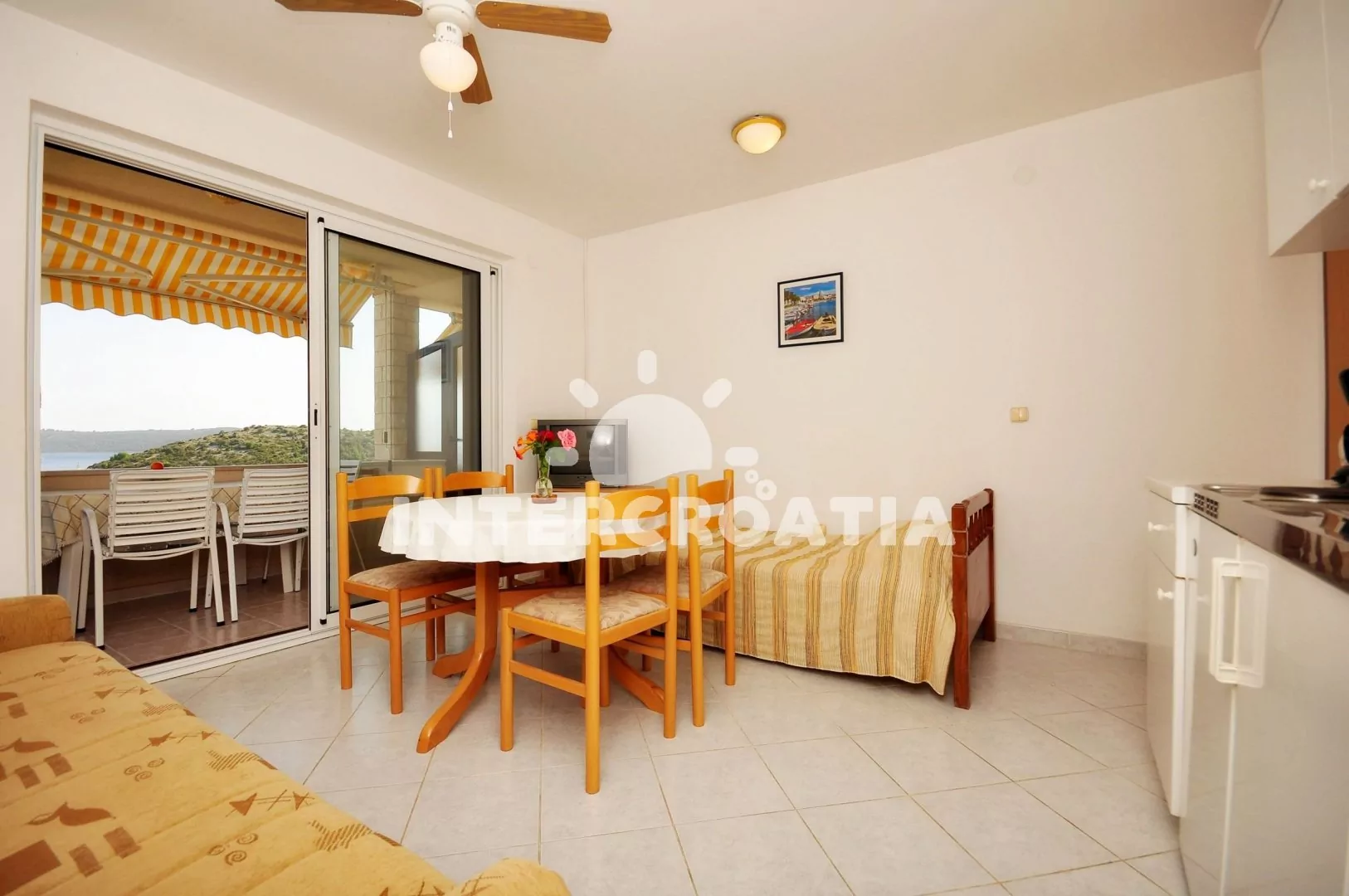 Apartmán (40 m2) s terasou a výhledem na moře se nachází v 1. patře domu a je vhodný pro 2 až 4 osoby. Obývací pokoj je spojený s kuchyní. Kuchyňská linka je vybavena dvouplotýnkovým vařičem, kávovarem, nádobím a lednicí s mrazákem. Obývací pokoj s jídelním stolem pro 4 osoby, pohovkou (rozložitelná na extra lůžko pro 2 osoby), televizí se satelitním programem, klimatizací a vstupem na terasu. Ložnice s dvoulůžkem. Koupelna se sprchovým koutem, umyvadlem a wc. Hostům je k dispozici parkování u objektu zdarma.