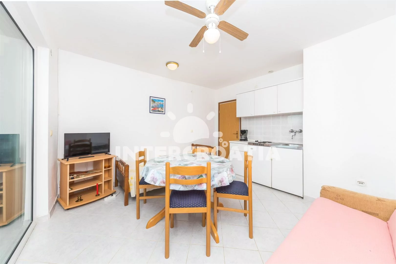 Vzdálenosti: Moře a betonová pláž 50 m, centrum 800 m, supermarket, restaurace, bar 500 m, přístav 600 m, pošta, směnárna 1 km, ambulance, lékárna, banka 8 km, tenis, diskotéka 18 km, čerpací stanice, muzeum 20 km, letiště 30 km, trajekt 48 km.