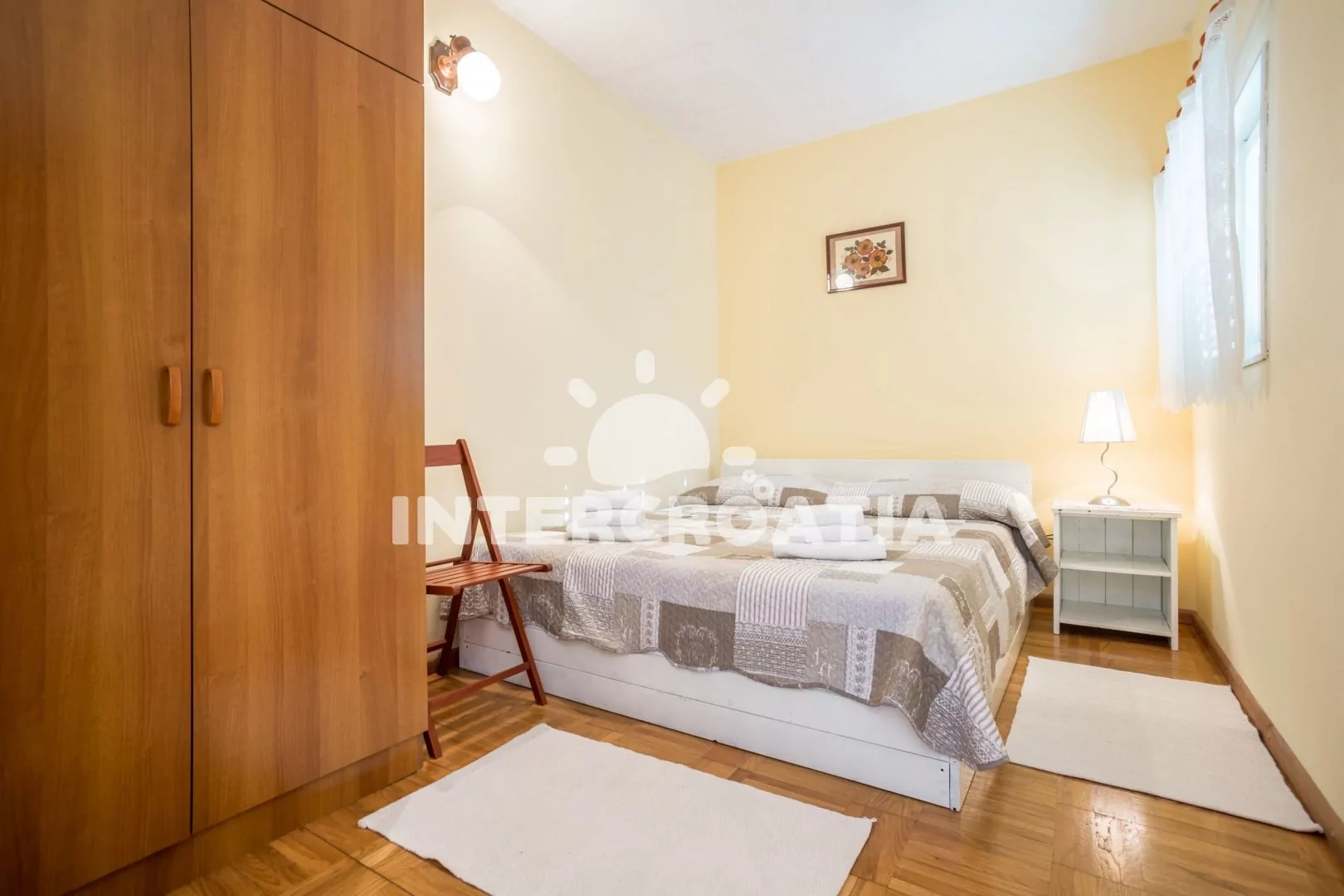 Apartmán (50 m2) s terasou a venkovním posezením se nachází v přízemí domu. Apartmán má 2 ložnice a je vhodný pro 4 až 5 osob. Obývací pokoj je spojený s kuchyní. Kuchyňská linka je vybavena sporákem s troubou, rychlovarnou konvicí, kávovarem, toustovačem, nádobím a lednicí s mrazákem. Obývací pokoj s jídelním stolem, pohovkou (rozložitelná na extra lůžko pro 1 osobu), televizí, rádiem, klimatizací a vstupem na terasu. První ložnice s jedním dvoulůžkem. Druhá ložnice s dvěma jednolůžky. Koupelna se sprchovým koutem, umyvadlem, fénem a wc. Hostům je k dispozici parkování u objektu zdarma.