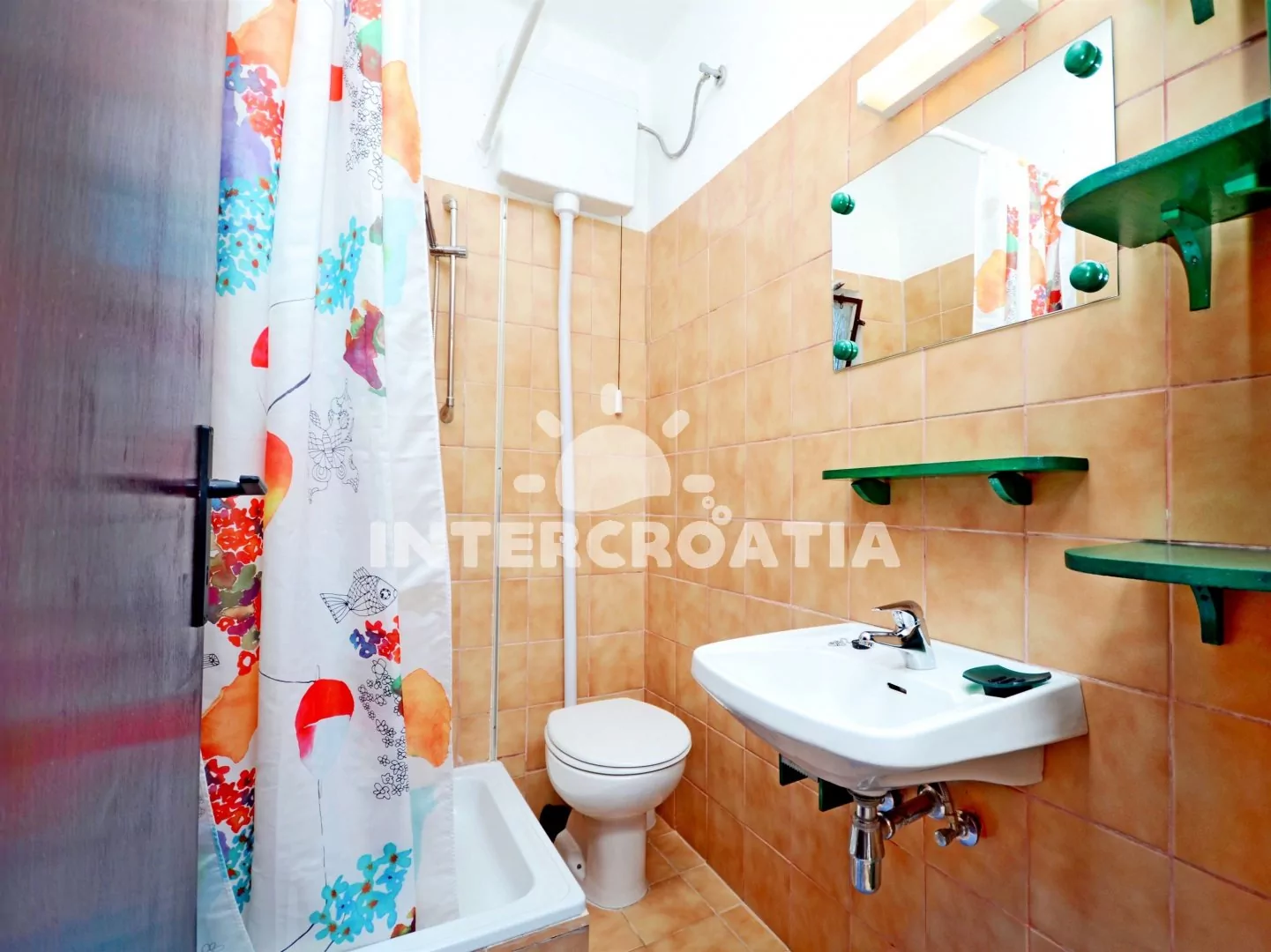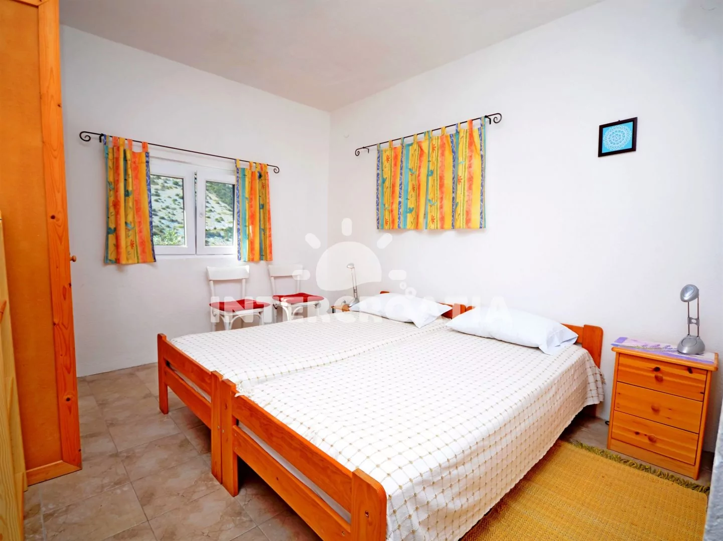 Apartmán (55 m2) s terasou, posezením a výhledem na moře se nachází v 1. patře domu. Apartmán má 2 ložnice, 2 koupelny a je vhodný pro 4 až 6 osob. Obývací pokoj je spojený s kuchyní. Kuchyňská linka je vybavena sporákem s troubou, myčkou na nádobí, mikrovlnou troubou, toustovačem, rychlovarnou konvicí, nádobím a lednicí s mrazákem. Obývací pokoj s jídelním stolem, pohovkami (rozložitelná na extra lůžko pro 2 osoby), televizí se satelitním programem, rádiem, klimatizací a vstupem na terasu. První ložnice s dvoulůžkem a vstupem na terasu. Druhá ložnice s dvěma jednolůžky. Dvě koupelny se sprchovým koutem, umyvadlem a wc. Hostům je k dispozici parkování u objektu zdarma.