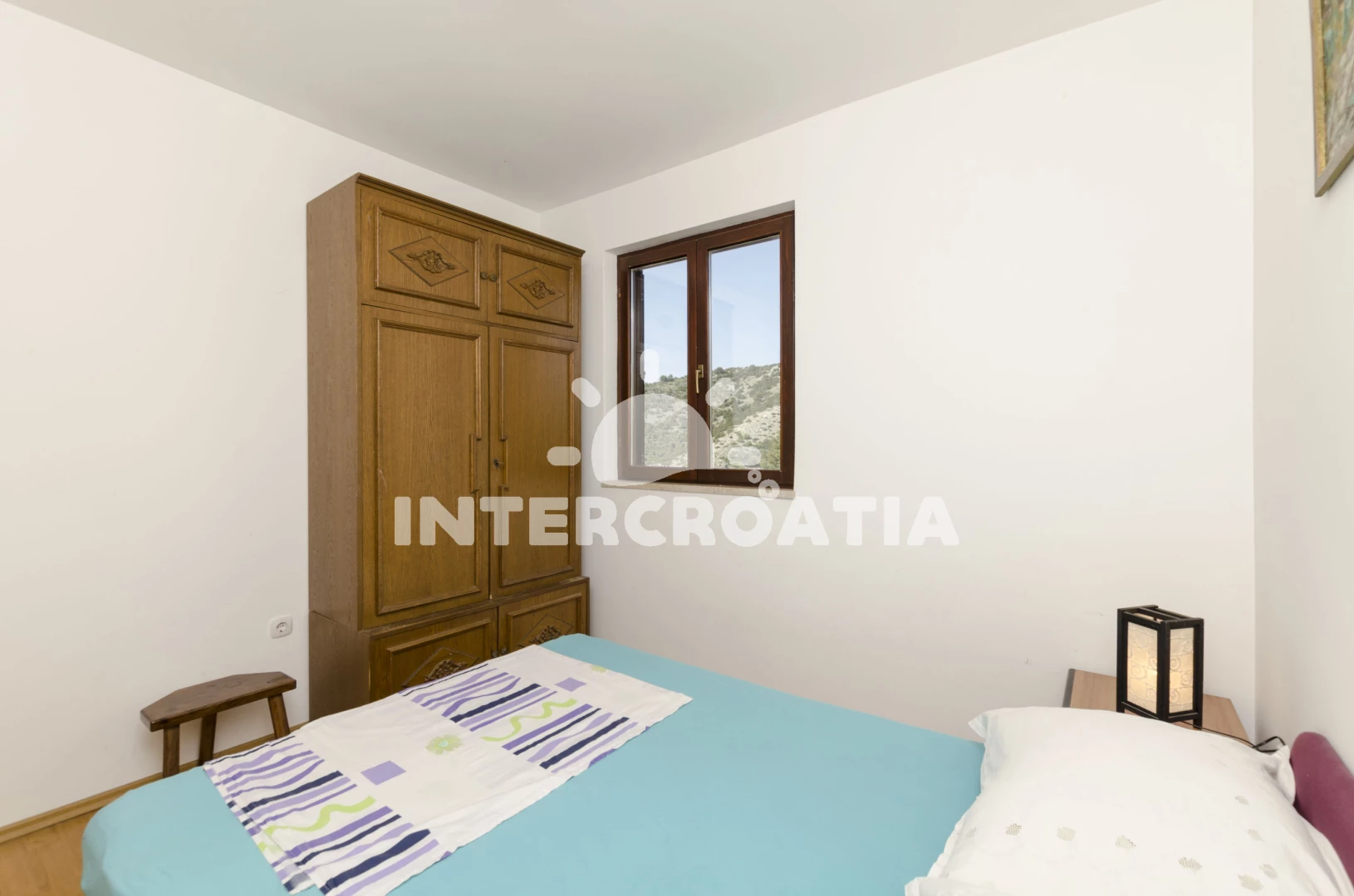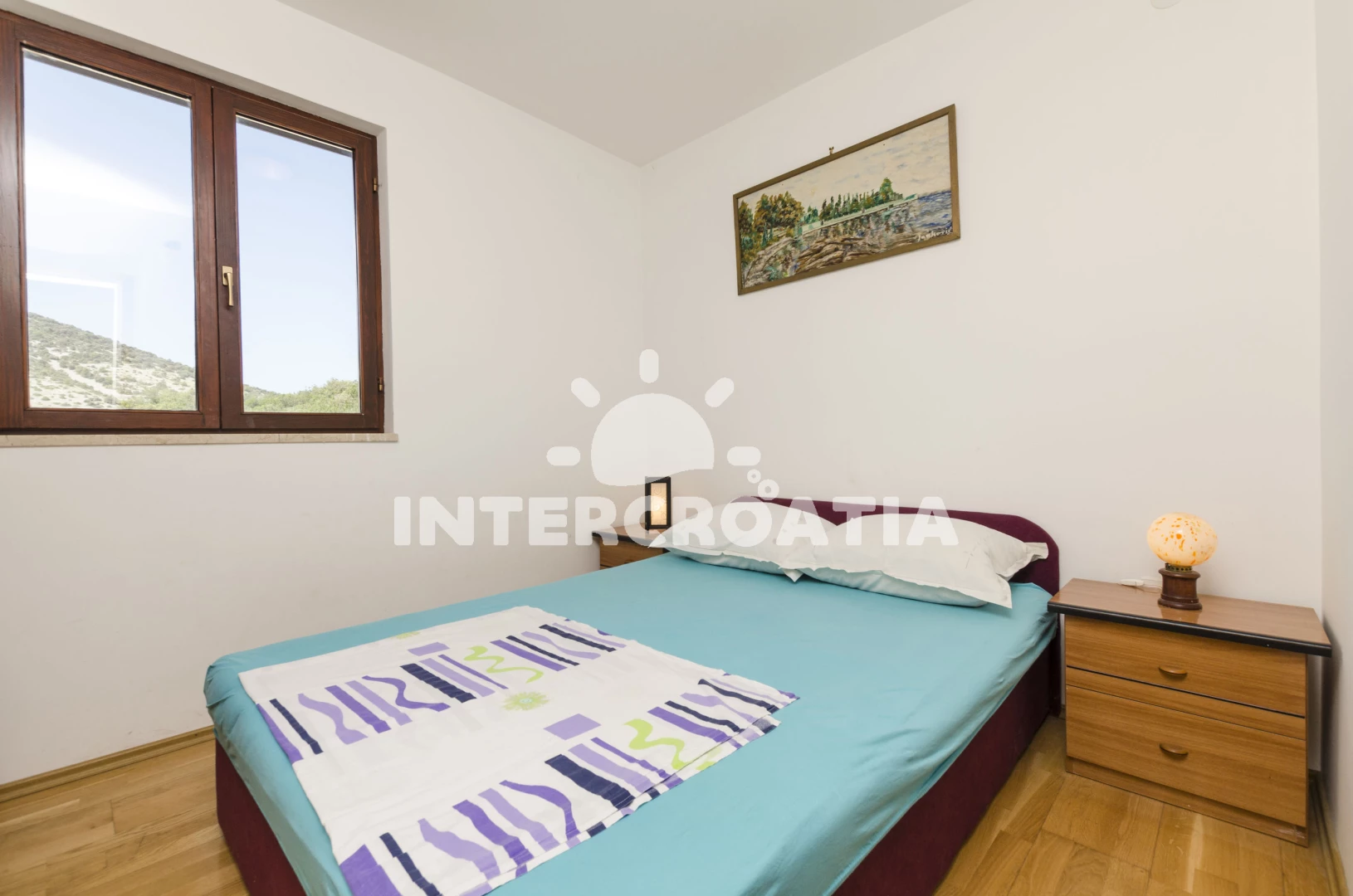 Apartmán (40 m2) s terasou a výhledem na moře se nachází v 1. patře domu. Apartmán má 1 ložnici a je vhodný pro až 4 osoby. Obývací pokoj je spojený s kuchyní. Kuchyňská linka je vybavena dvouplotýnkovým vařičem, kávovarem, nádobím a lednicí s mrazákem. Obývací pokoj s jídelním stolem, dvěma přistýlkami, televizí se satelitním programem, klimatizací a vstupem na terasu. Ložnice s dvoulůžkem. Koupelna se sprchovým koutem, umyvadlem a wc. Hostům je k dispozici parkování u objektu zdarma.