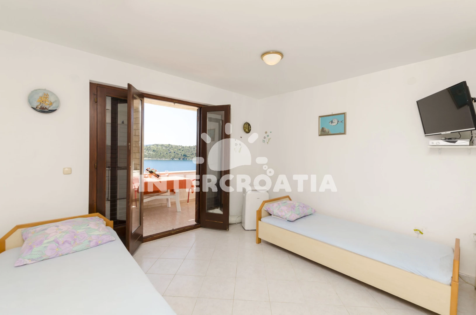 Vzdálenosti: Moře a betonová pláž 50 m, centrum 800 m, supermarket, restaurace, bar 500 m, přístav 600 m, pošta, směnárna 1 km, ambulance, lékárna, banka 8 km, tenis, diskotéka 18 km, čerpací stanice, muzeum 20 km, letiště 30 km, trajekt 48 km.