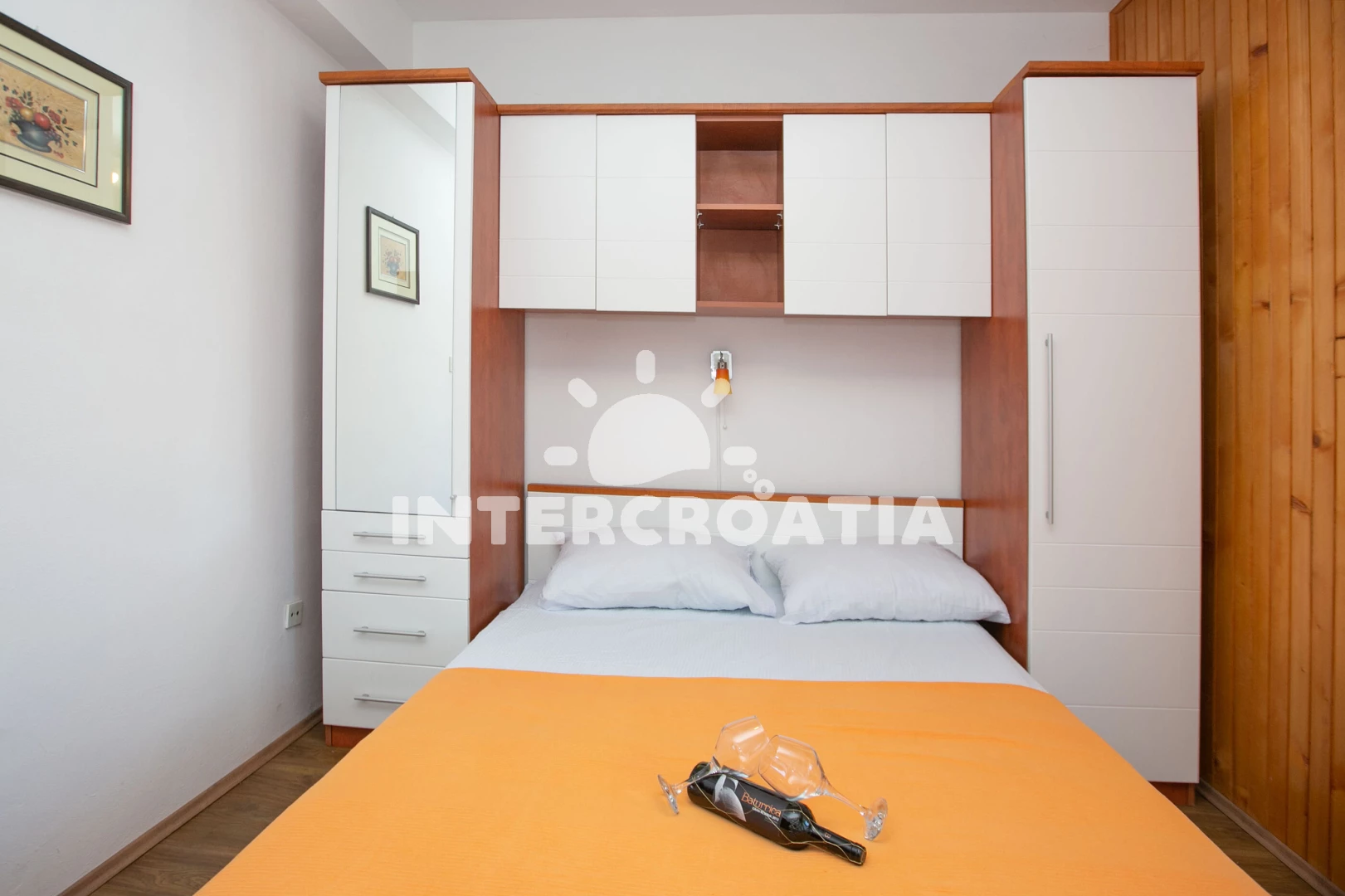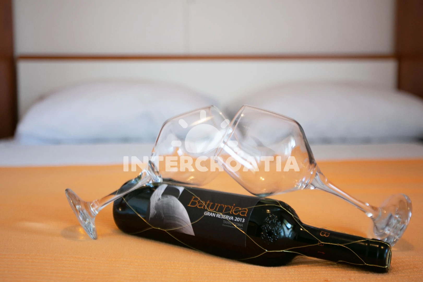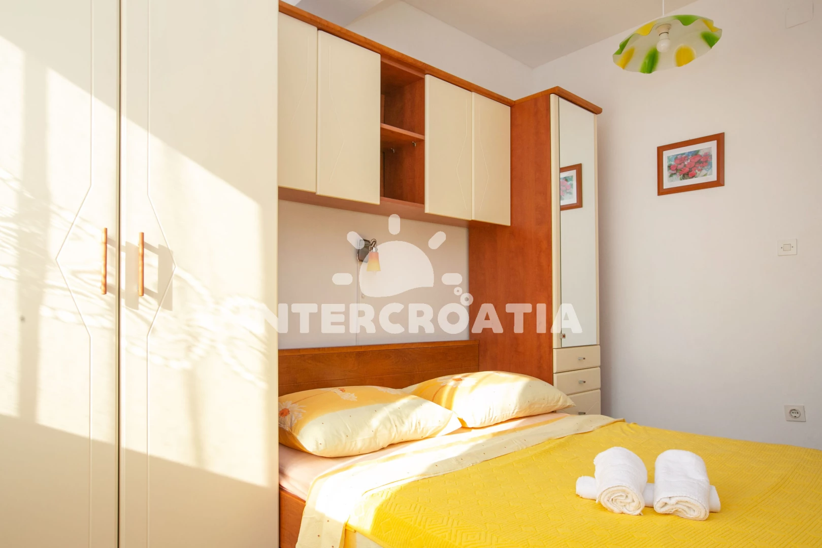 Apartmán (50 m2) s balkonem, a výhledem na moře. Nachází se ve 2. patře objektu. Apartmán má 2 ložnice a je vhodný pro až 4 osoby. Kuchyňská linka je vybavena varnou deskou, troubou, kávovarem, rychlovarnou konvicí, nádobím, lednicí, mrazákem. K dispozici televize, žehlička. První ložnice s dvoulůžkem. Druhá ložnice s dvoulůžkem. Koupelna se sprchovým koutem, umyvadlem, fénem a WC.