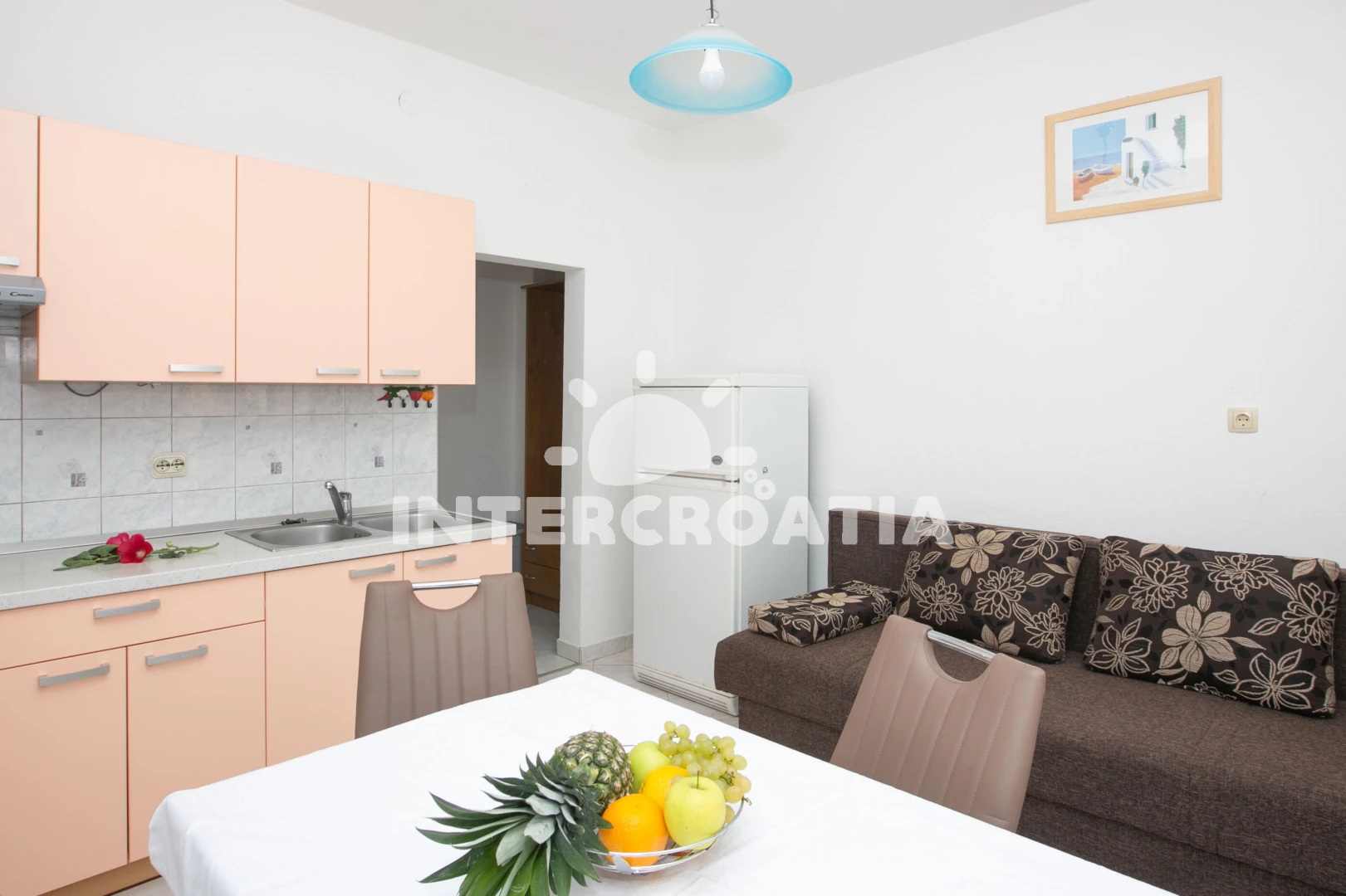 Apartmán (40 m2) s balkonem, a výhledem na moře. Nachází se v 1. patře objektu. Apartmán má 1 ložnici a je vhodný pro až 4 osoby. Kuchyňská linka je vybavena varnou deskou, troubou, kávovarem, rychlovarnou konvicí, nádobím, lednicí, mrazákem. V obývací místnosti je rozložitelná pohovka (extra lůžko pro 2 osoby). K dispozici televize se satelitním programem, žehlička. Ložnice s dvoulůžkem. Koupelna se sprchovým koutem, umyvadlem, WC.