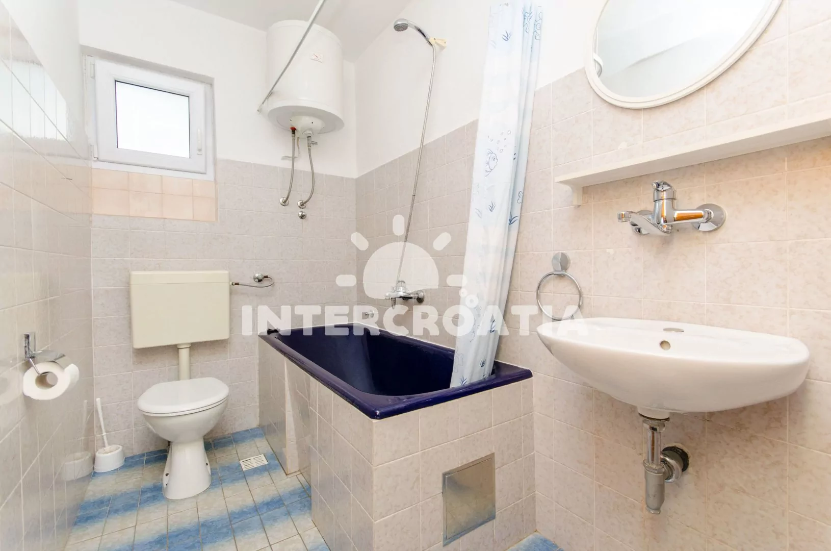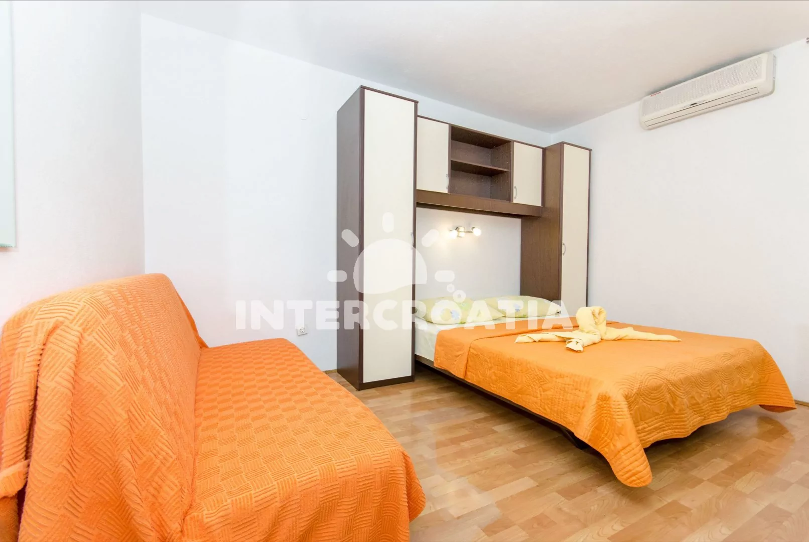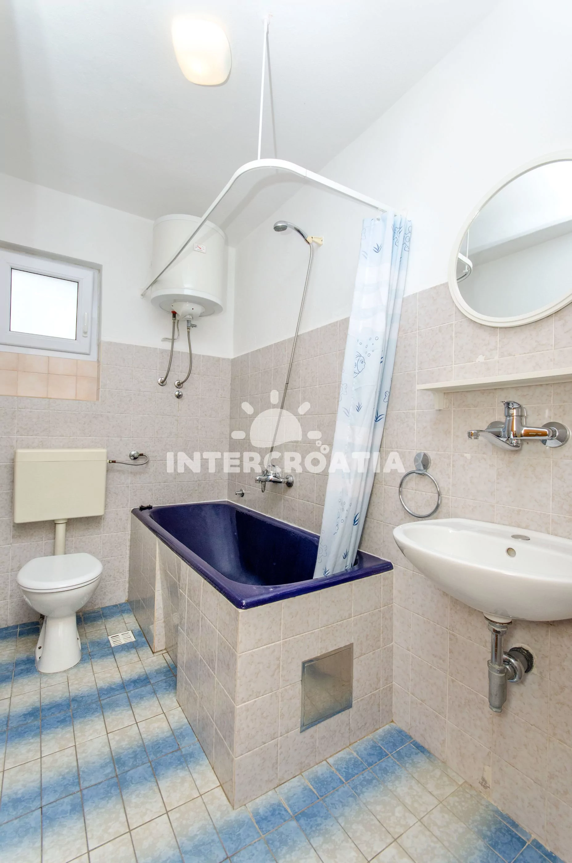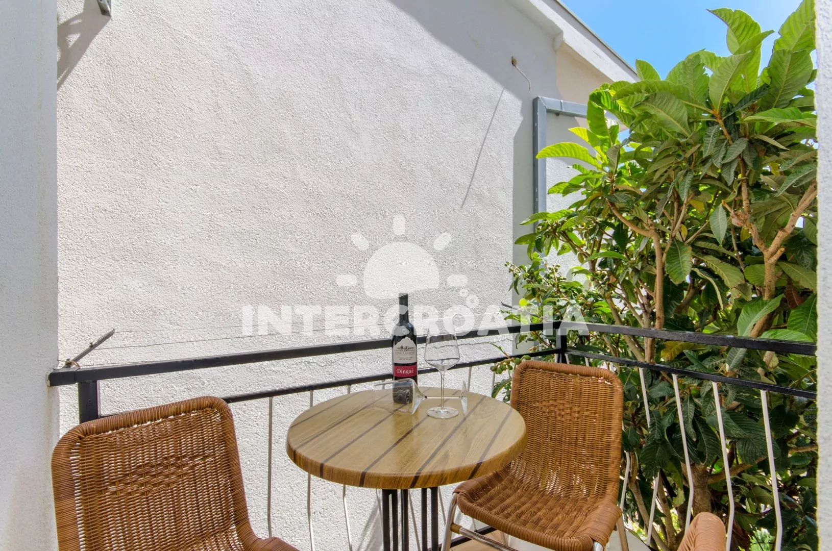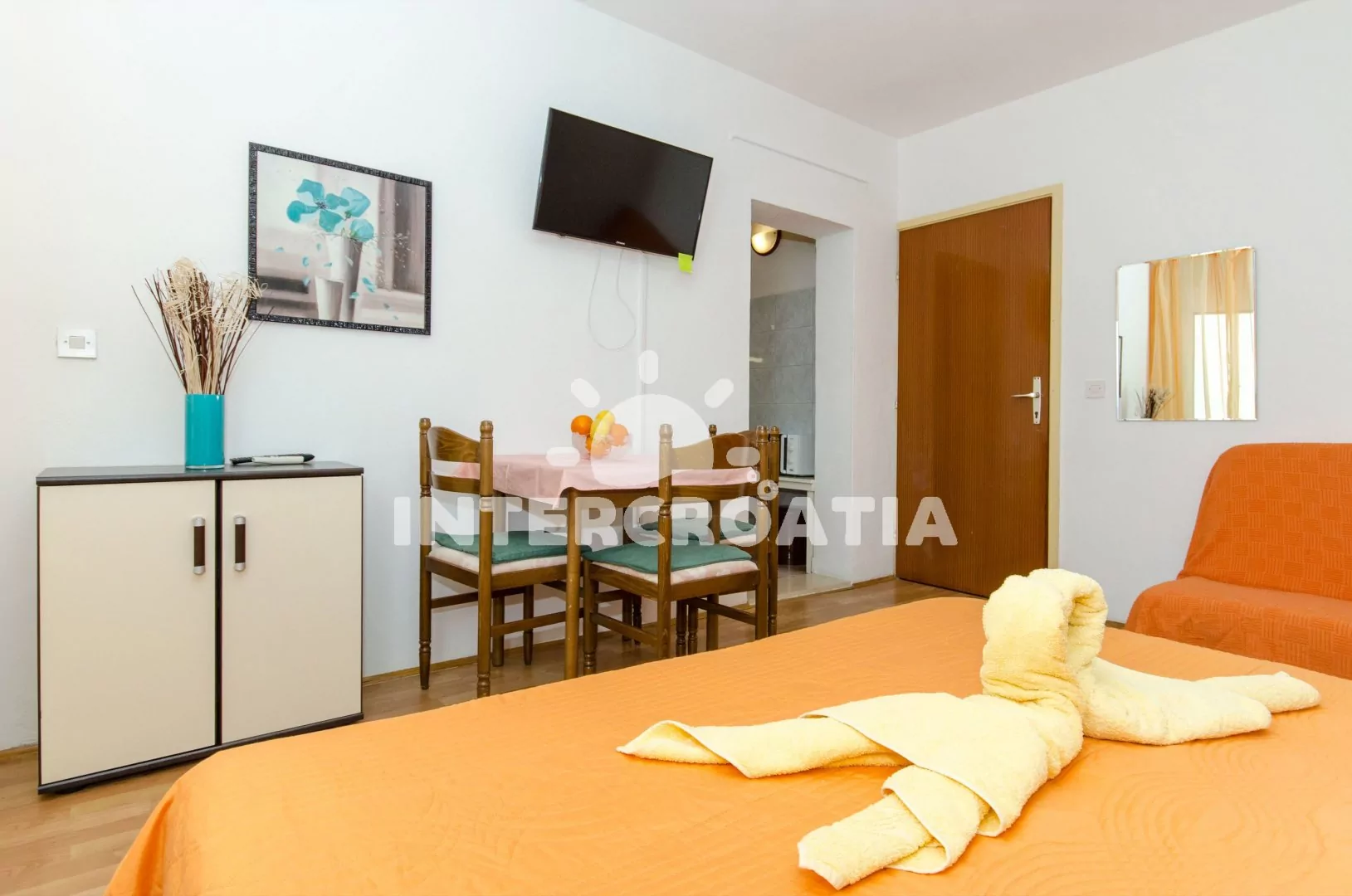 Apartmán typu studio s balkonem, výhledem na moře a klidné ulice, nachází se v druhém patře vilky. Apartmán je vhodný pro 2 až 3 osoby. Kuchyňská linka je vybavena dvouplotýnkovým sporákem, mikrovlnnou troubou, rychlovarnou konvicí, nádobím a lednicí s mrazákem. Obývací pokoj s jídelním stolem pro 3 osoby, televizí se satelitním programem, jedním dvoulůžkem, pohovkou (rozložitelná na extra lůžko pro 1 osobu), klimatizací a vstupem na balkon. Koupelna s vanou, sprchovou zástěnou, umyvadlem a wc. Hostům je k dispozici parkování u objektu zdarma.