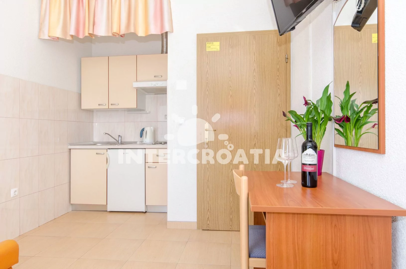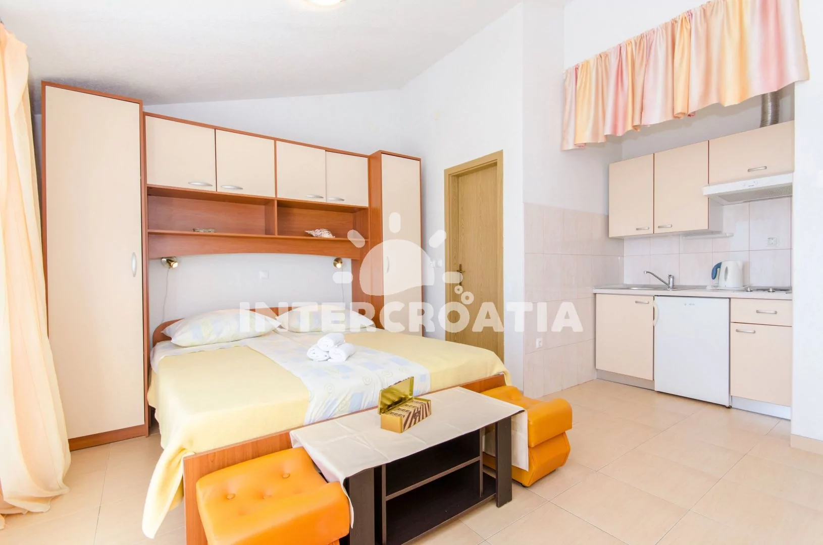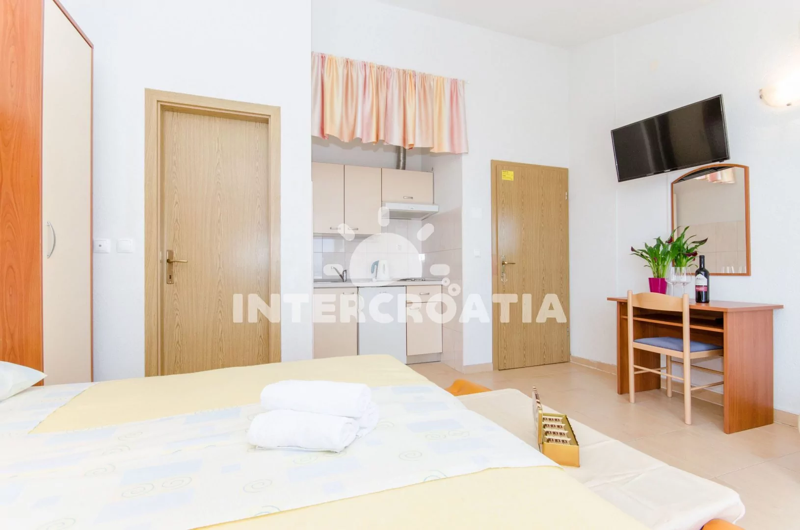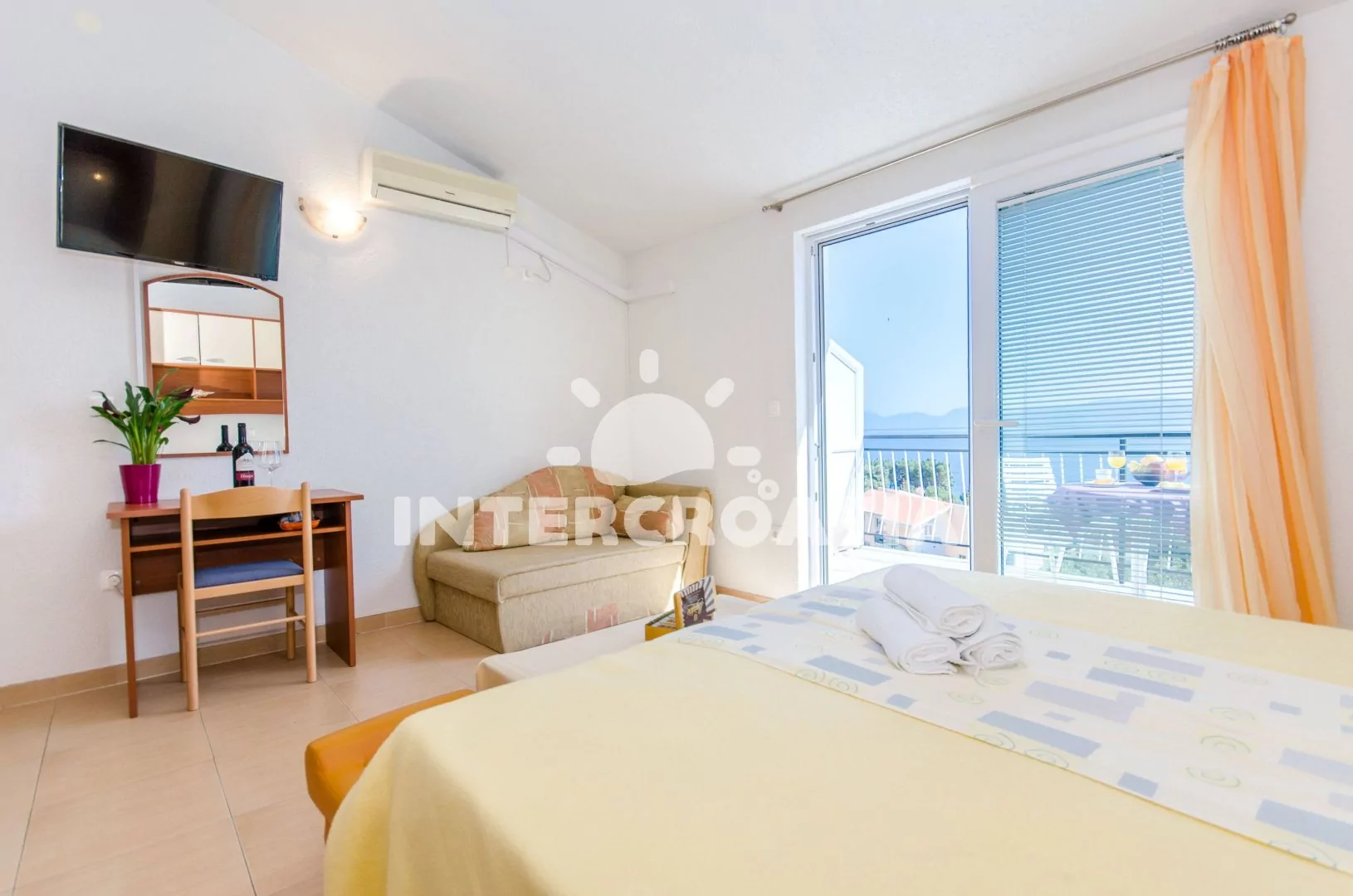 Apartmán (35 m2) typu studio s terasou a výhledem na moře se nachází ve 3. patře domu. Apartmán je vhodný pro 2 až 3 osoby. Obývací místnost je spojena s kuchyní. Kuchyňská linka je vybavena dvouplotýnkovým vařičem, digestoří, rychlovarnou konvicí, nádobím a lednicí s mrazákem, (na požádání mikrovlnná trouba). Obývací místnost s pohovkou (rozložitelná na extra lůžko pro 1 osobu), televizí se satelitním programem, dvoulůžkem, klimatizací a vstupem na terasu. Koupelna se sprchovým koutem, umyvadlem a wc. Hostům je k dispozici parkování u objektu zdarma.