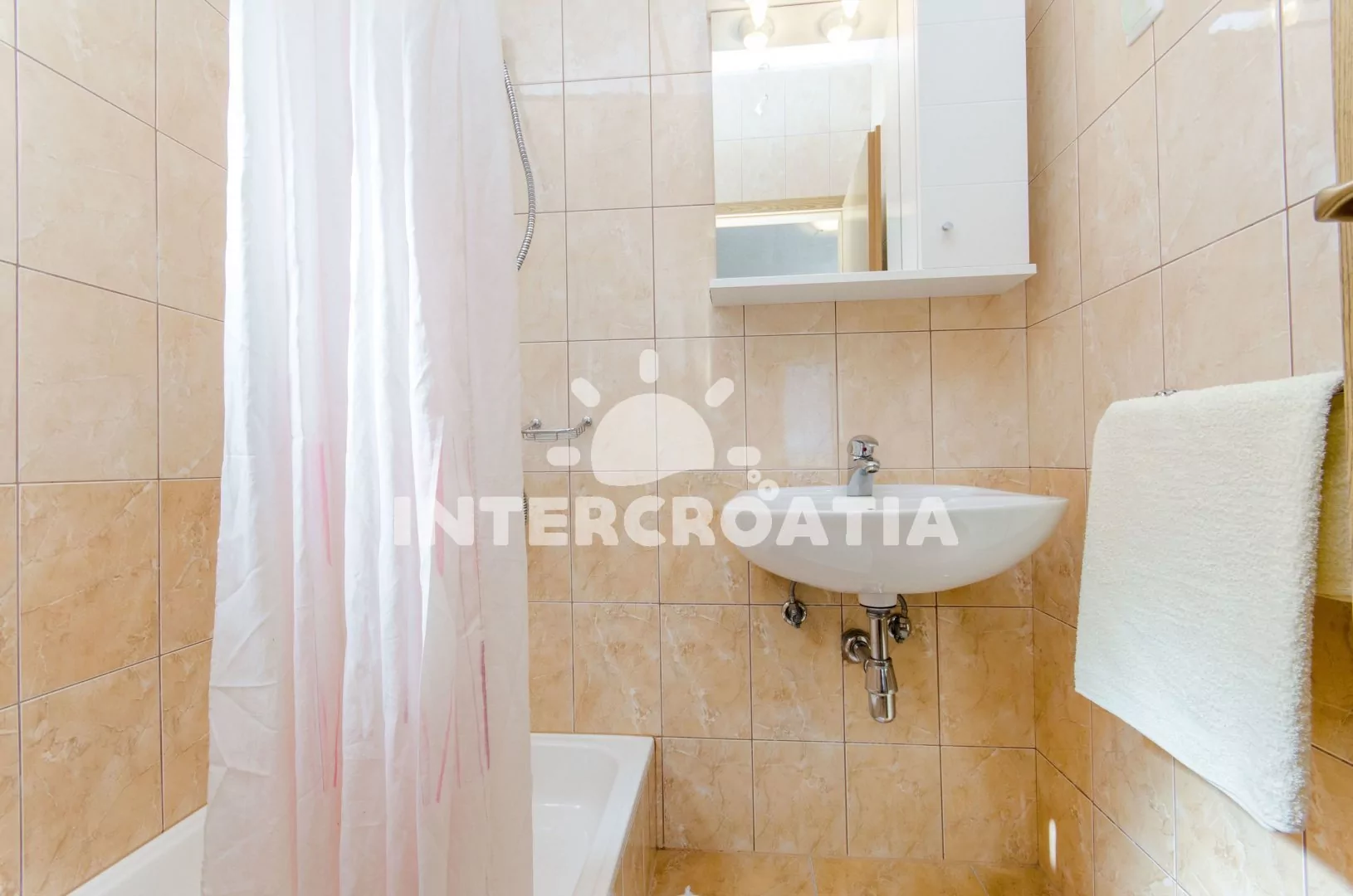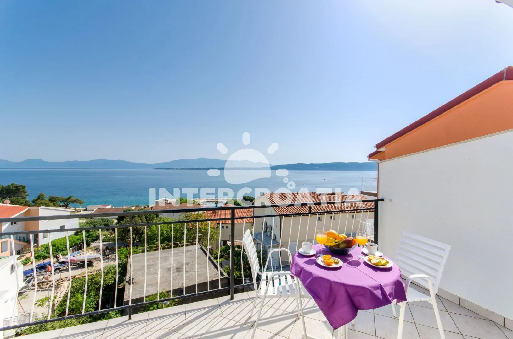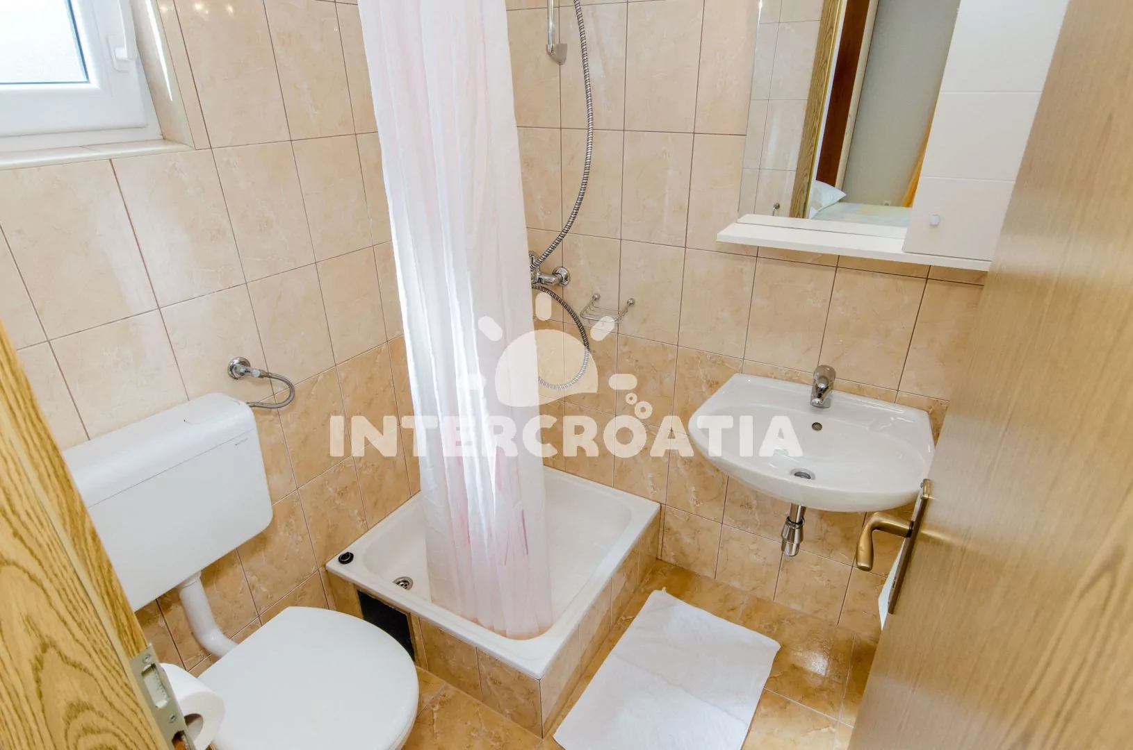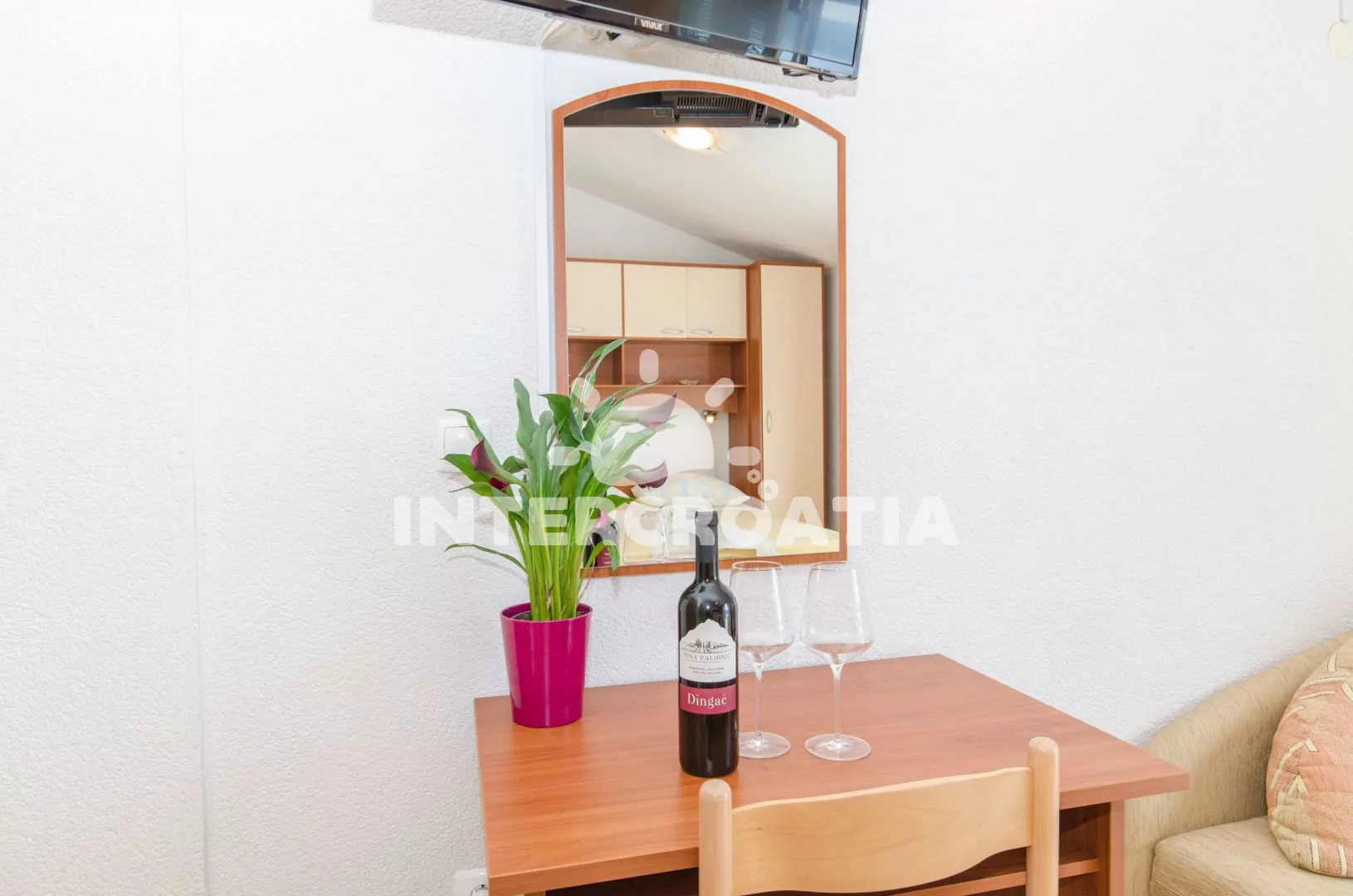 Apartmán (35 m2) typu studio s terasou a výhledem na moře se nachází ve 3. patře domu. Apartmán je vhodný pro 2 až 3 osoby. Obývací místnost je spojena s kuchyní. Kuchyňská linka je vybavena dvouplotýnkovým vařičem, digestoří, rychlovarnou konvicí, nádobím a lednicí s mrazákem, (na požádání mikrovlnná trouba). Obývací místnost s pohovkou (rozložitelná na extra lůžko pro 1 osobu), televizí se satelitním programem, dvoulůžkem, klimatizací a vstupem na terasu. Koupelna se sprchovým koutem, umyvadlem a wc. Hostům je k dispozici parkování u objektu zdarma.