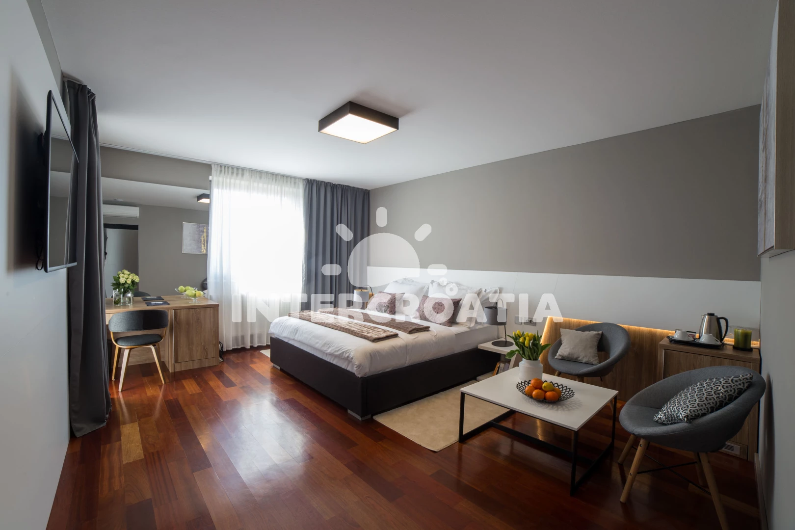 Apartmánový pokoj (2) s terasou. Nachází se v objektu. mini lednicí. K dispozici dvoulůžko, televize, sejf, žehlička. Koupelna s WC. Hostům je k dispozici parkování u objektu zdarma.