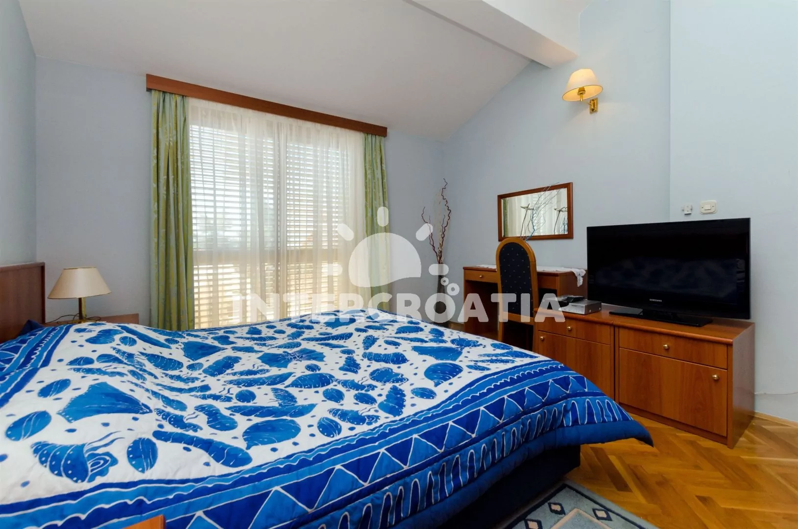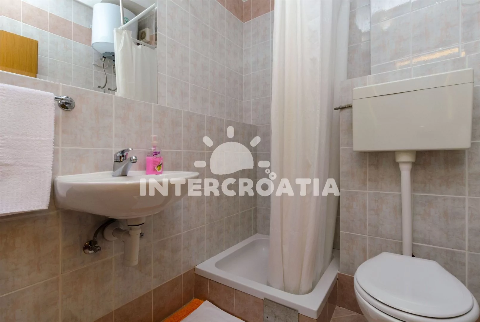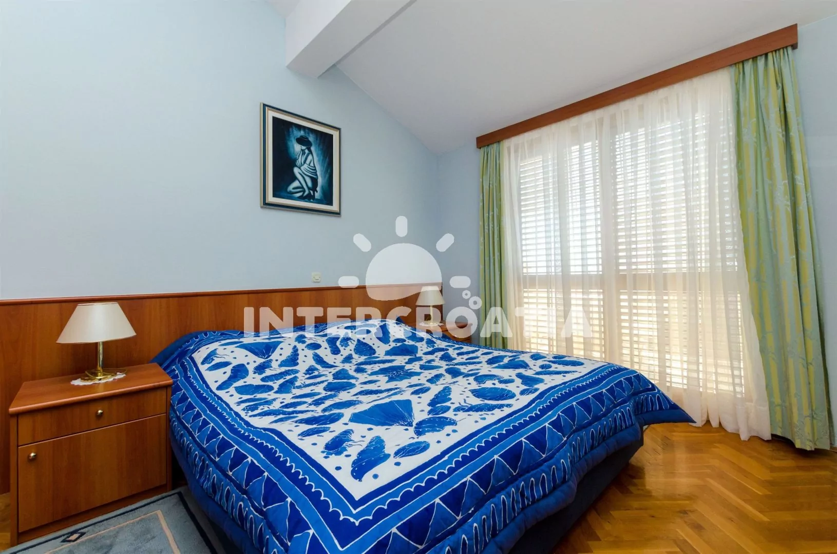 Apartmánový pokoj (18 m2) se nachází ve druhém patře domu a je vhodný pro maximálně 2 osoby. Apartmánový pokoj disponuje mini ledničkou, rádiem, klimatizací a samostatnou koupelnou se sprchou, umyvadlem a WC. Terasa s posezením a částečným výhledem na moře. Sdílená společenská místnost v přízemí s posezením a jídelními stoly. Dále k dispozici venkovní krb, sdílená sauna, sprcha a zapuštěný bazén. Parkování u objektu.
