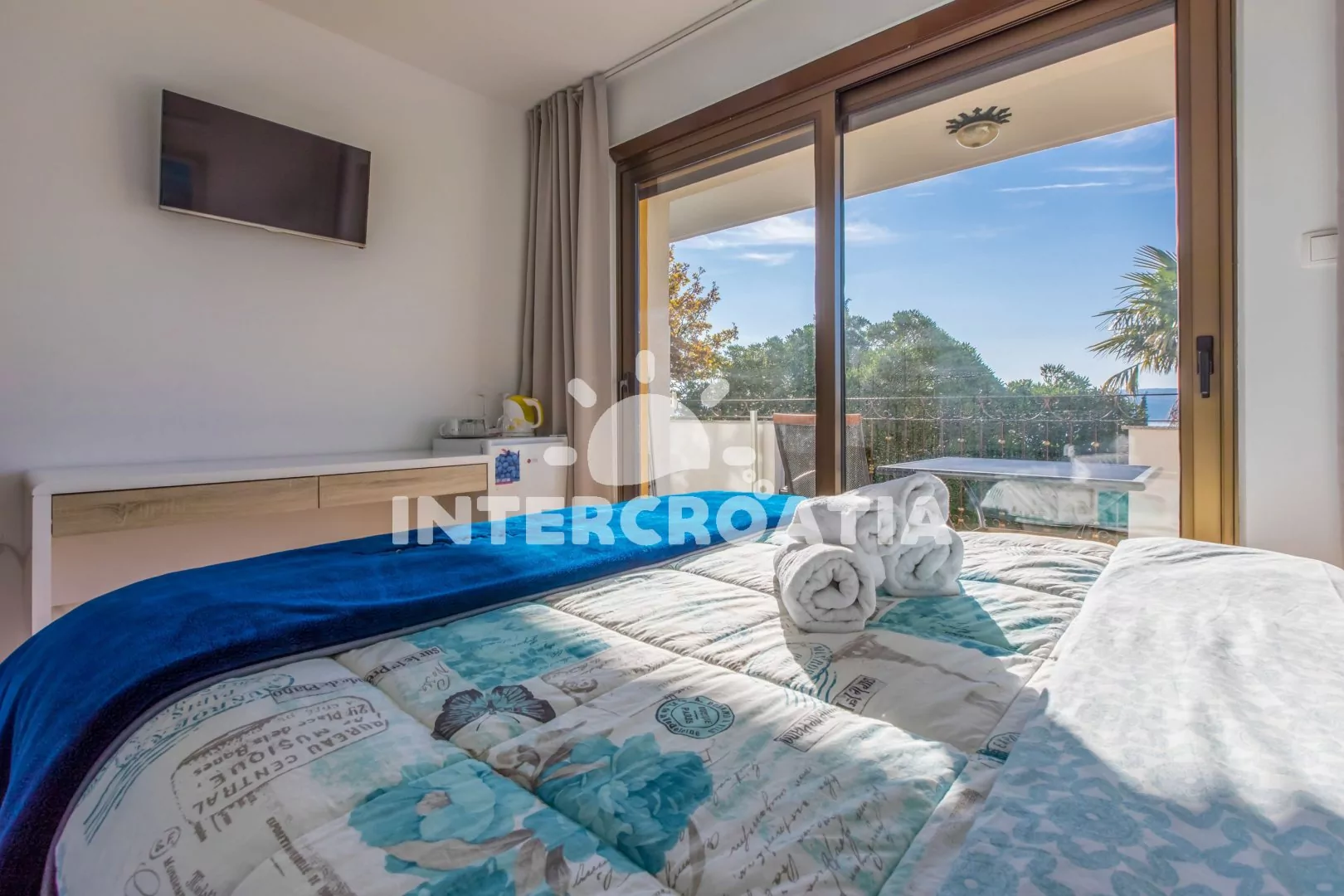 Apartmánový pokoj (20 m2) s terasou a výhledem na moře se nachází v 1. patře domu a je vhodný pro 2 osoby. Pokoj je vybavený jedním dvoulůžkem, televizí se satelitním programem, , rychlovarnou konvicí, malou chladničkou, klimatizací a vstupem na terasu. Koupelna se sprchovým koutem, umyvadlem, fénem a wc. Hostům je k dispozici parkování u objektu zdarma.