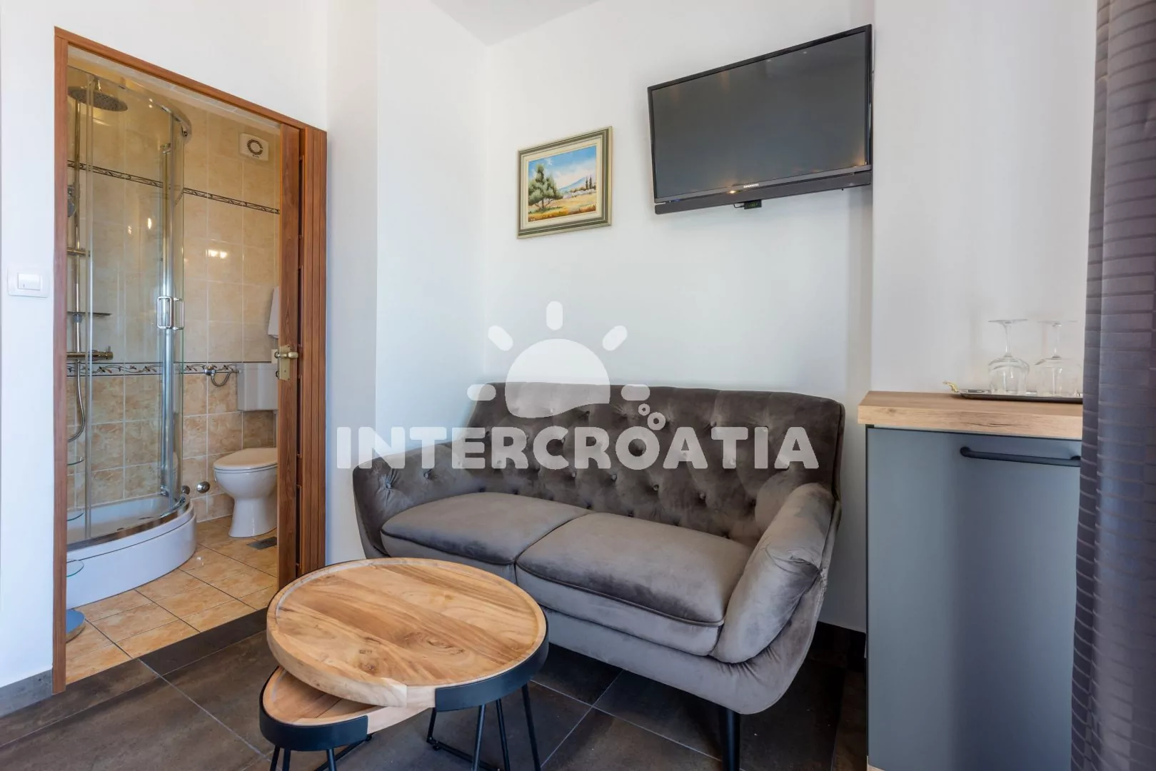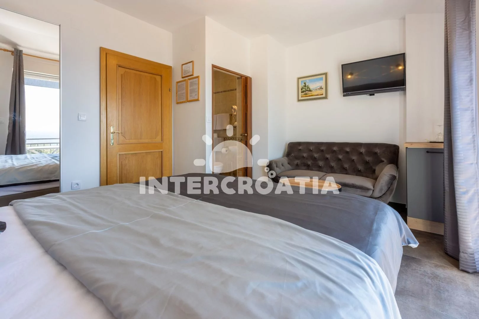 Apartmánový pokoj (16 m2) s výhledem na moře a balkonem se nachází v 2. patře domu a je vhodný pro 2 osoby. Pokoj je vybavený jedním dvoulůžkem, televizí se satelitním programem, klimatizací a vstupem na balkon. Koupelna se sprchovým koutem, umyvadlem, fénem a wc. Hostům je k dispozici parkování u objektu zdarma.