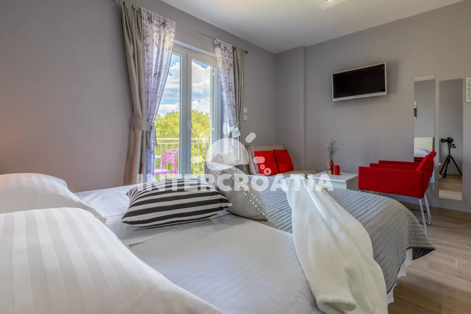 Pokoj (20 m2) s balkonem a výhledem na moře se nachází v 1. patře vily a je vhodný pro 2 osoby. Pokoj je vybavený jedním dvoulůžkem, sedací soupravou s pohovkou, televizí se satelitním programem, malou chladničkou, klimatizací a vstupem na balkon. Koupelna se sprchovým koutem, umyvadlem a wc. Hostům je k dispozici parkování u objektu zdarma.