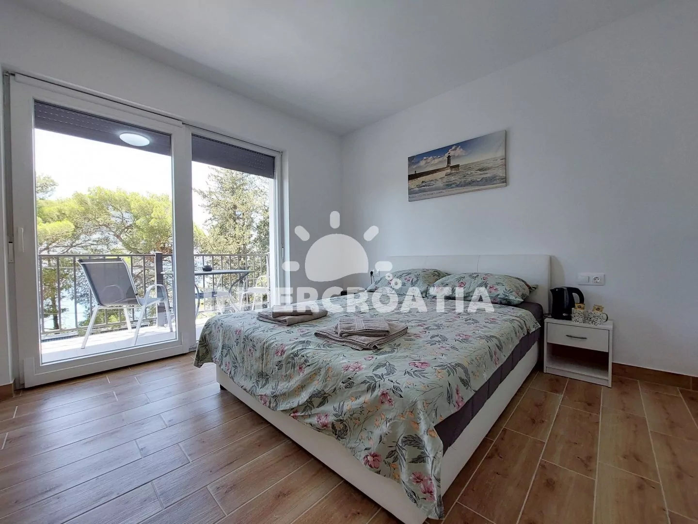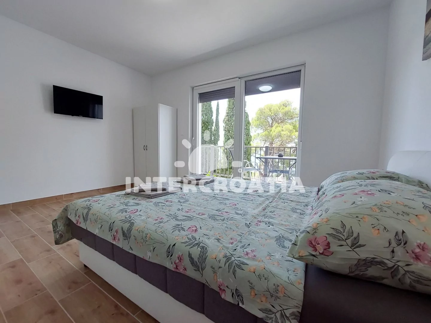 Pokoj (25 m2) s balkonem, posezením a výhledem na moře se nachází v 1. patře domu. Pokoj je vybavený dvoulůžkem, televizí, klimatizací, rychlovarnou konvicí, malou chladničkou a vstupem na balkon. Koupelna se sprchovým koutem, umyvadlem a wc. Hostům je k dispozici parkování (50-150 m) u objektu zdarma.