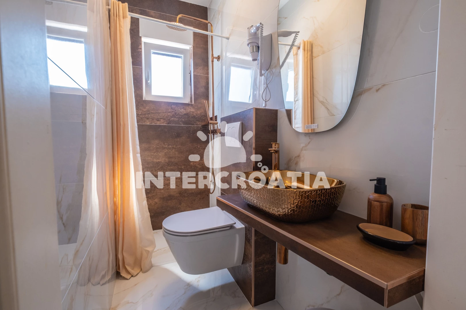 Vzdálenosti: Moře 800 m, pláž 800 m (písčitá, skalnatá, oblázková, větší kamení a betonové desky), centrum 150 m, supermarket 150 m, směnárna 150 m, banka 150 m, bar 150 m, restaurace 150 m, lékárna 200 m, veřejná doprava 350 m, čerpací stanice 350 m, pošta 350 m, marina 600 m, ambulance 800 m, letiště (Rijeka) 35 km,
