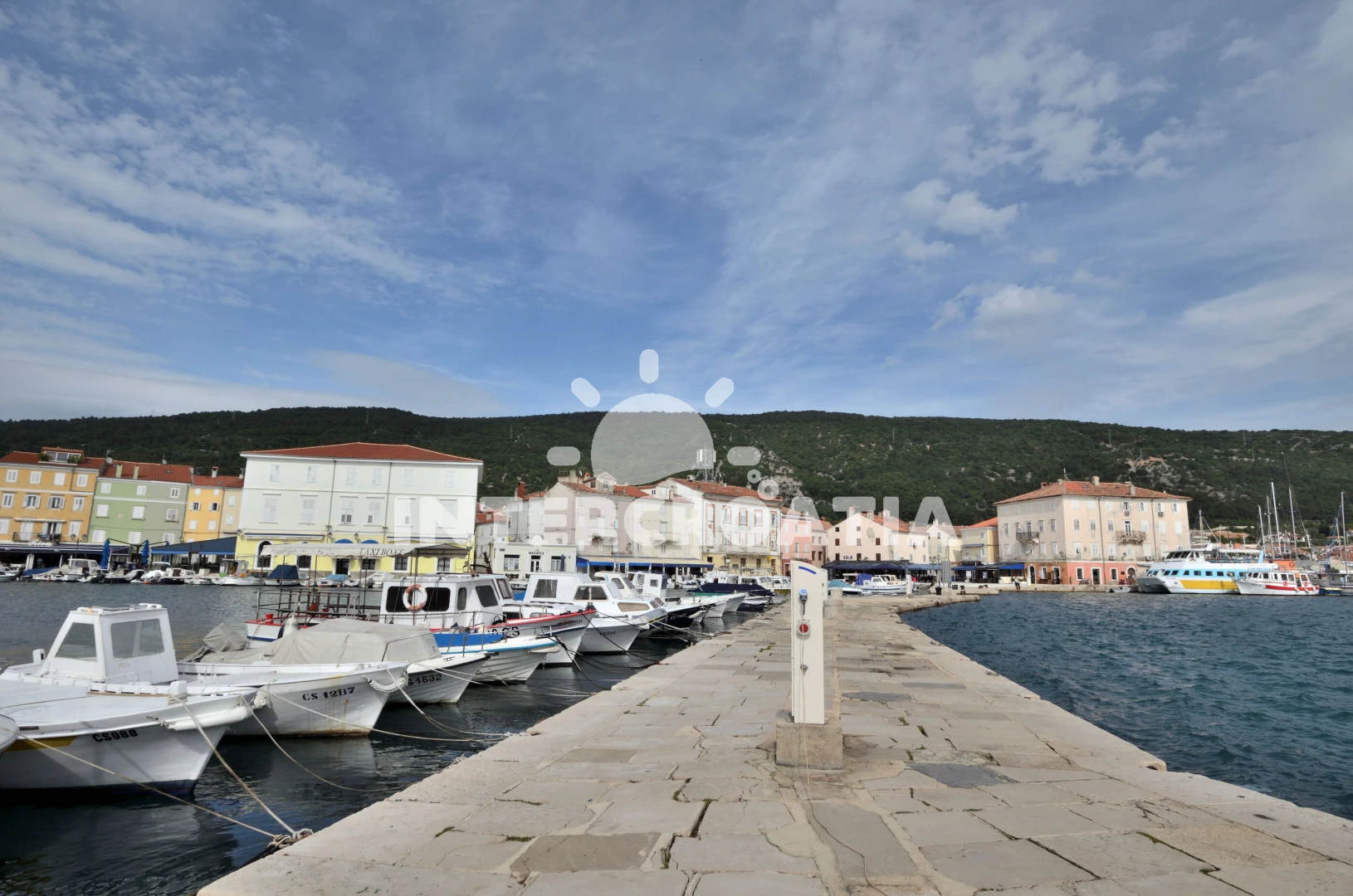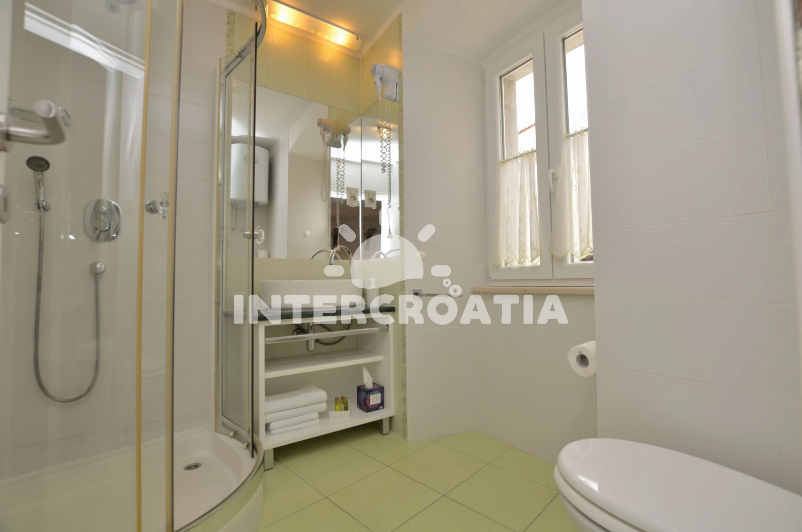 Vzdálenosti: Moře 70 m, pláž 300 m (oblázková a betonové desky), centrum 5 m, supermarket 20 m, restaurace 50 m, bar 50 m, půjčovna kol 100 m, diskotéka 100 m, muzeum 100 m, pošta 100 m, veřejná doprava 150 m, lékárna 150 m, směnárna 150 m, čerpací stanice 150 m, banka 150 m, mini golf 300 m, tenisové kurty 300 m, ambulance 300 m, potápění 500 m, marina 1 km, trajekt (Merag) 12 km, letiště (Rijeka) 25 km,