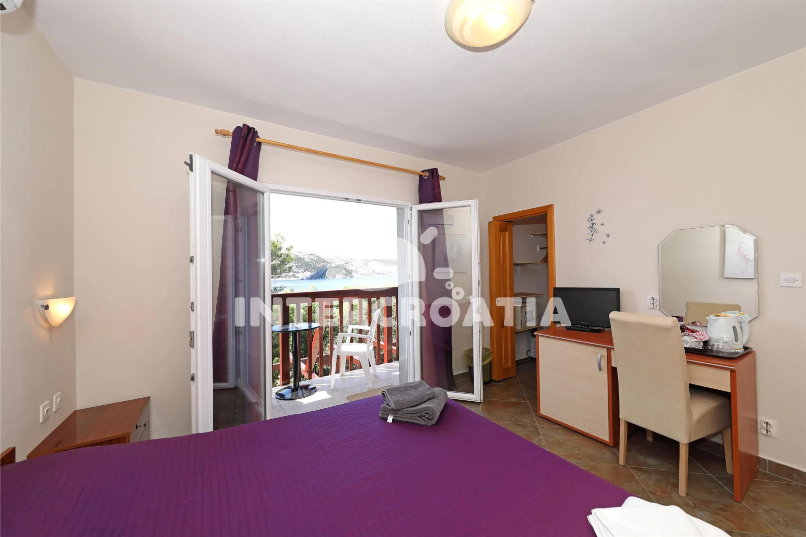 Apartmánový pokoj (22 m2) s balkonem, a výhledem na moře. Nachází se v 1. patře objektu. varnou deskou, rychlovarnou konvicí, mini lednicí. K dispozici dvoulůžko, televize, sejf, žehlička. Koupelna s WC.
