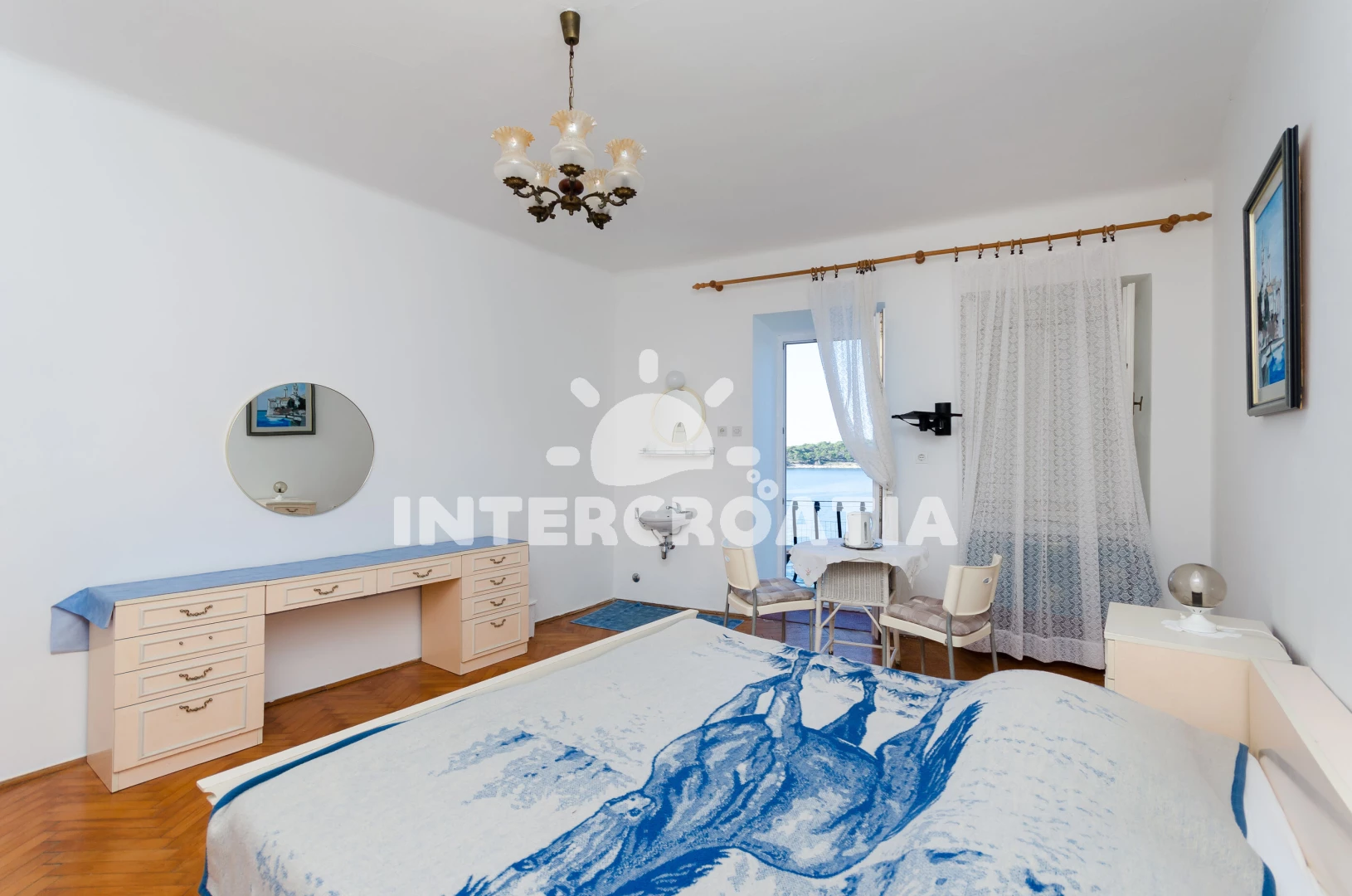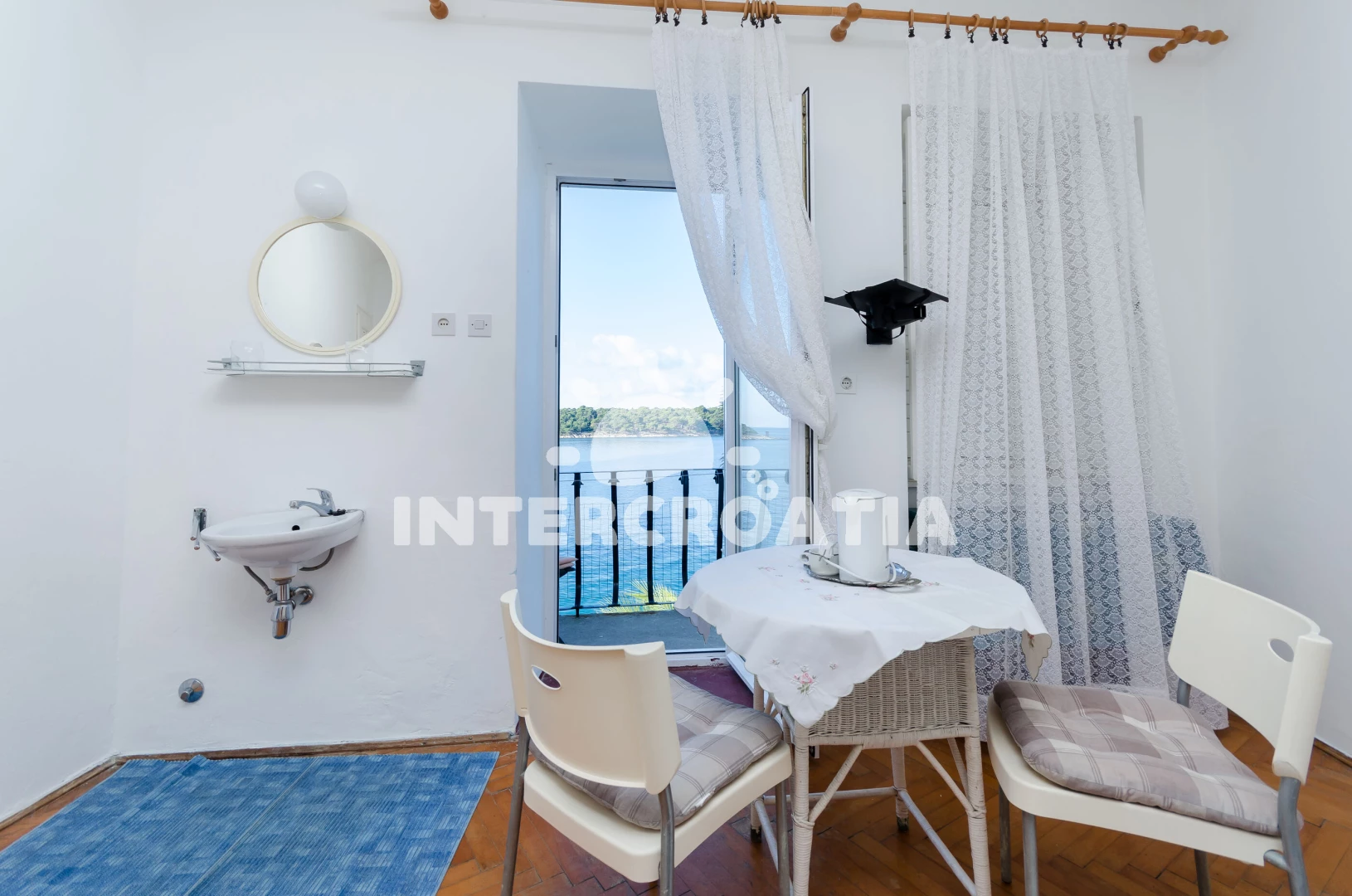 Apartmánový pokoj (25 m2) s balkonem, a výhledem na moře. Nachází se v 1. patře objektu. rychlovarnou konvicí. K dispozici dvoulůžko, televize. Koupelna s WC. Hostům je k dispozici parkování u objektu zdarma.